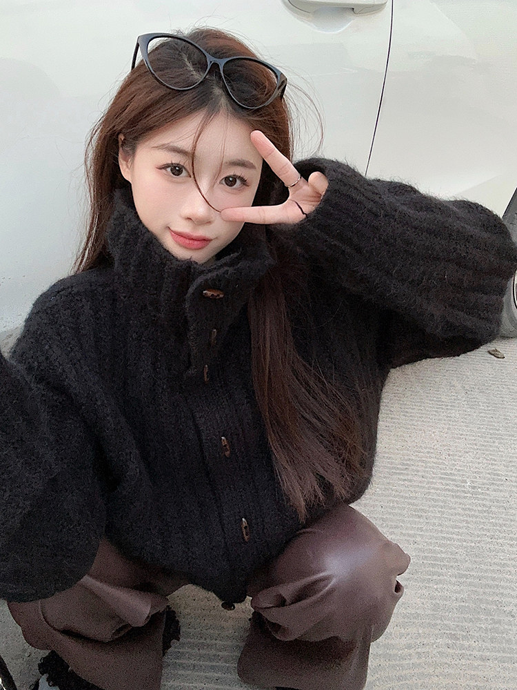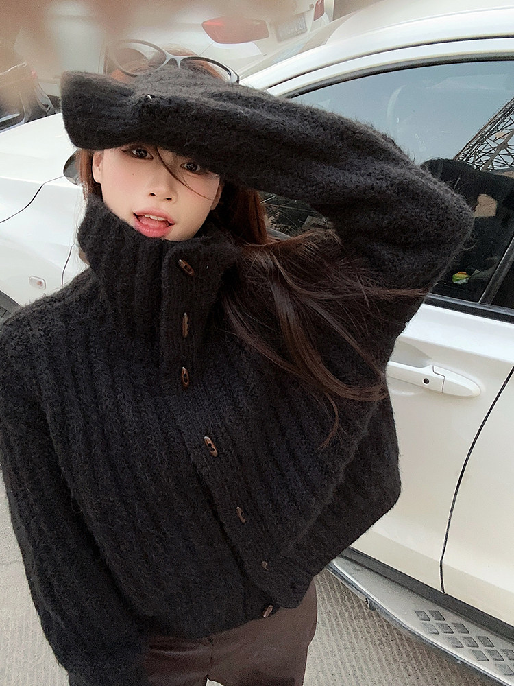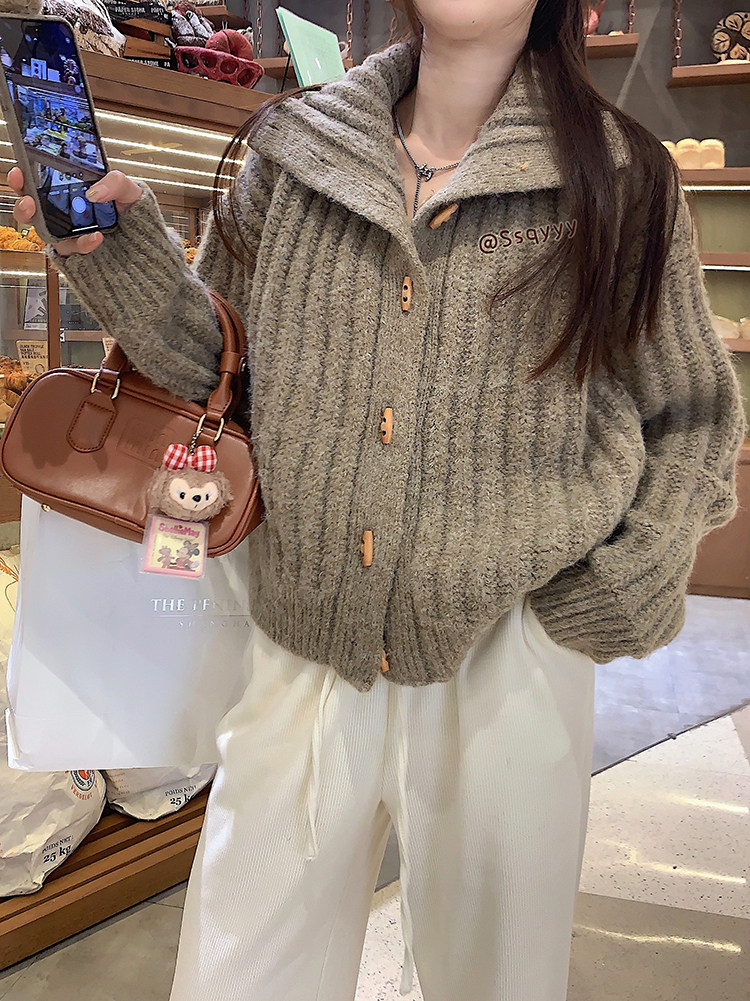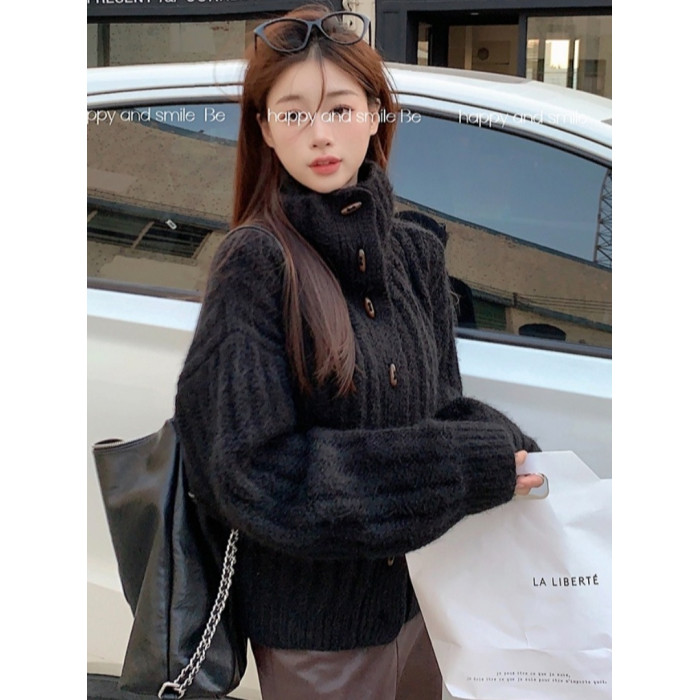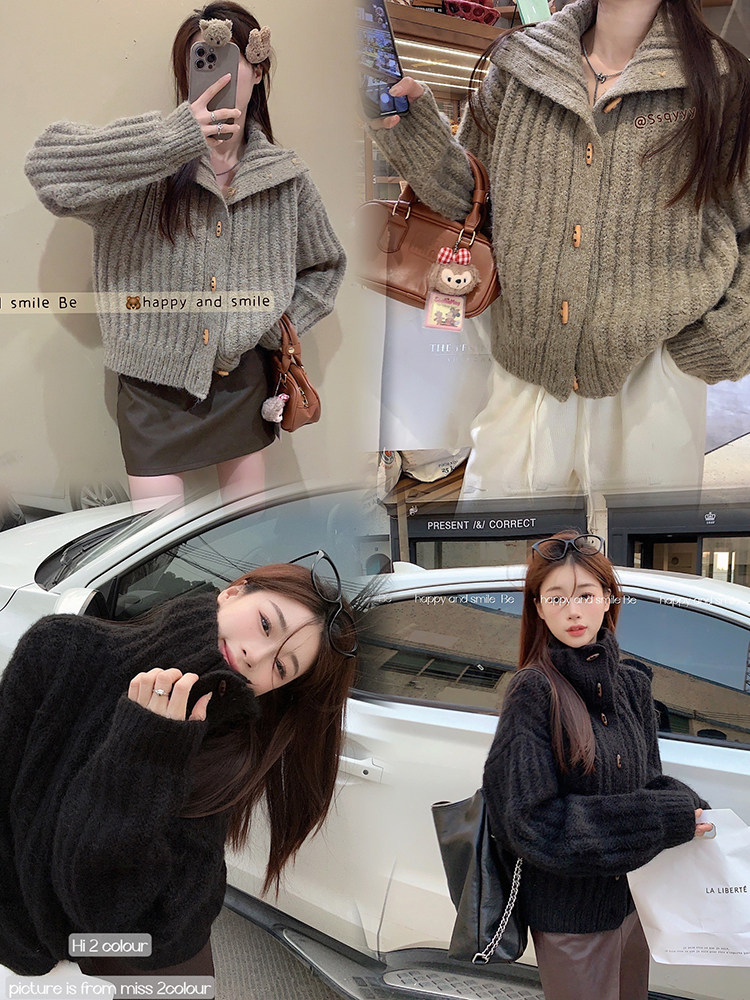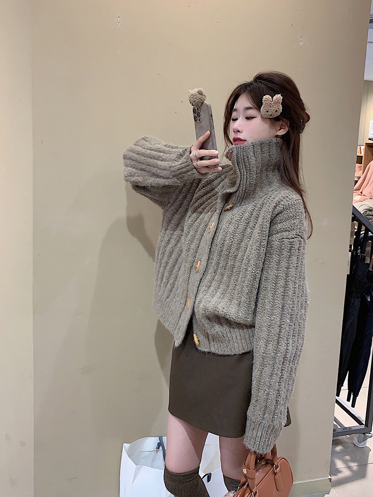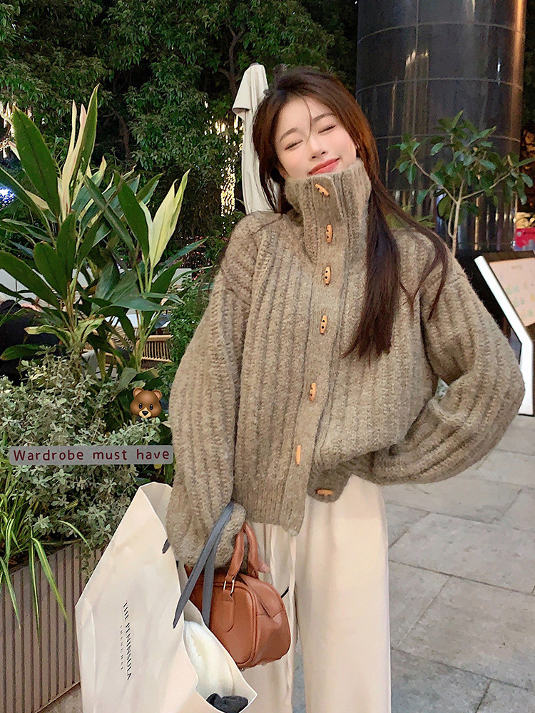復古牛角釦軟糯坑條高領毛衣外套女早秋季加厚寬鬆慵嬾風針織開衫