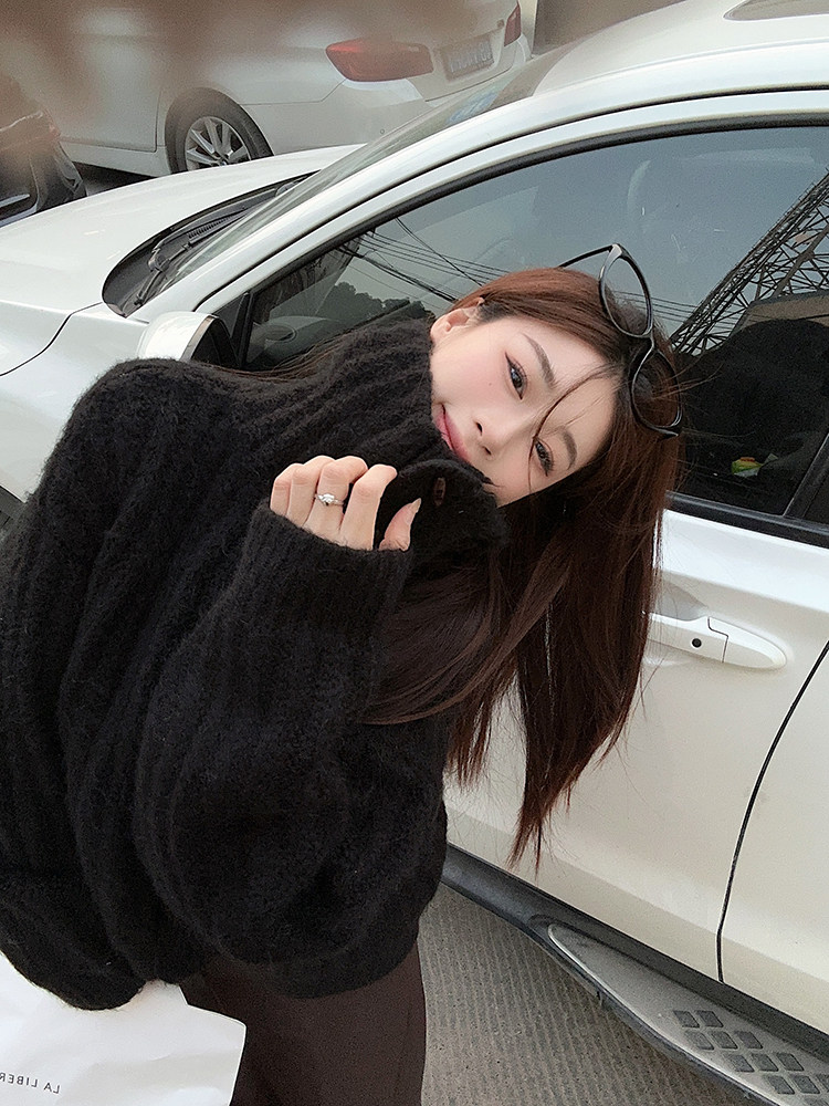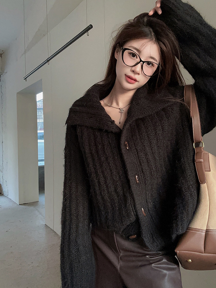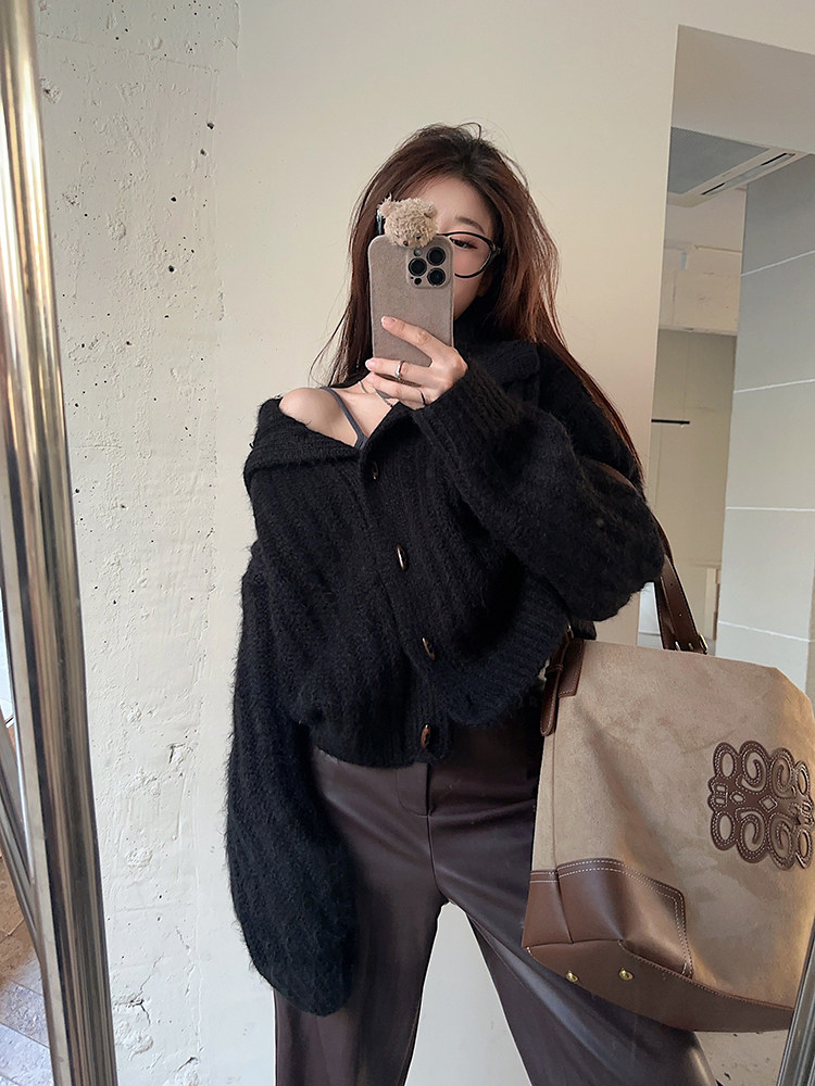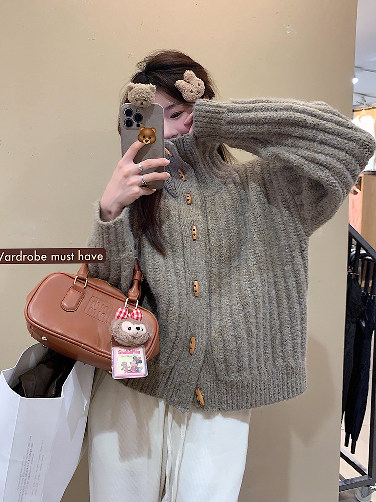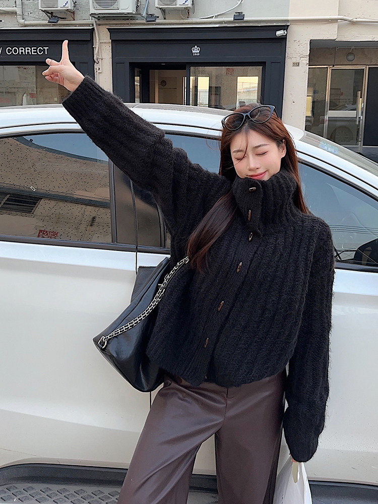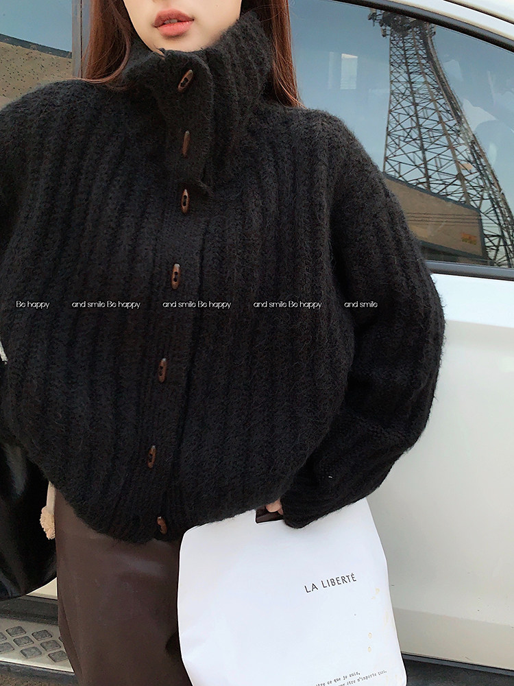復古牛角釦軟糯坑條高領毛衣外套女早秋季加厚寬鬆慵嬾風針織開衫