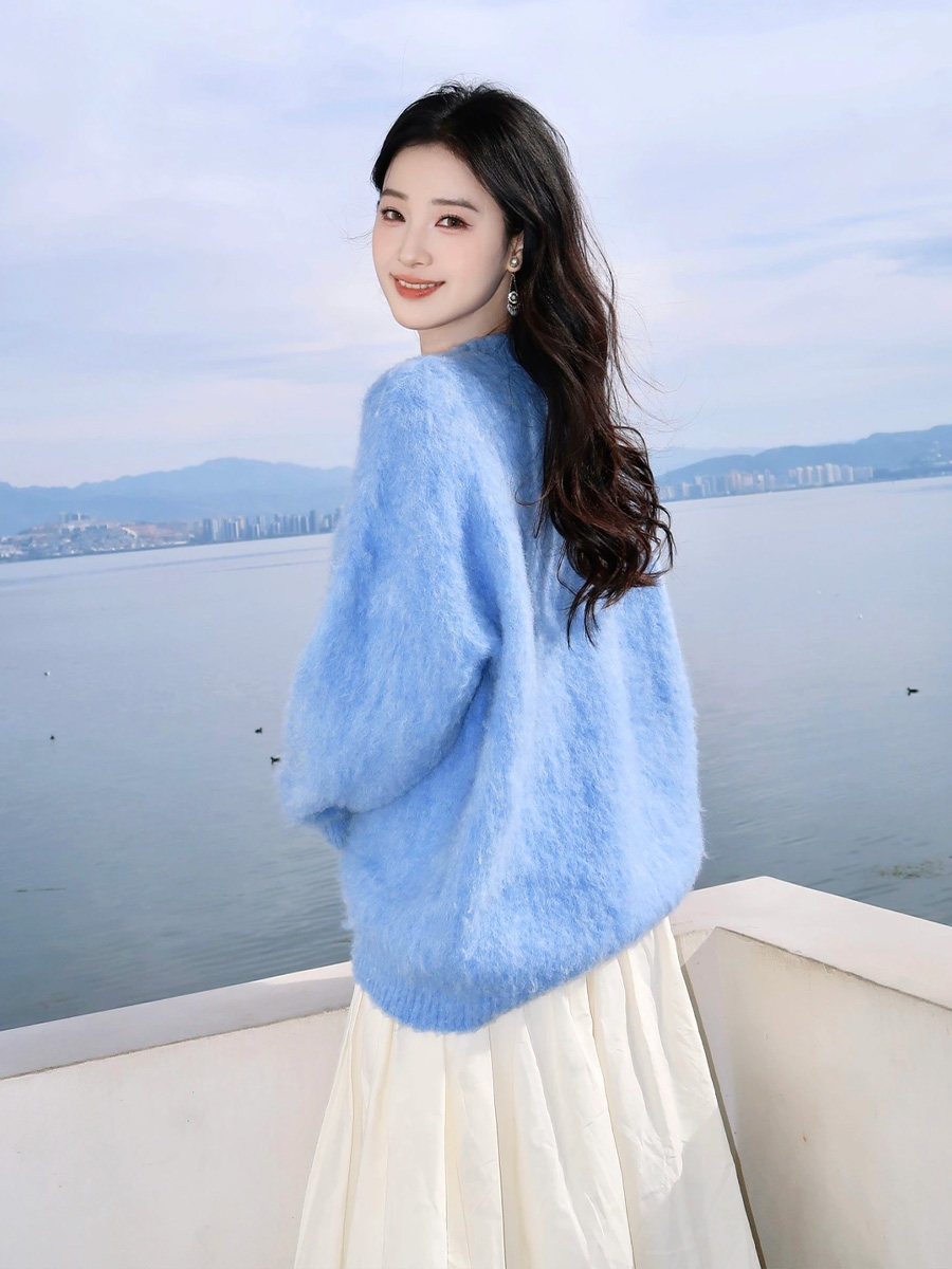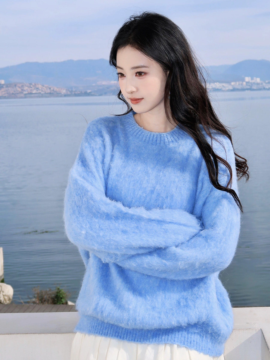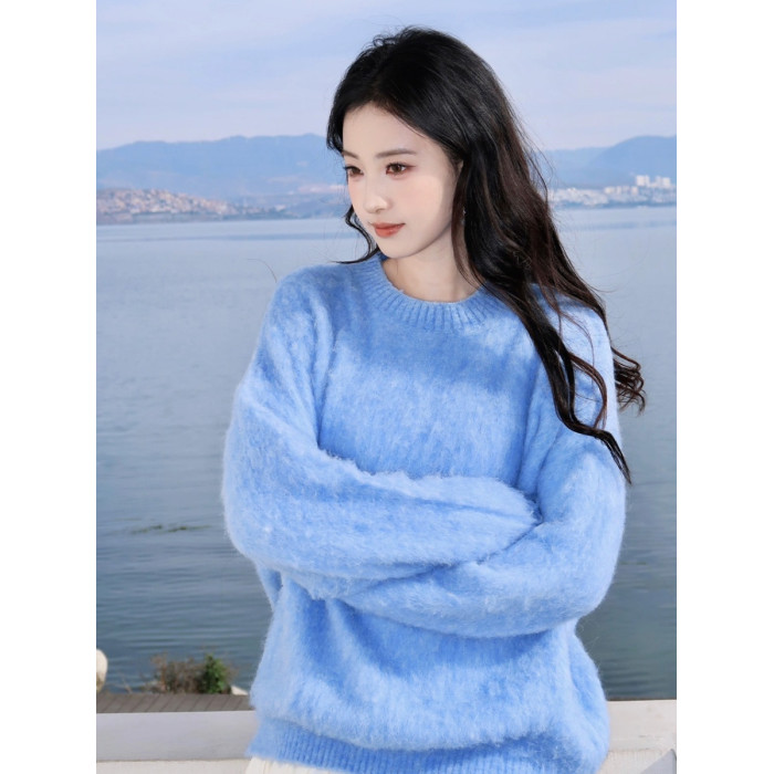 克萊因藍水貂絨套頭毛衣女冬季高級感超好看軟糯寬鬆慵嬾風針織衫