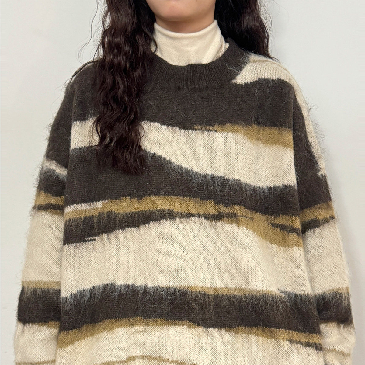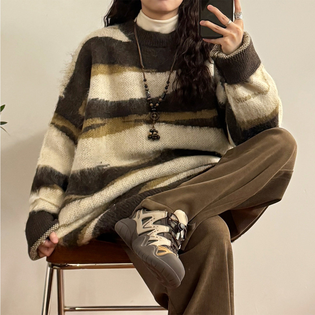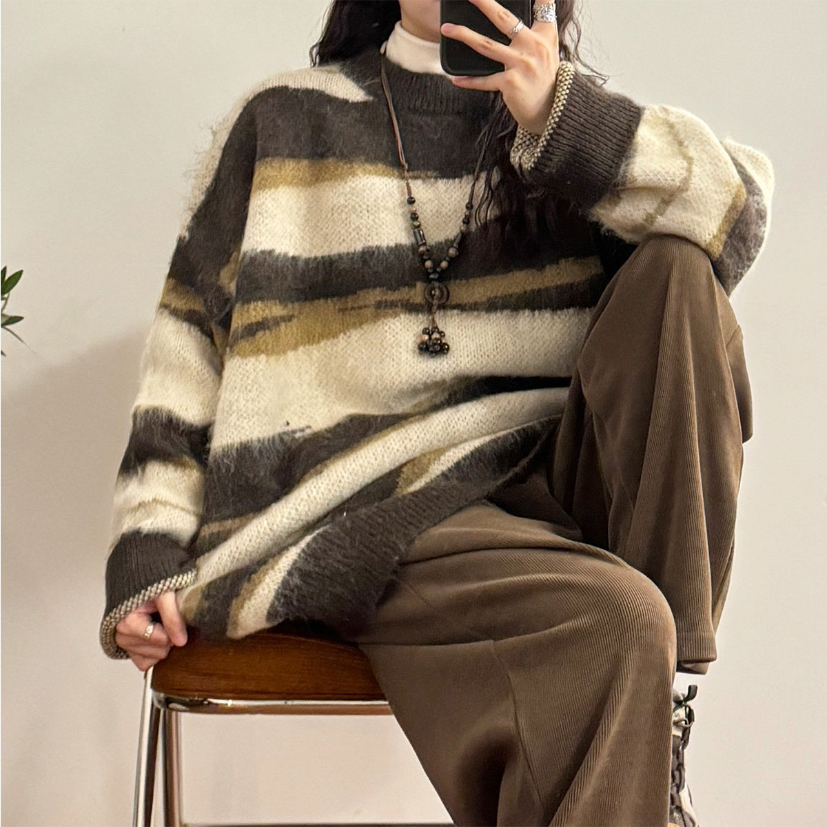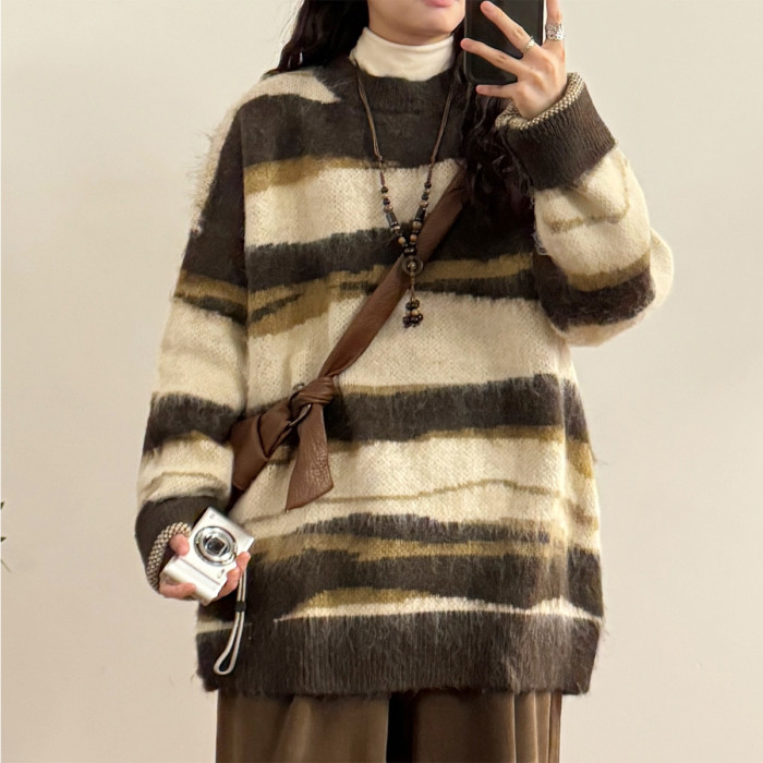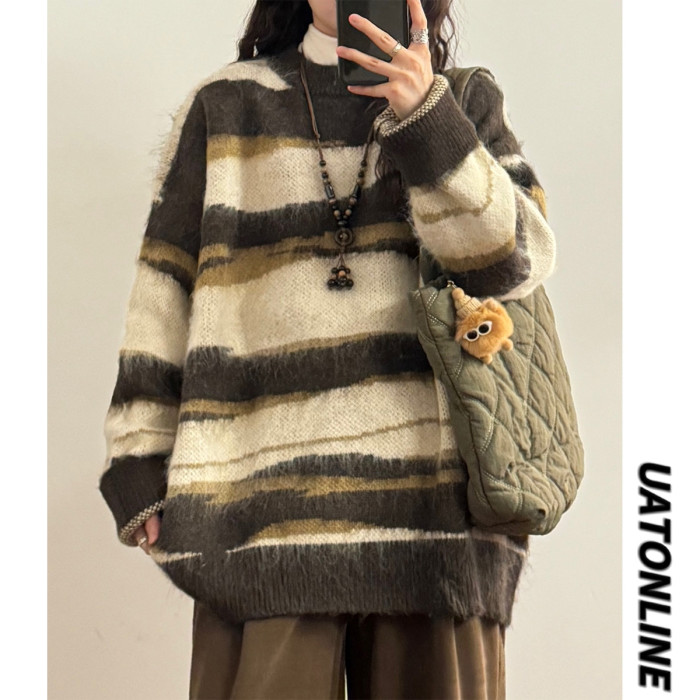 UATONLINE冬季美式復古慵嬾風寬鬆馬海毛條紋圓領毛衣針織衫女潮