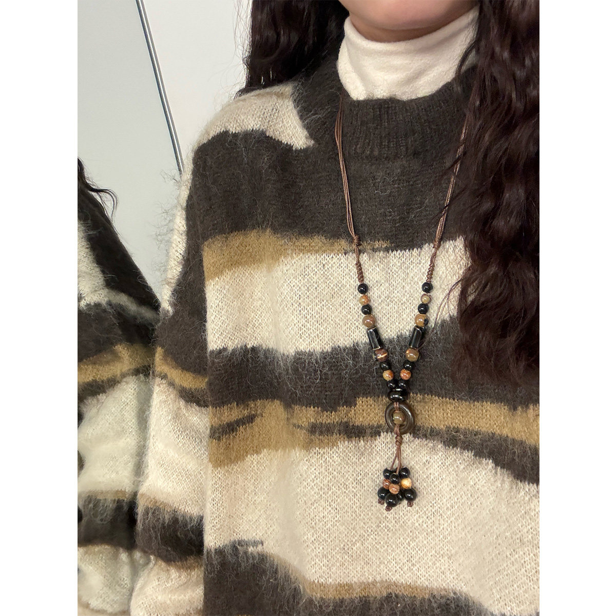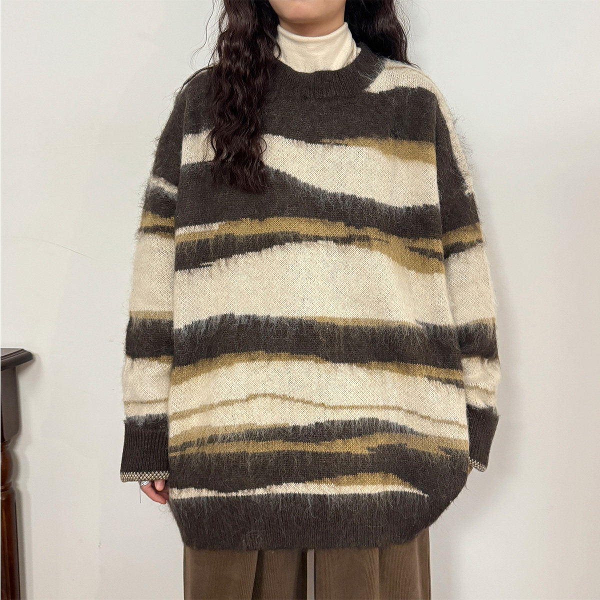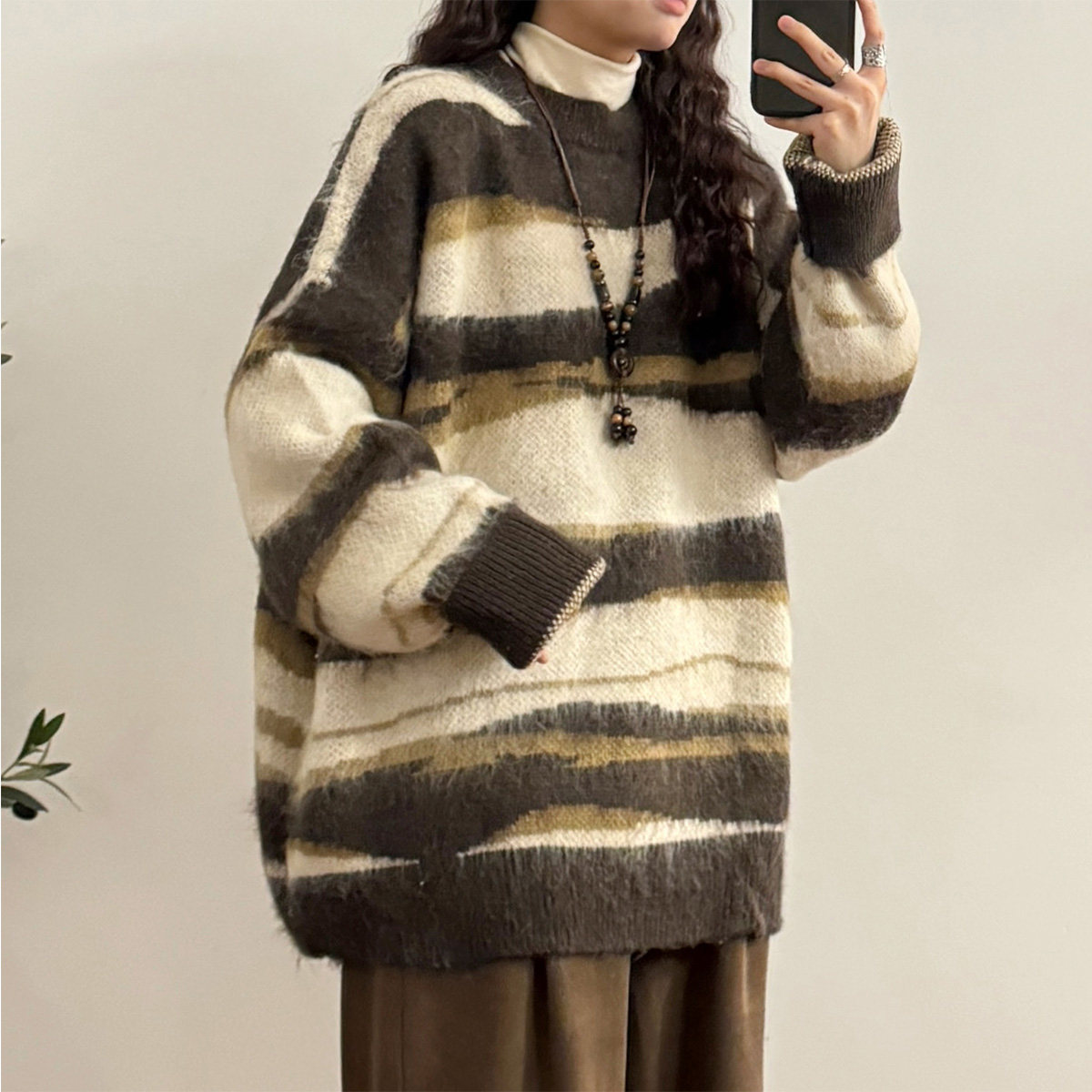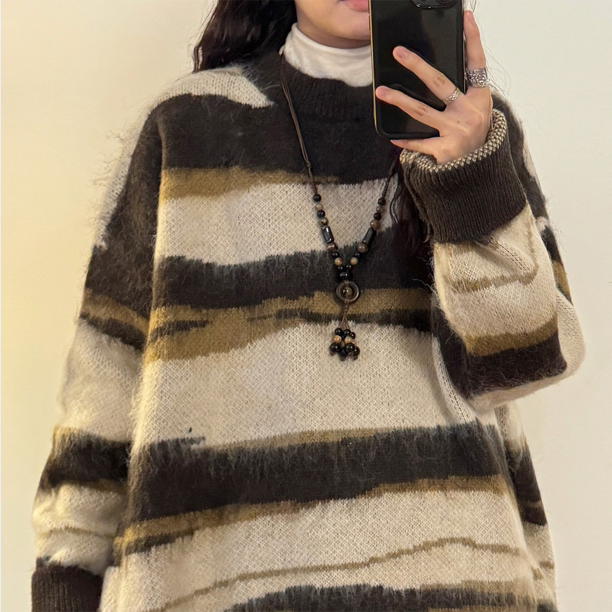 UATONLINE冬季美式復古慵嬾風寬鬆馬海毛條紋圓領毛衣針織衫女潮