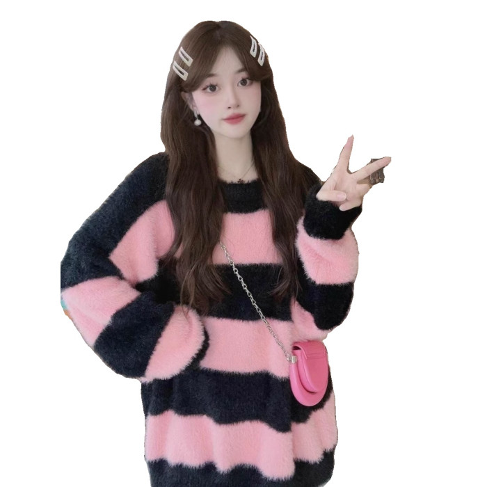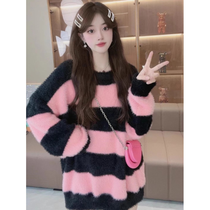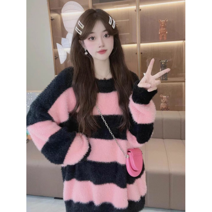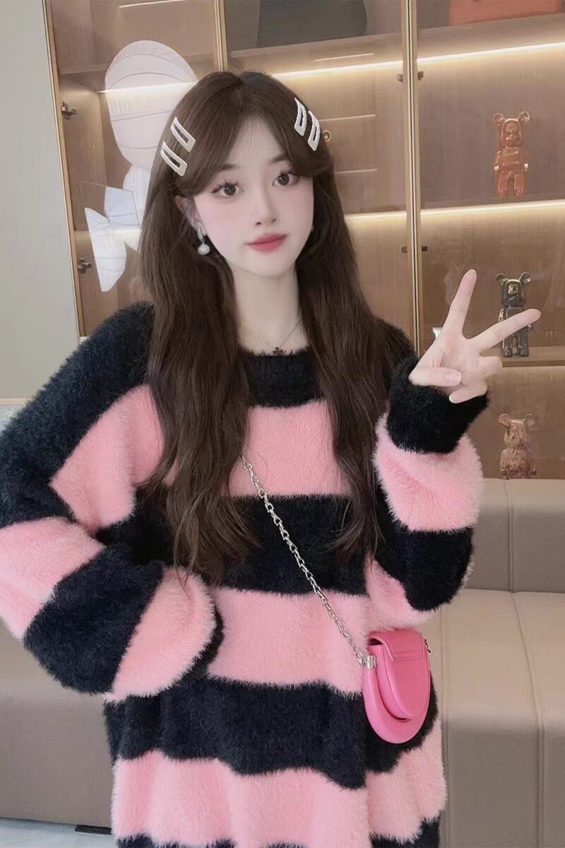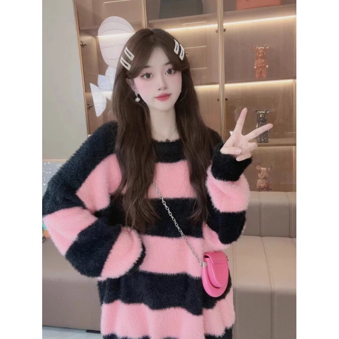 條紋設計感水貂絨毛衣女秋冬ins韓系小衆慵懶風毛茸茸針織衫上衣