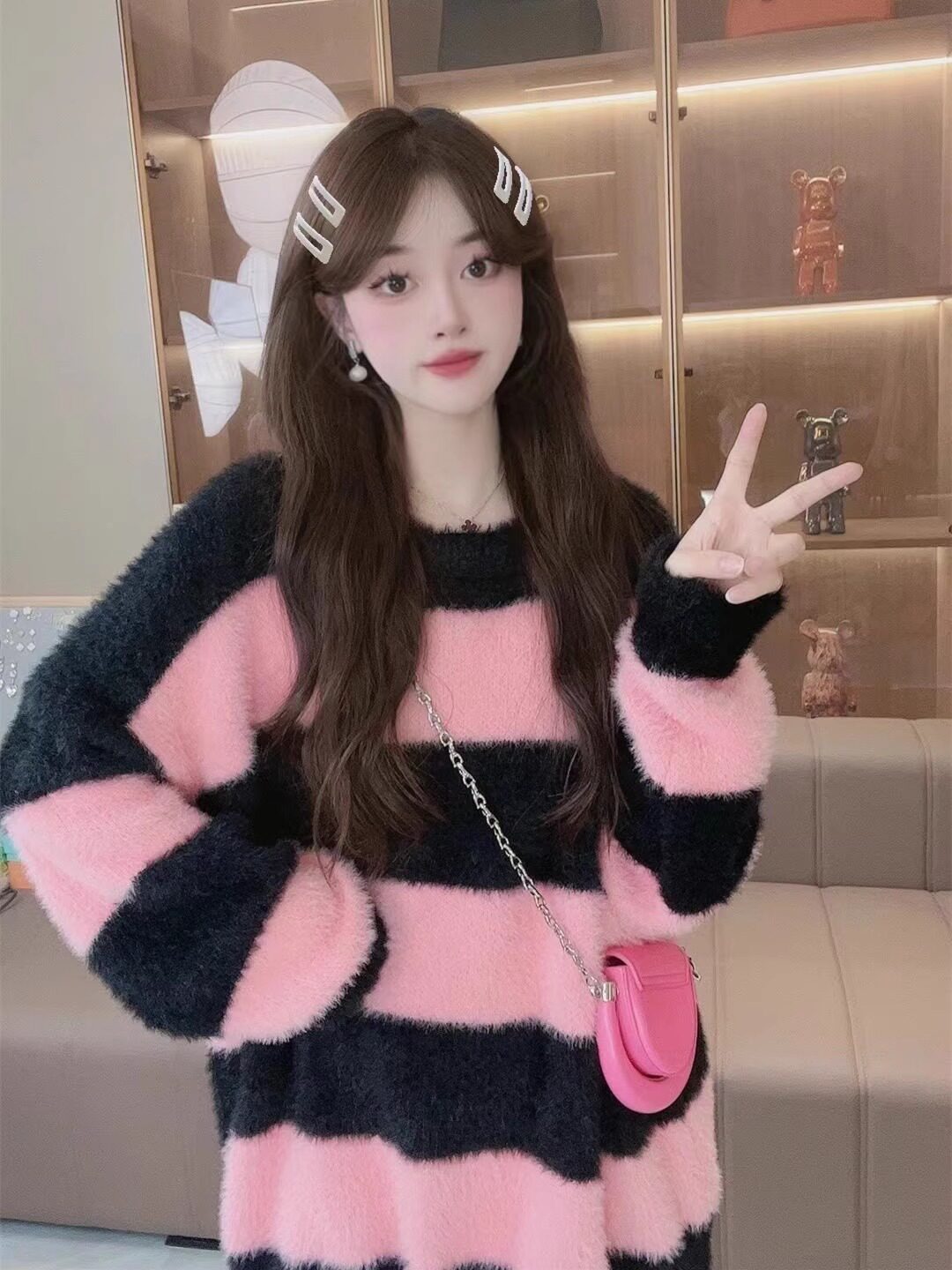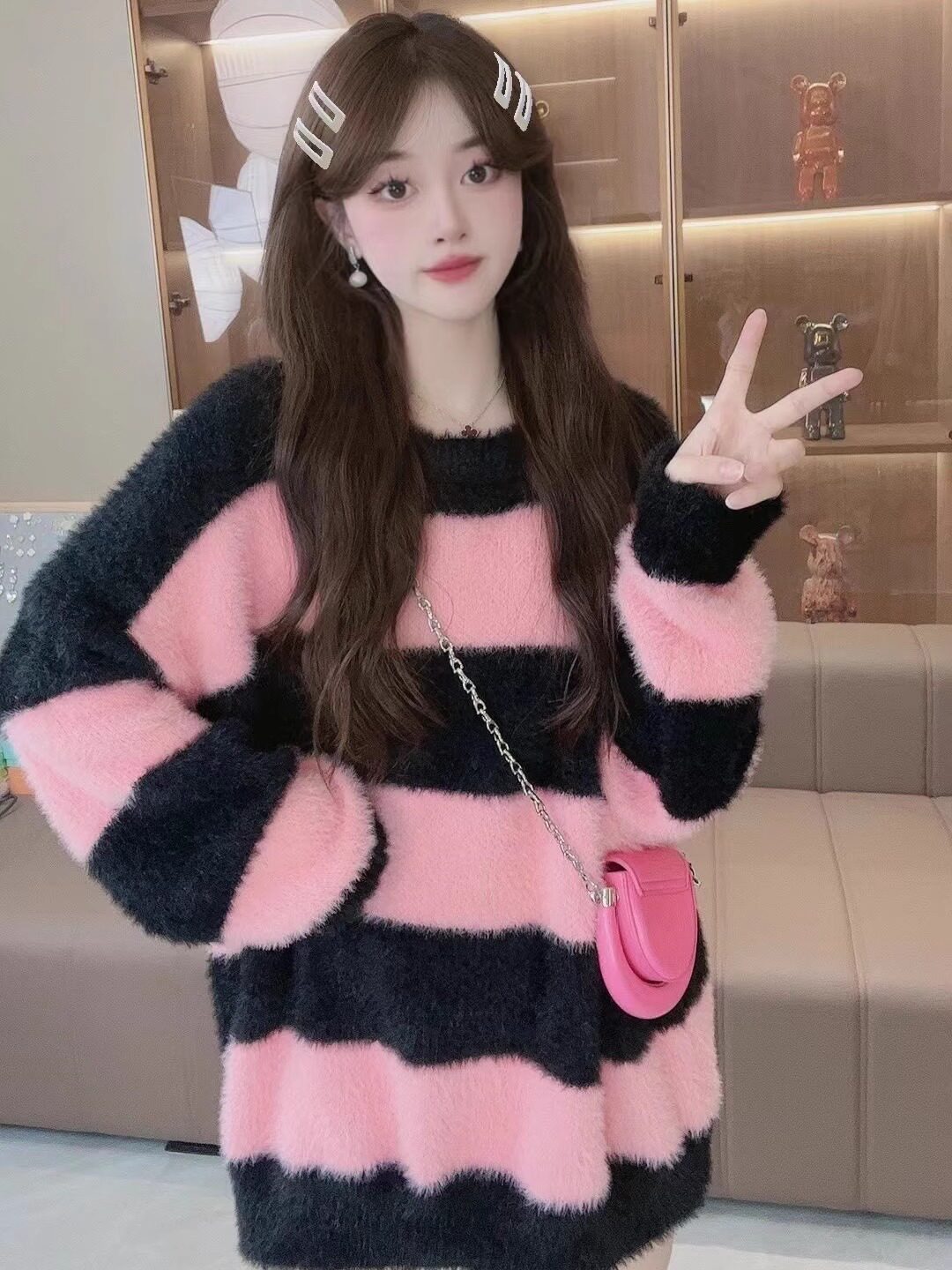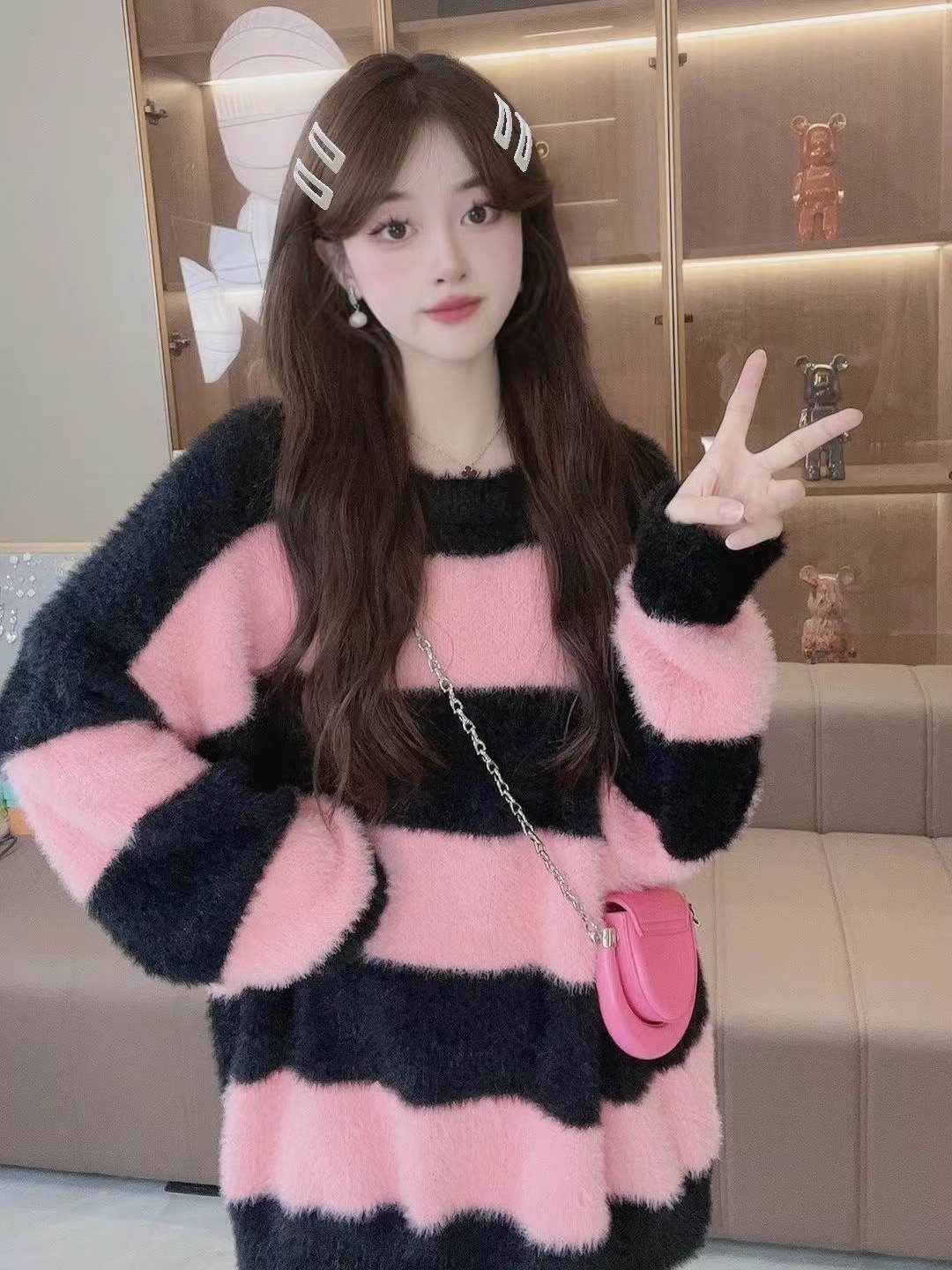 條紋設計感水貂絨毛衣女秋冬ins韓系小衆慵懶風毛茸茸針織衫上衣