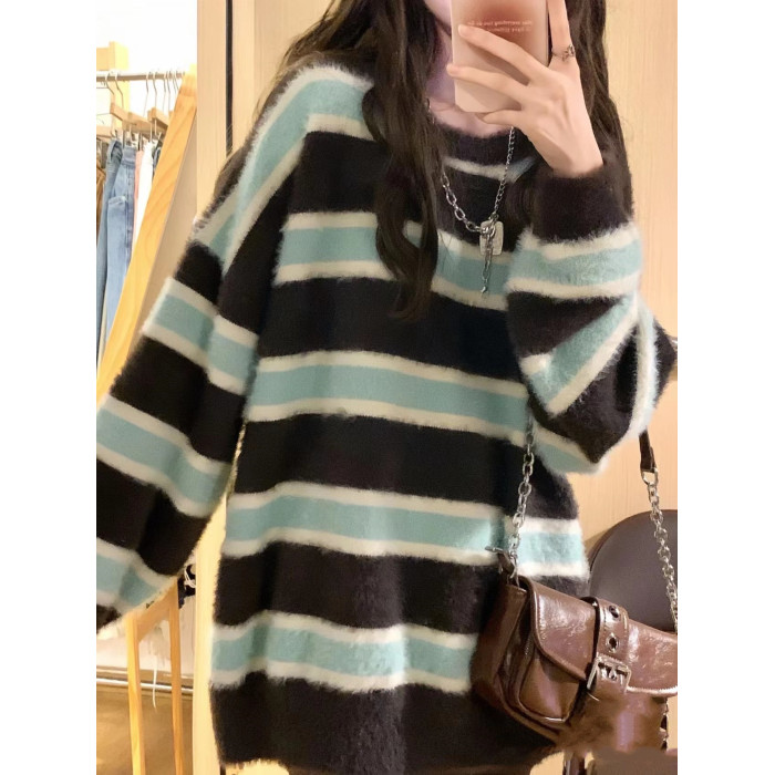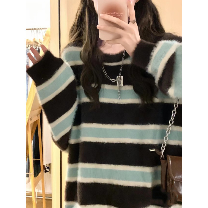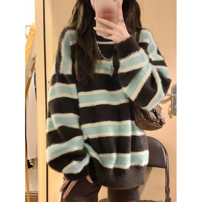 軟糯溫柔條紋慵懶風秋冬新款毛衣女寬松復古仿水貂絨甜辣針織衫厚