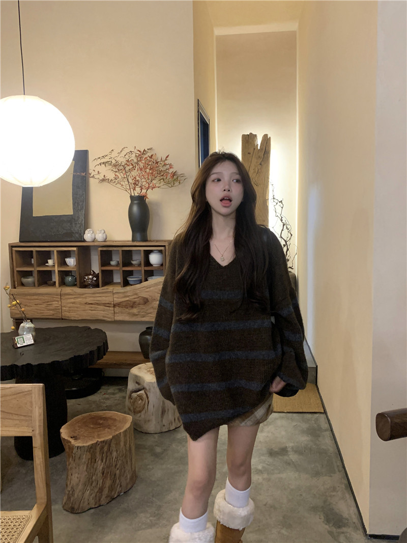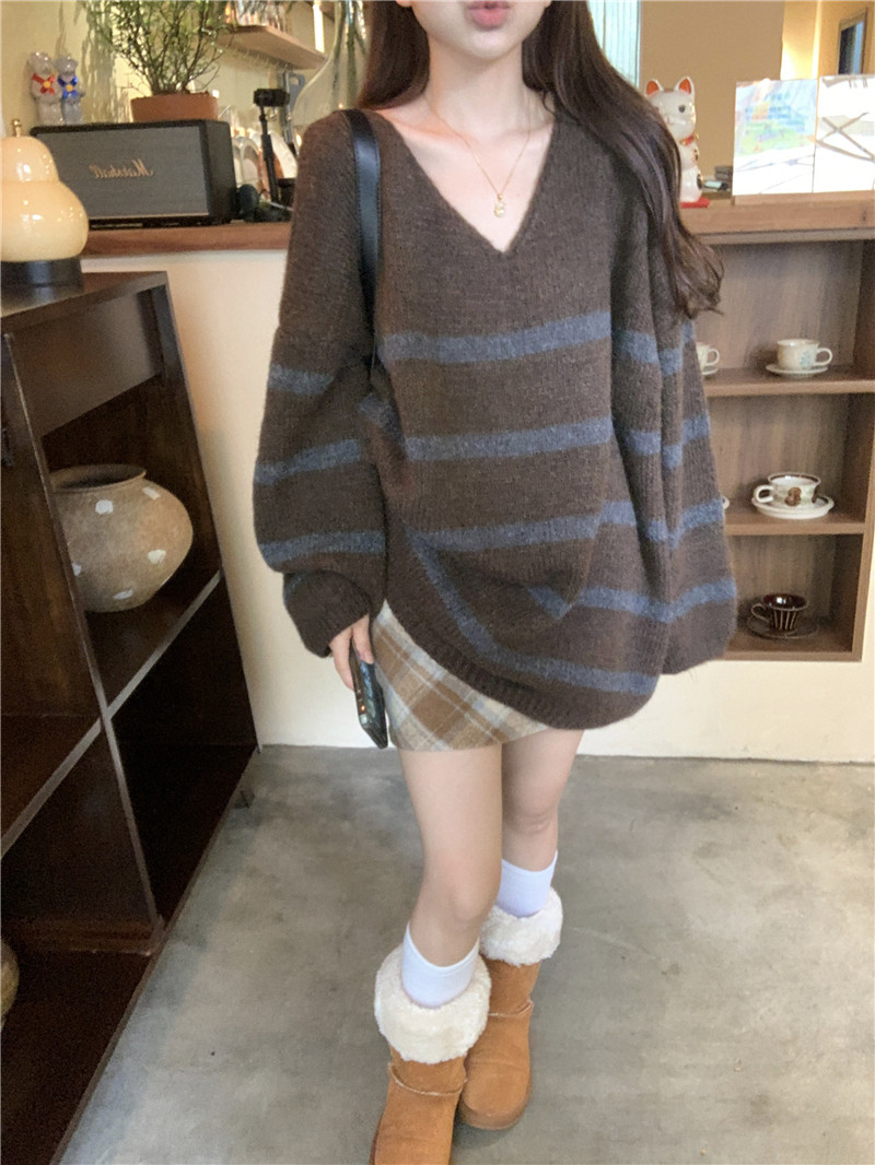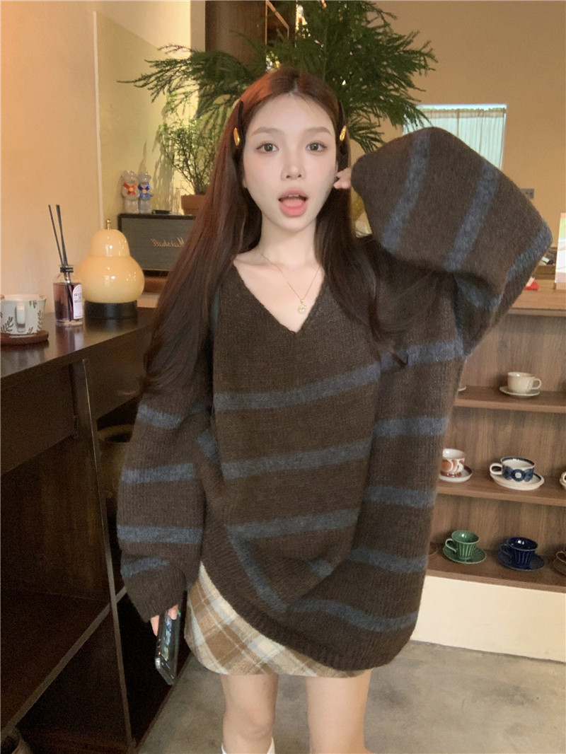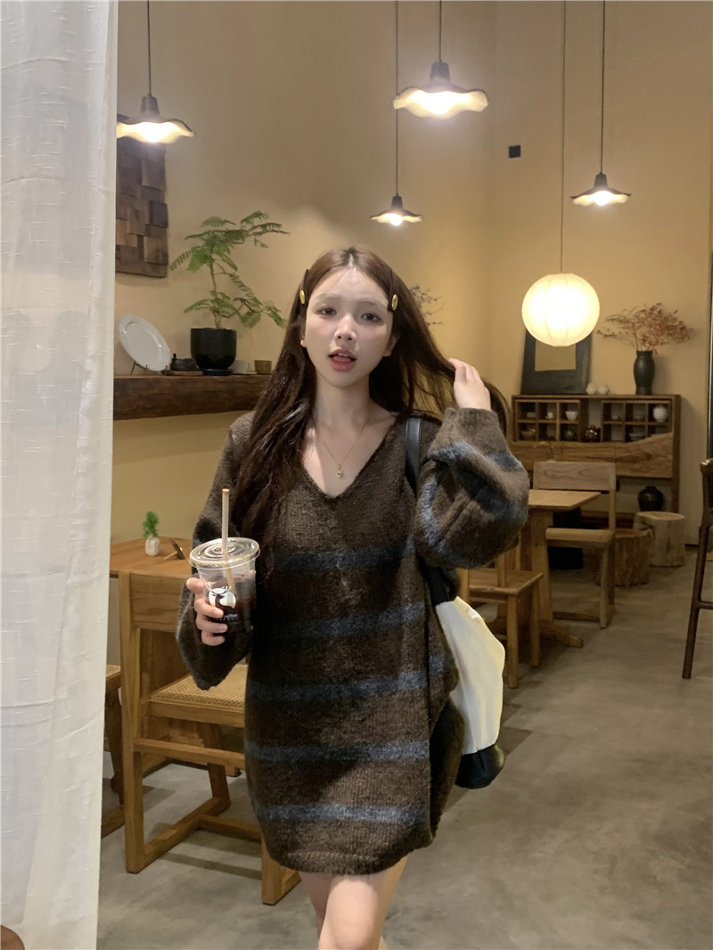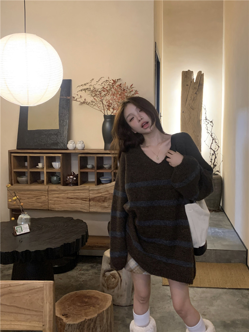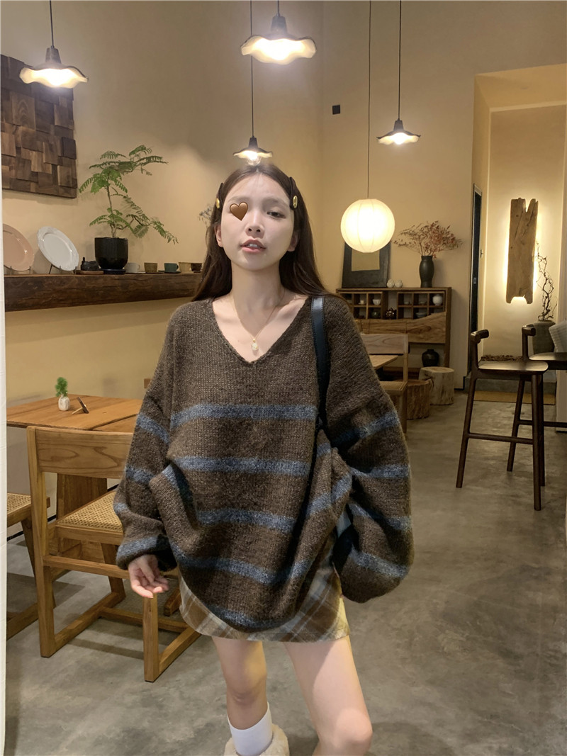 復古v領條紋毛衣女秋冬慵懶風寬松顯瘦外穿中長款套頭內搭針織衫