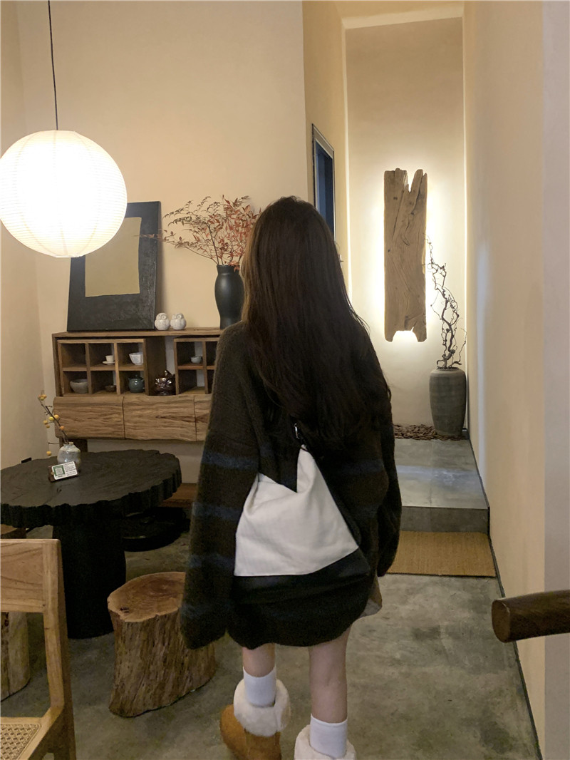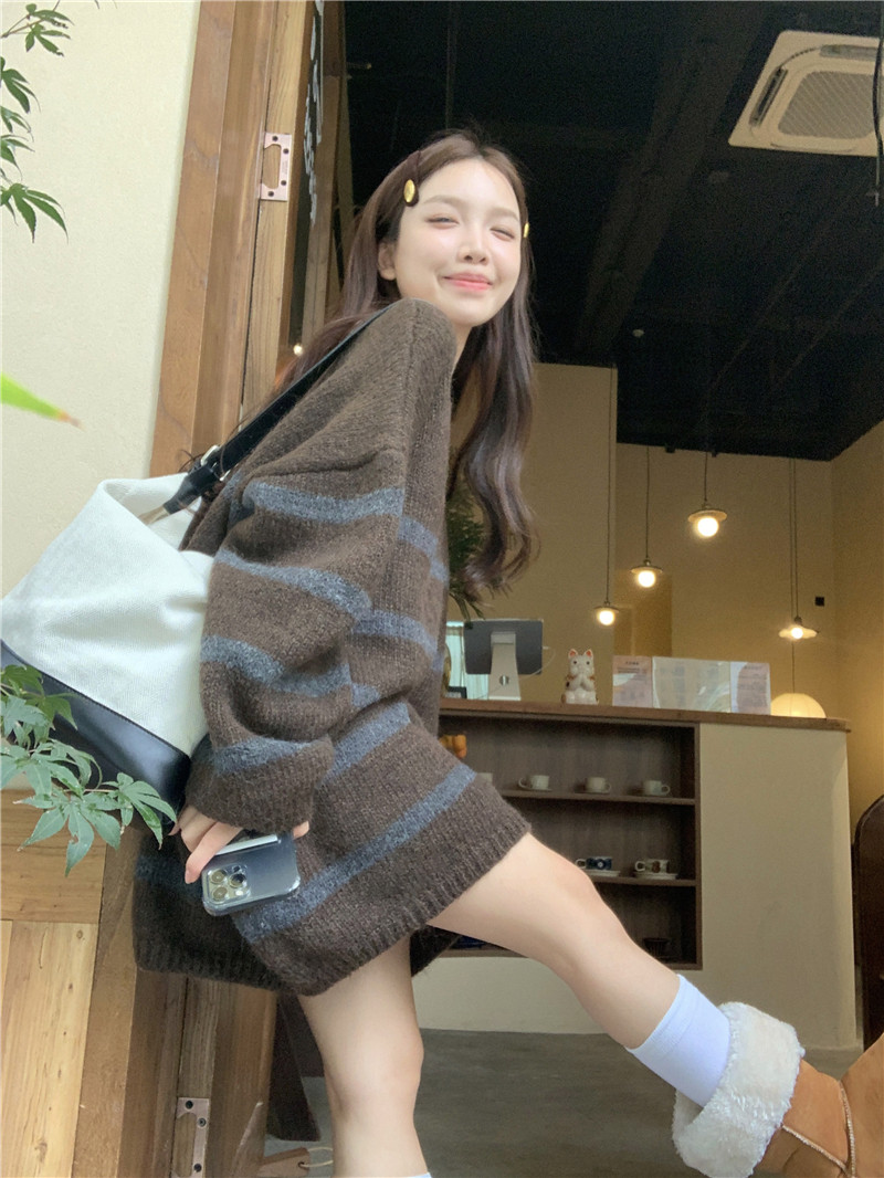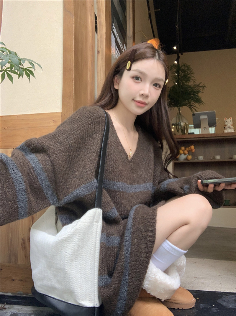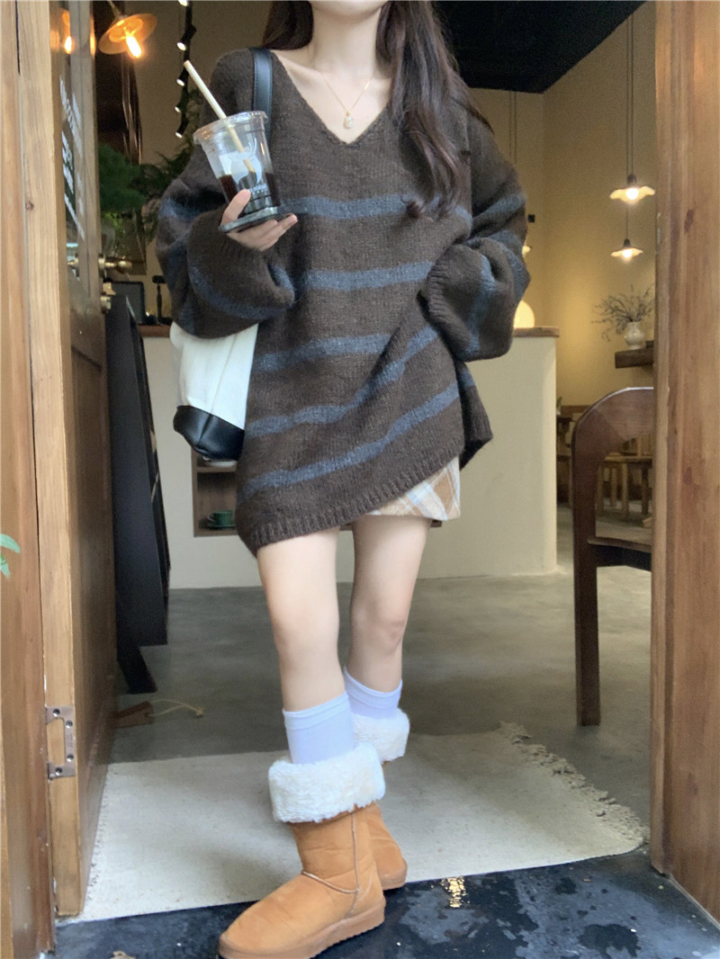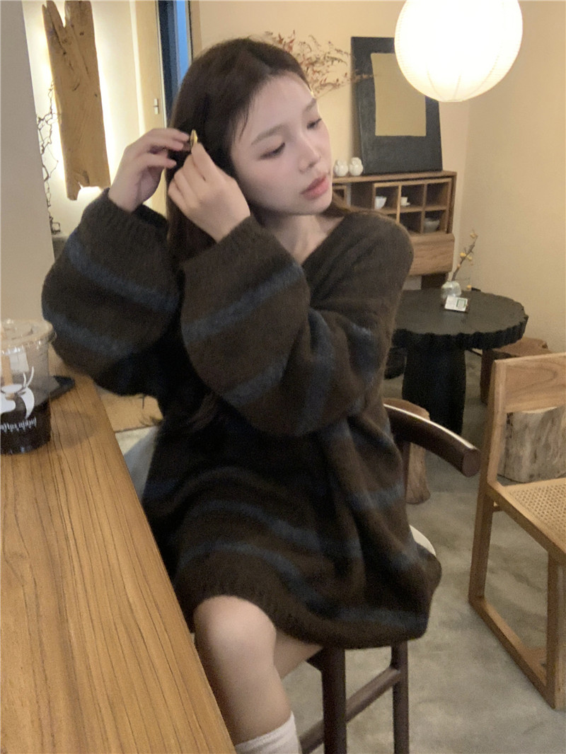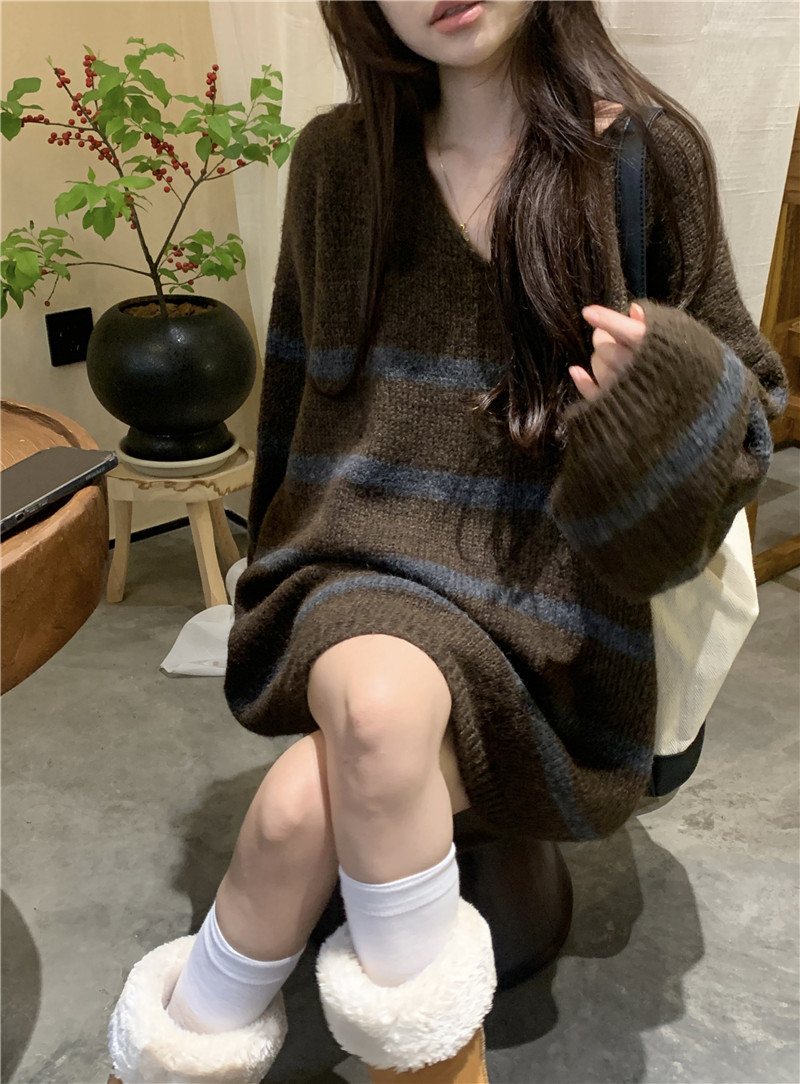 復古v領條紋毛衣女秋冬慵懶風寬松顯瘦外穿中長款套頭內搭針織衫