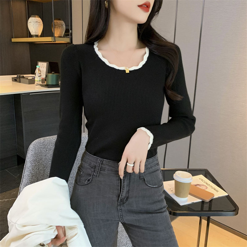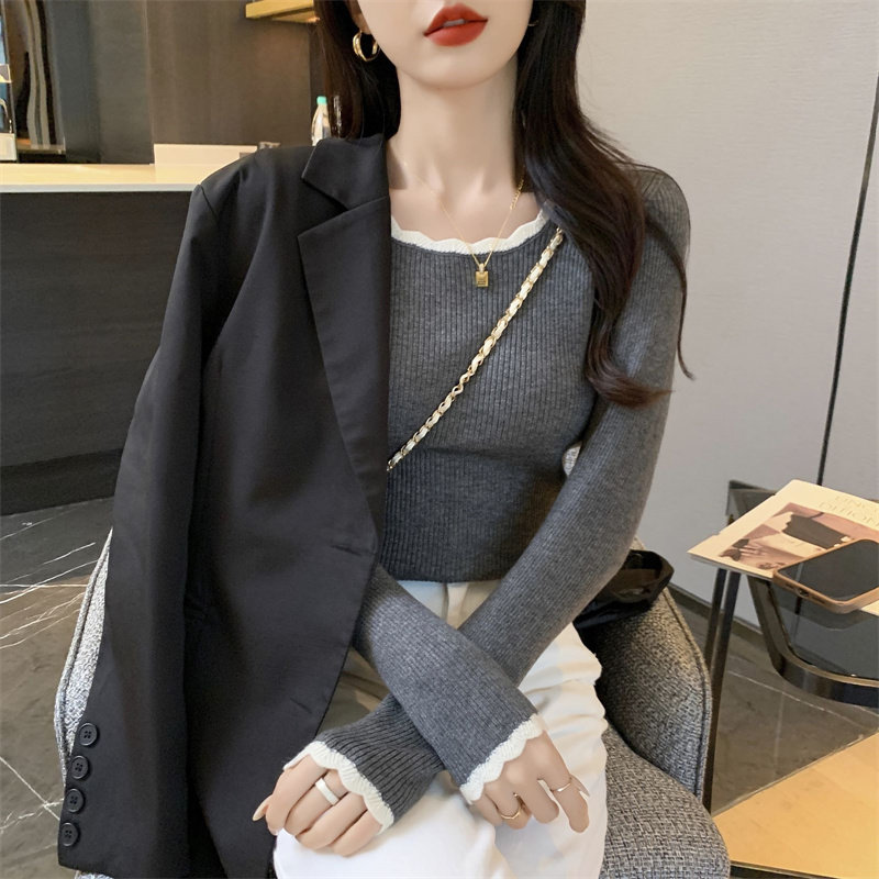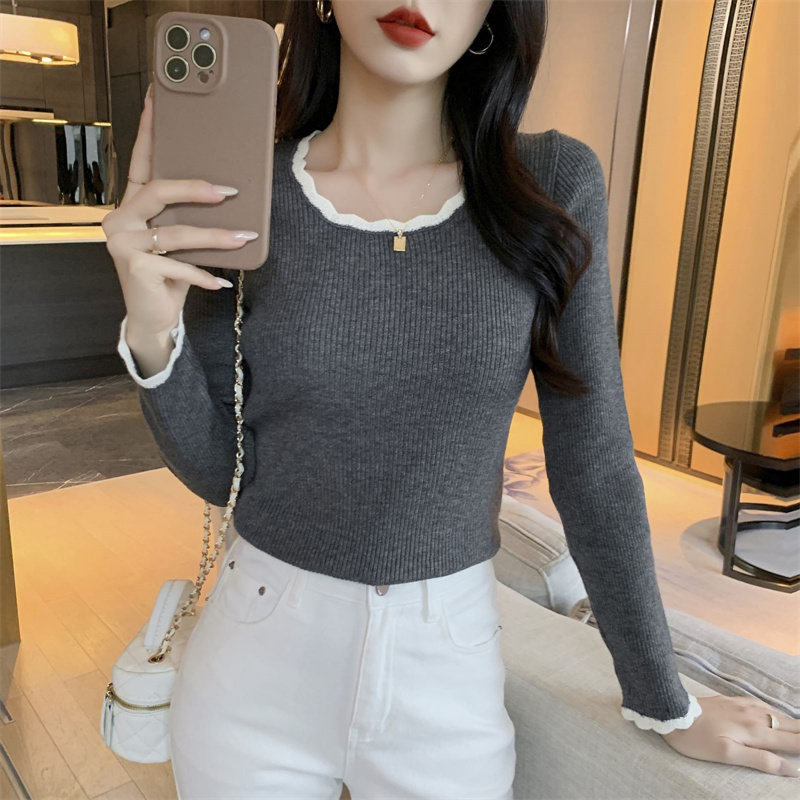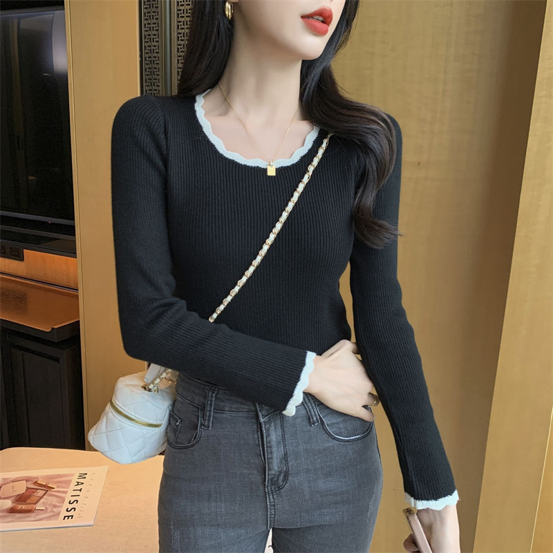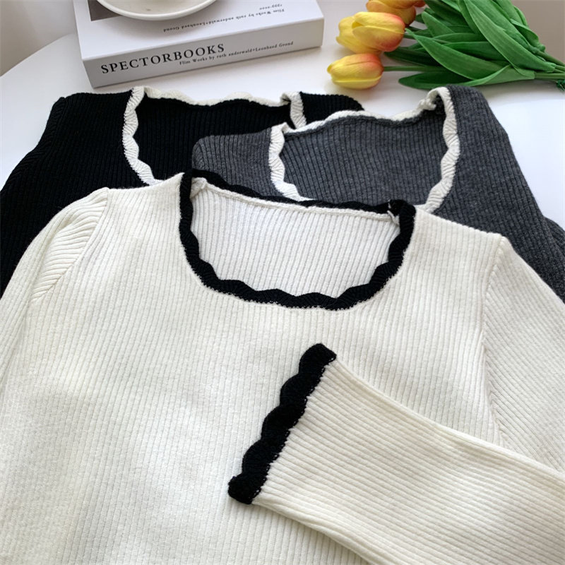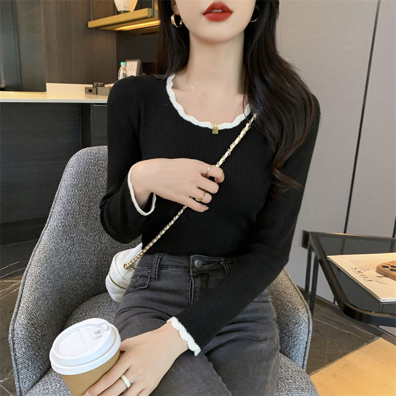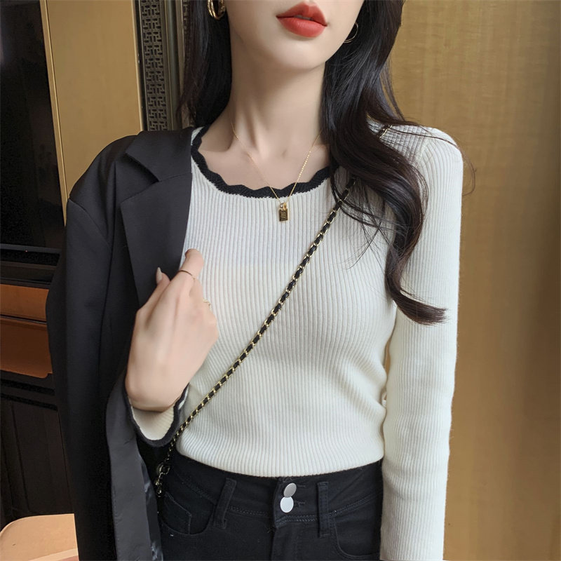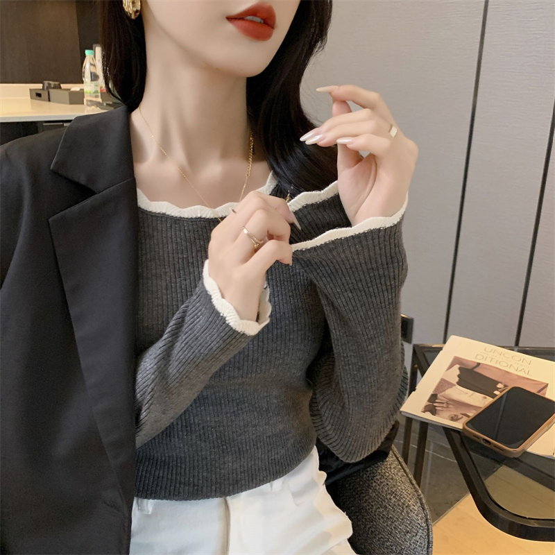 木耳邊方領內搭修身毛衣女打底衫春秋高級感小衆設計感針織上衣潮