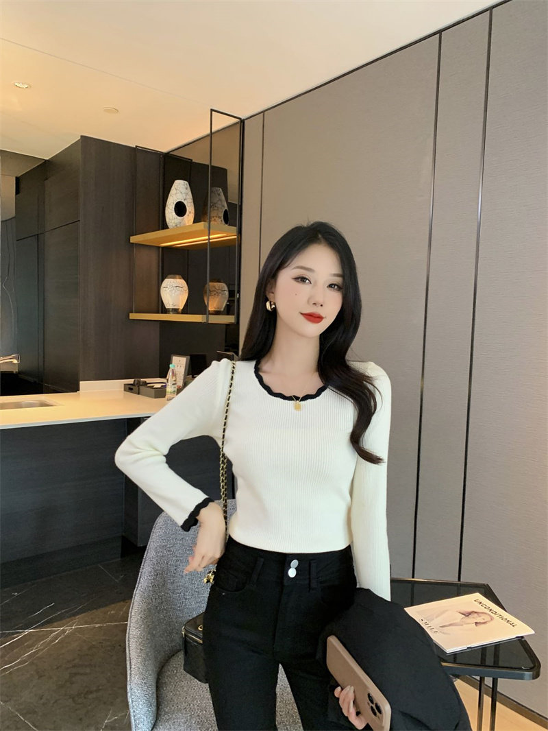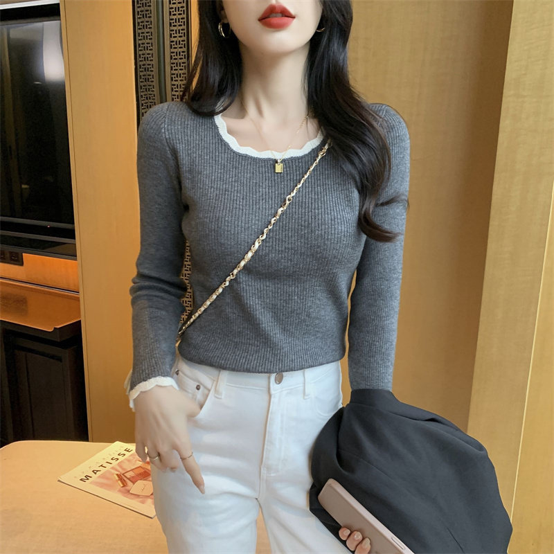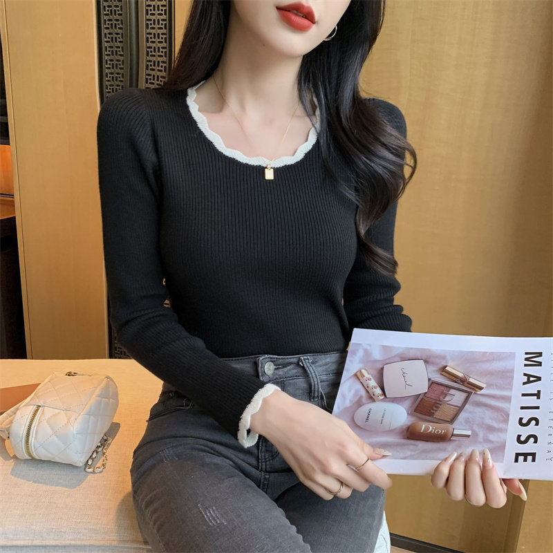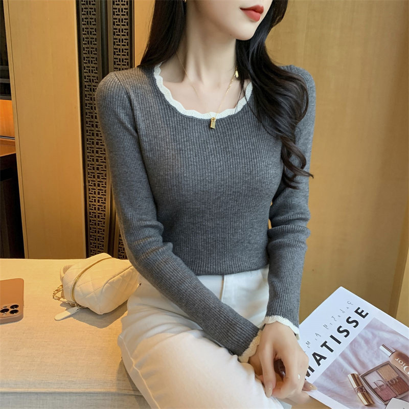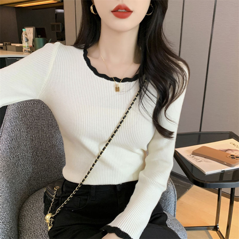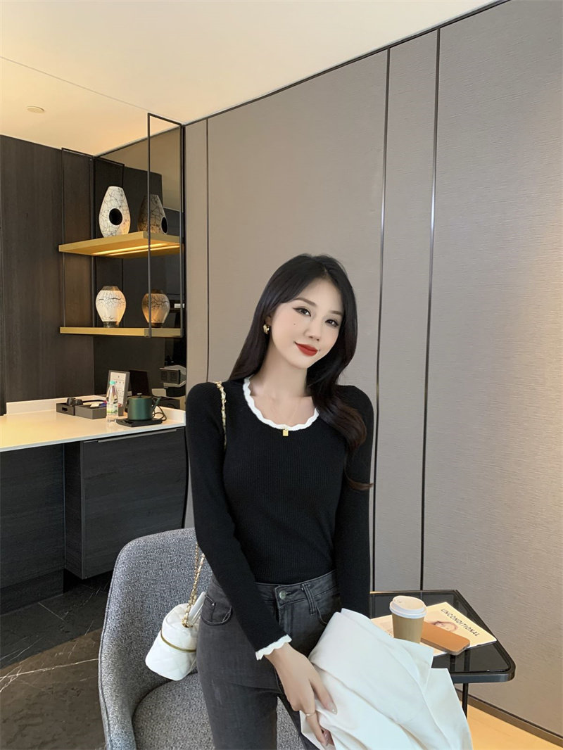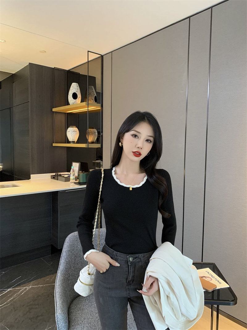 木耳邊方領內搭修身毛衣女打底衫春秋高級感小衆設計感針織上衣潮