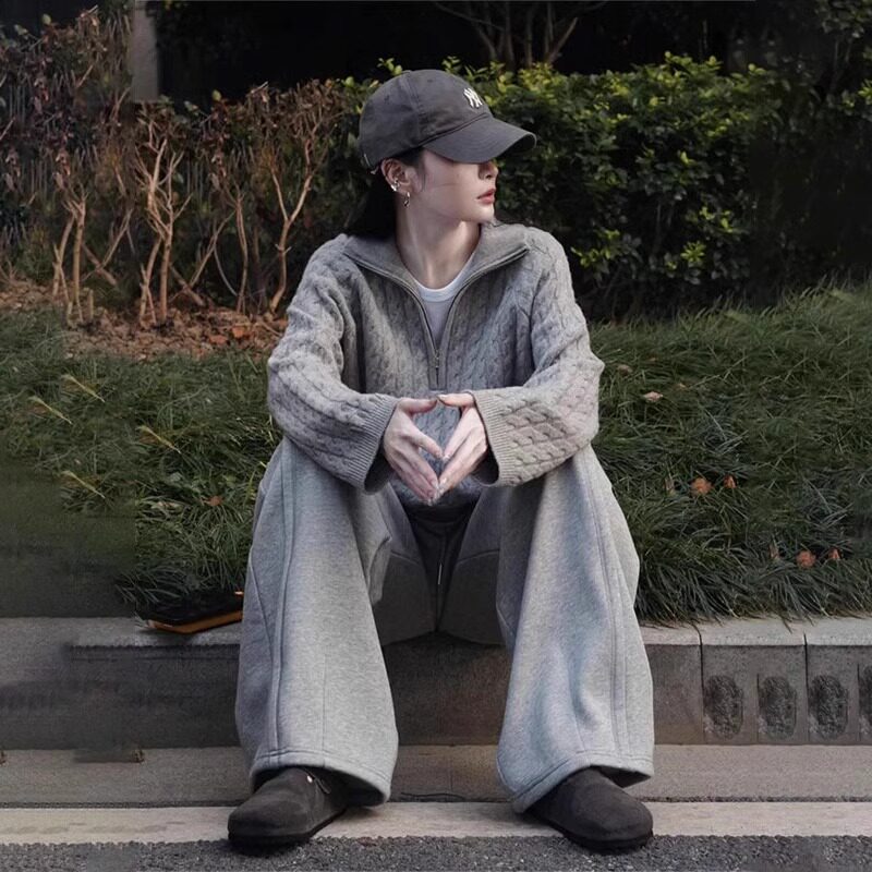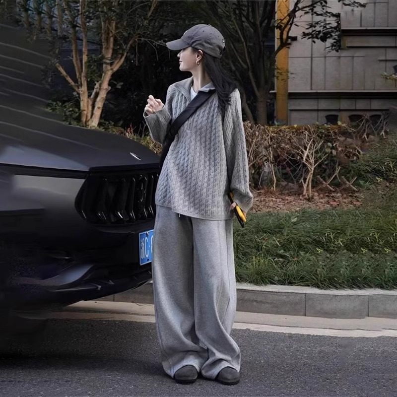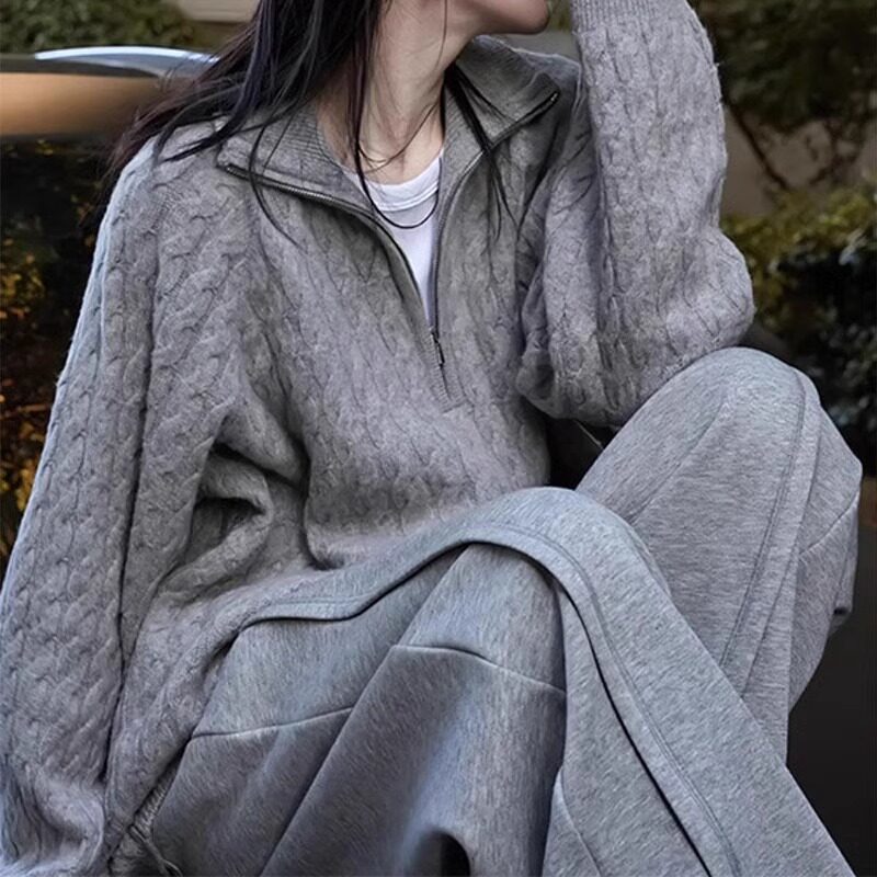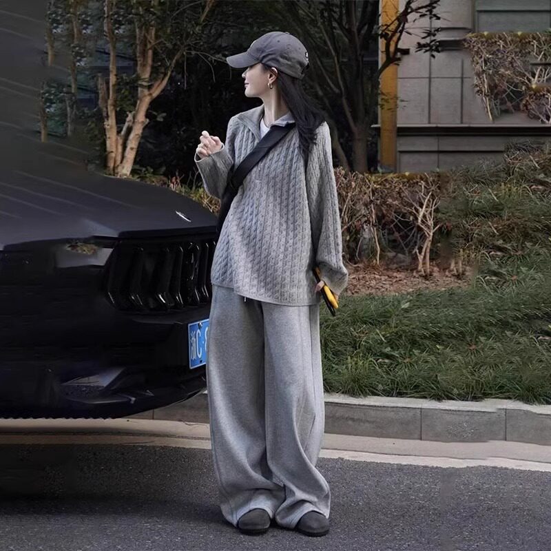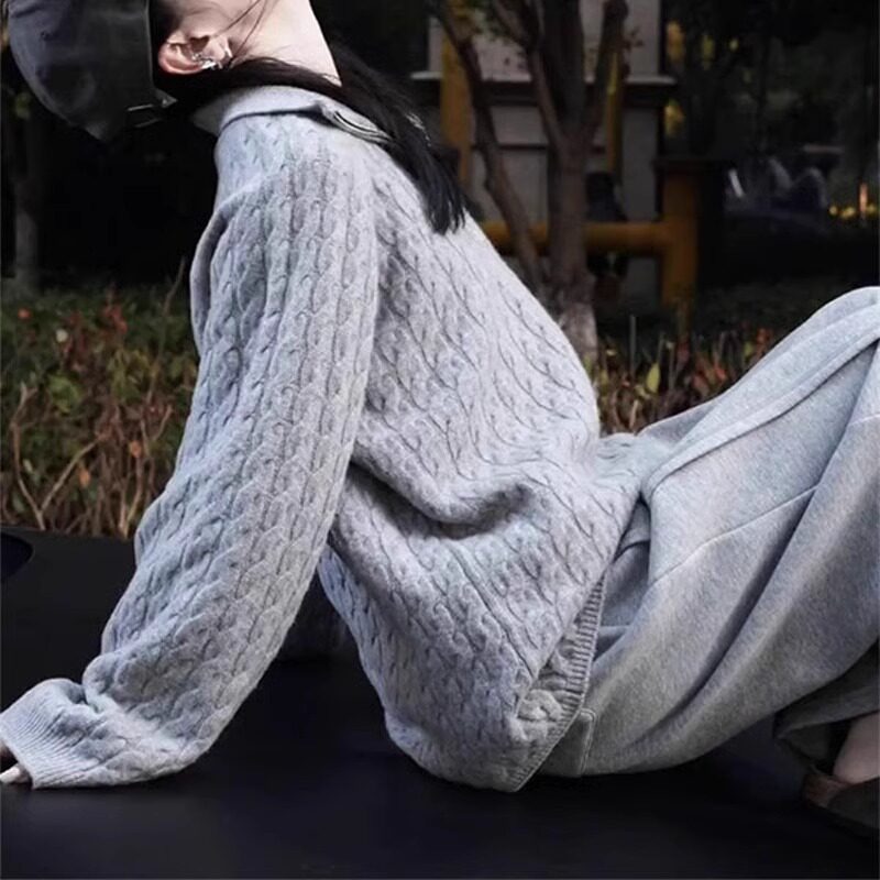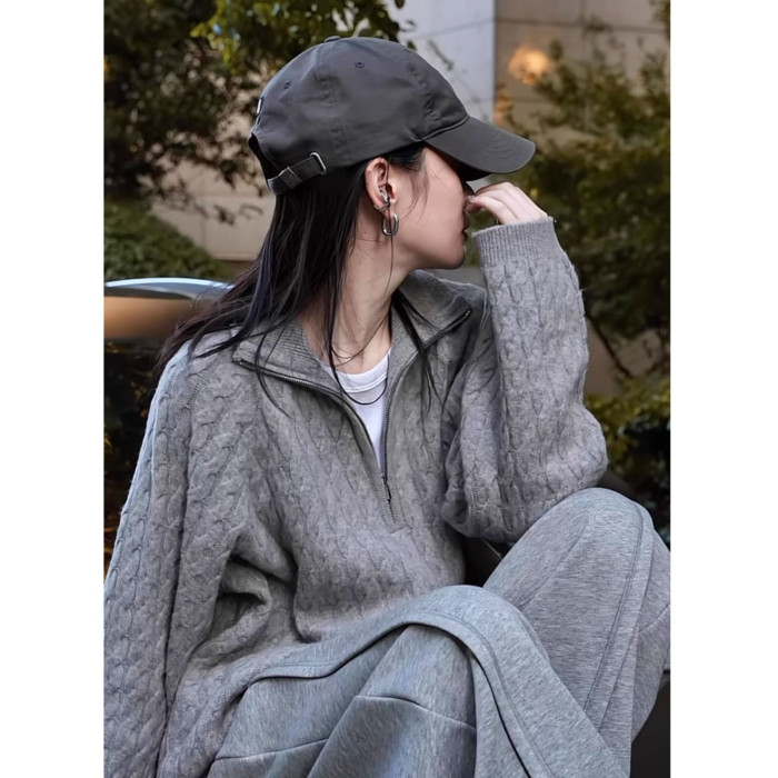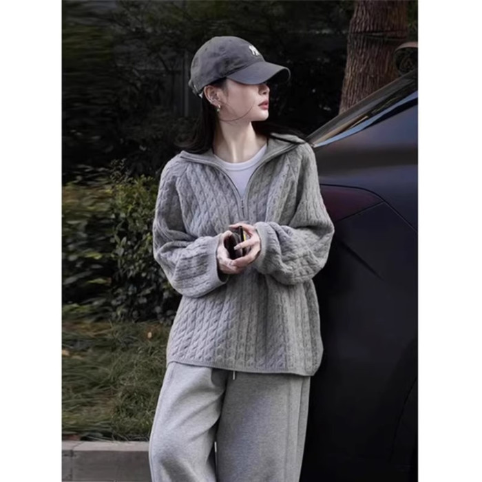 奶fufu半拉鍊麻花灰色毛衣女冬季穿搭慵懶寬松針織衫翻領內搭上衣