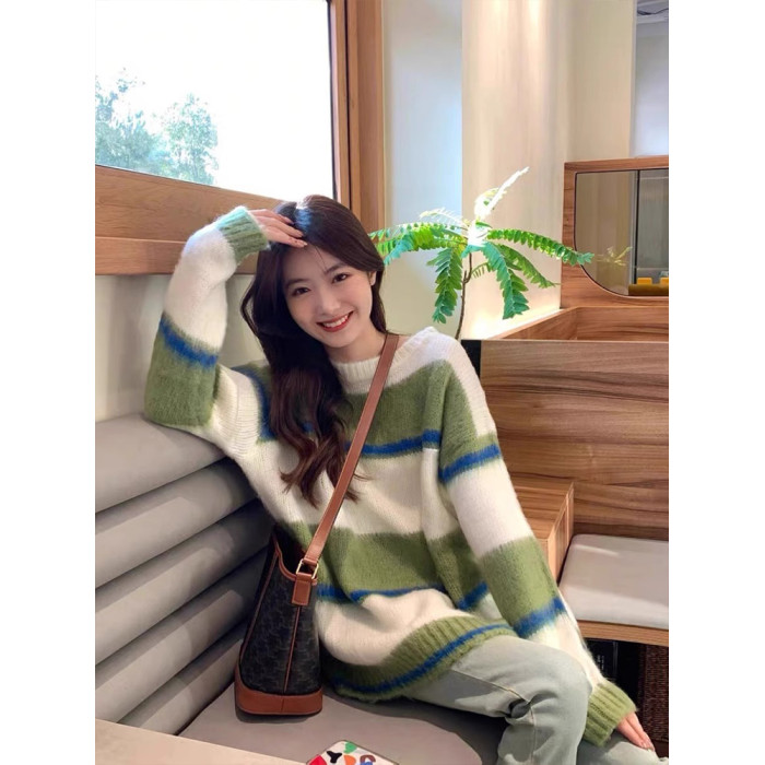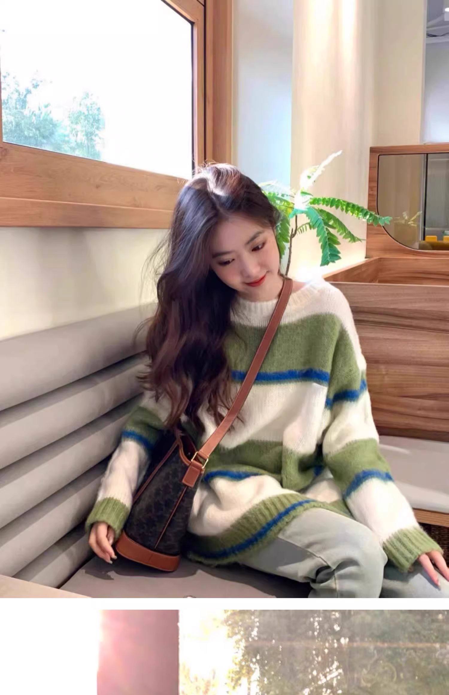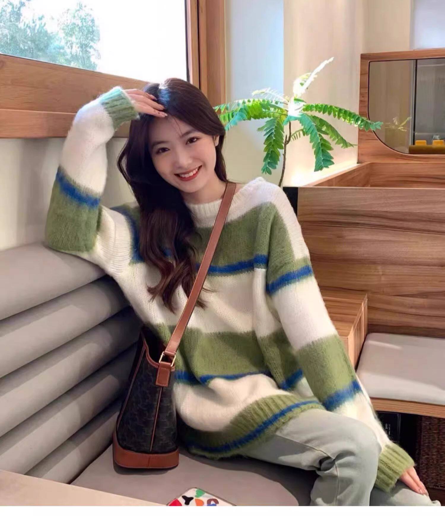 綠色條紋多巴胺撞色毛衣女水貂絨軟糯上衣冬季寬松針織衫套頭聖誕