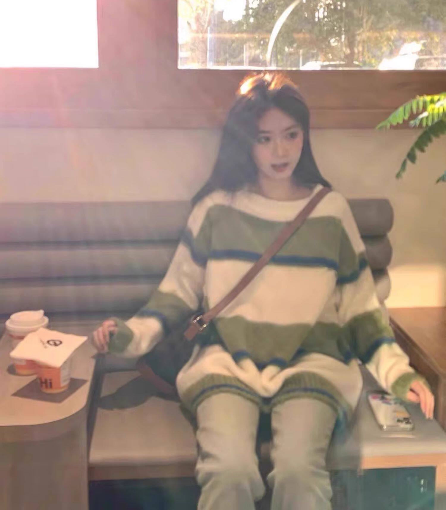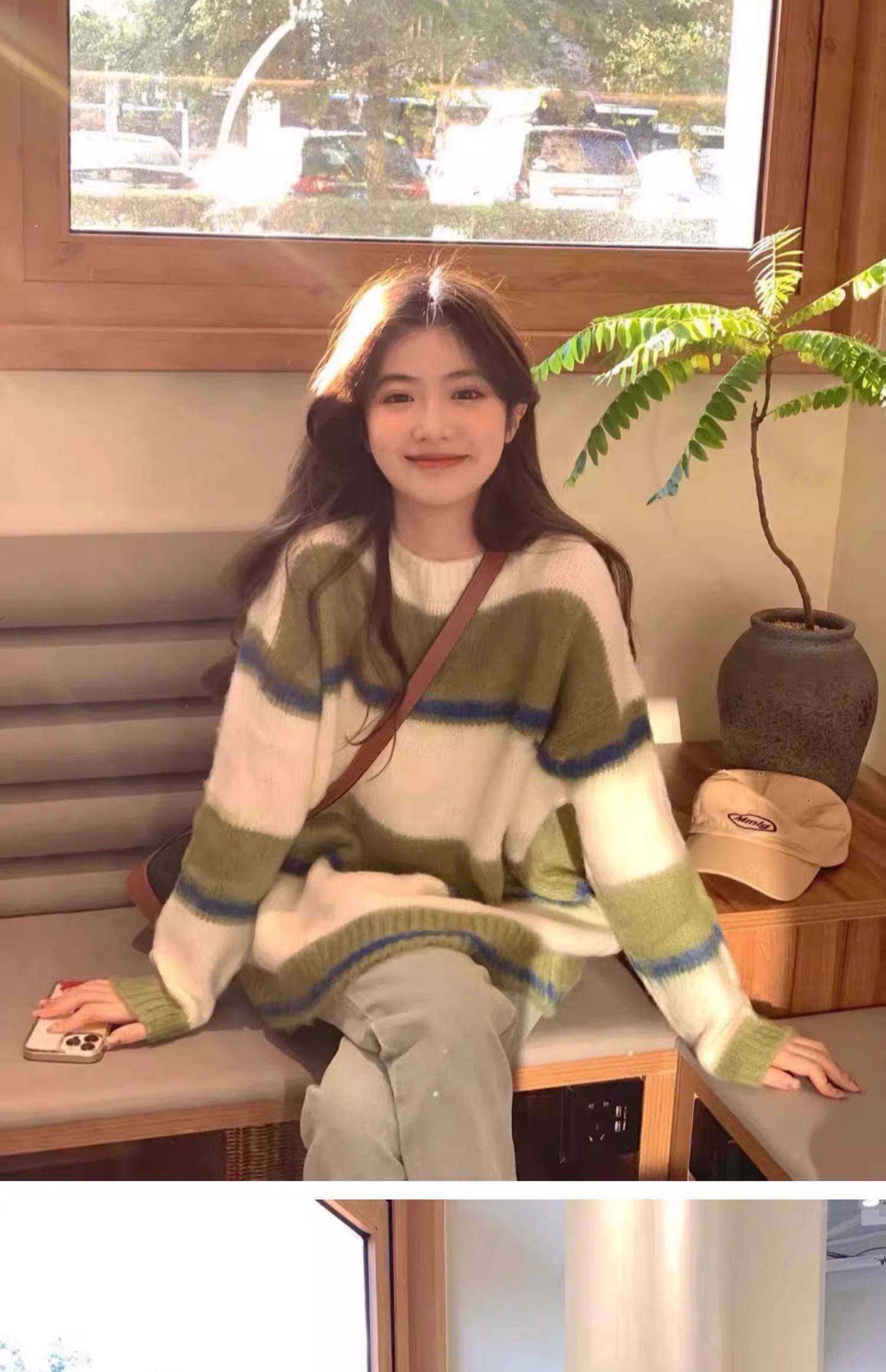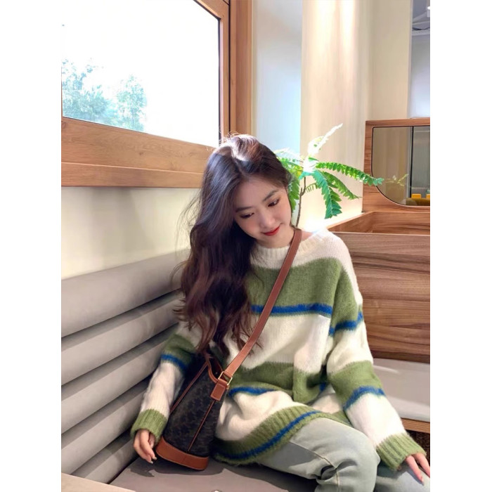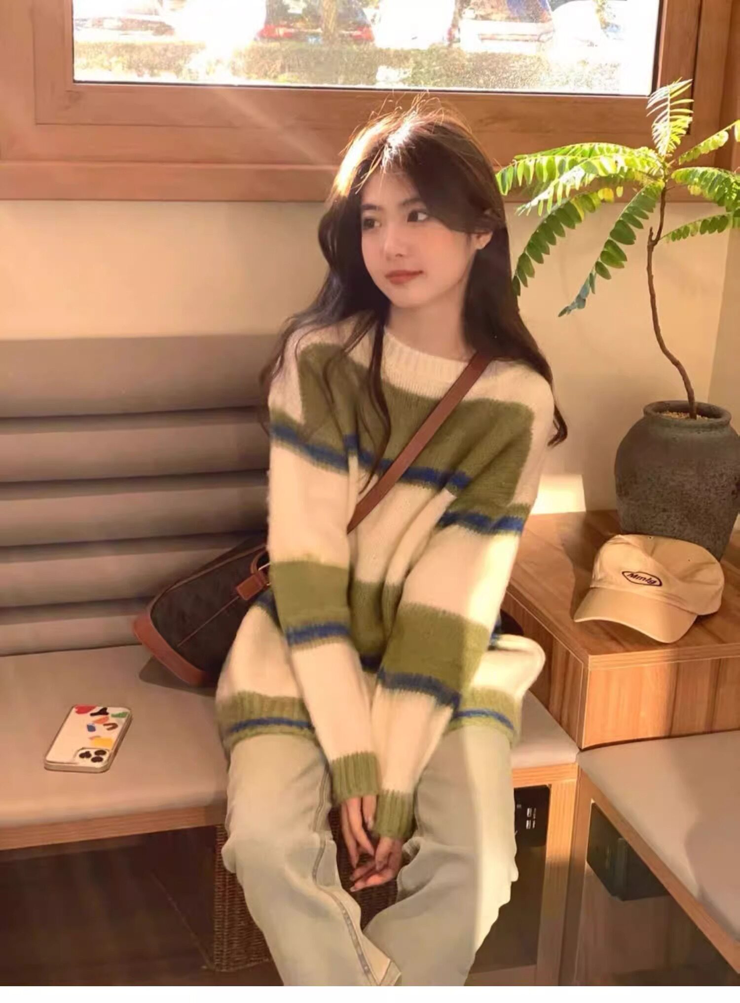 綠色條紋多巴胺撞色毛衣女水貂絨軟糯上衣冬季寬松針織衫套頭聖誕