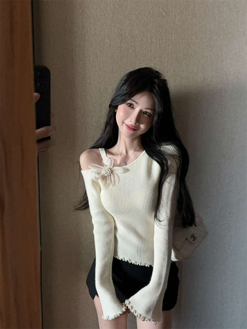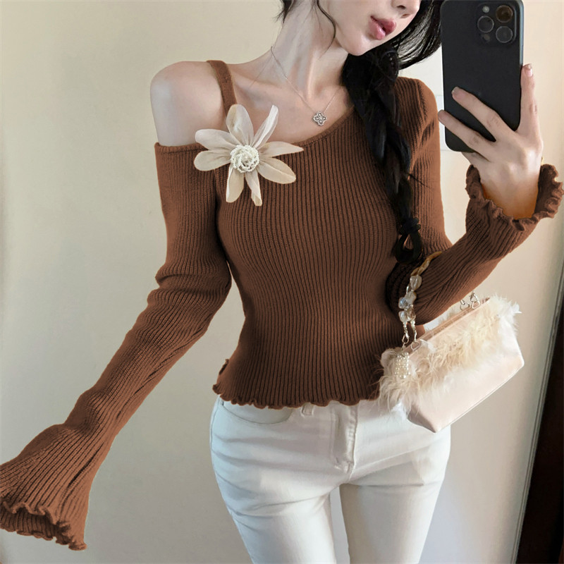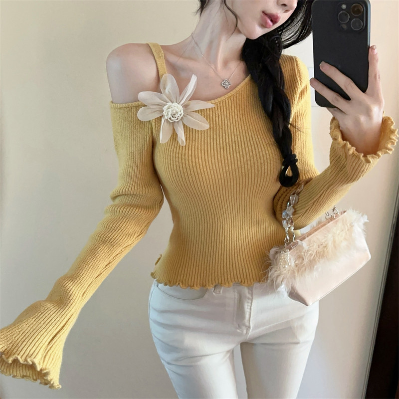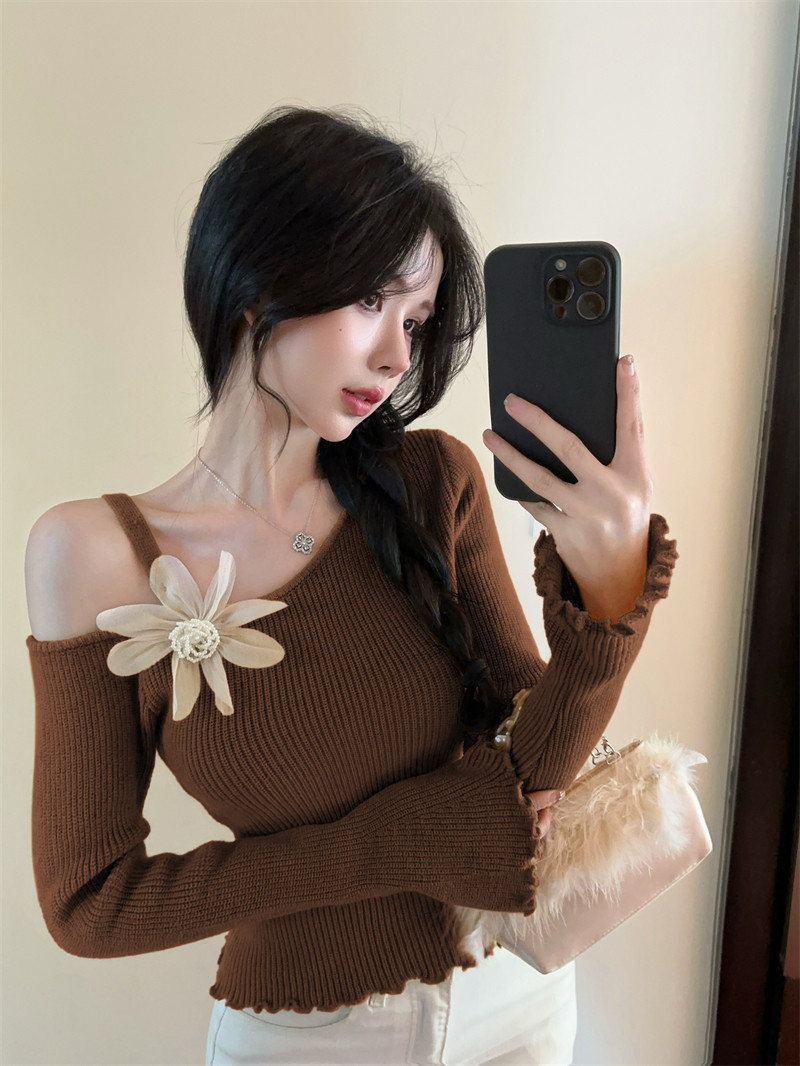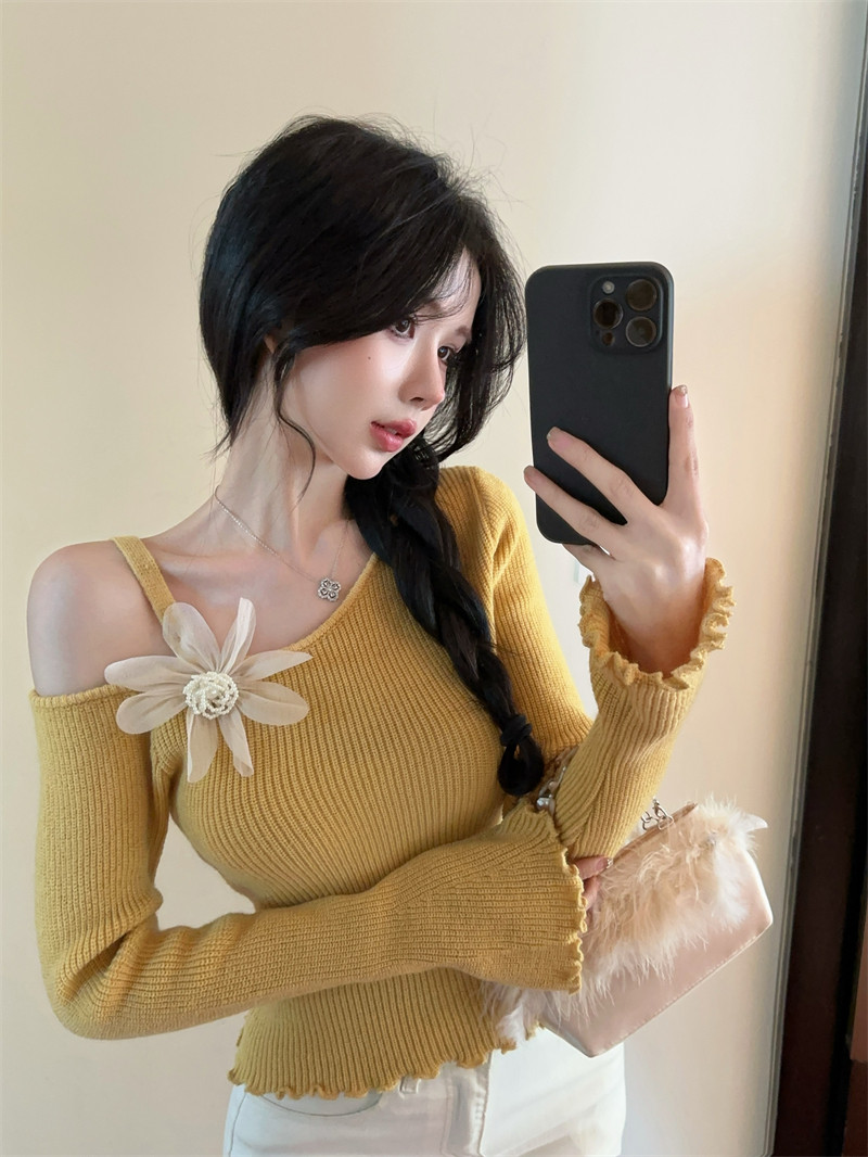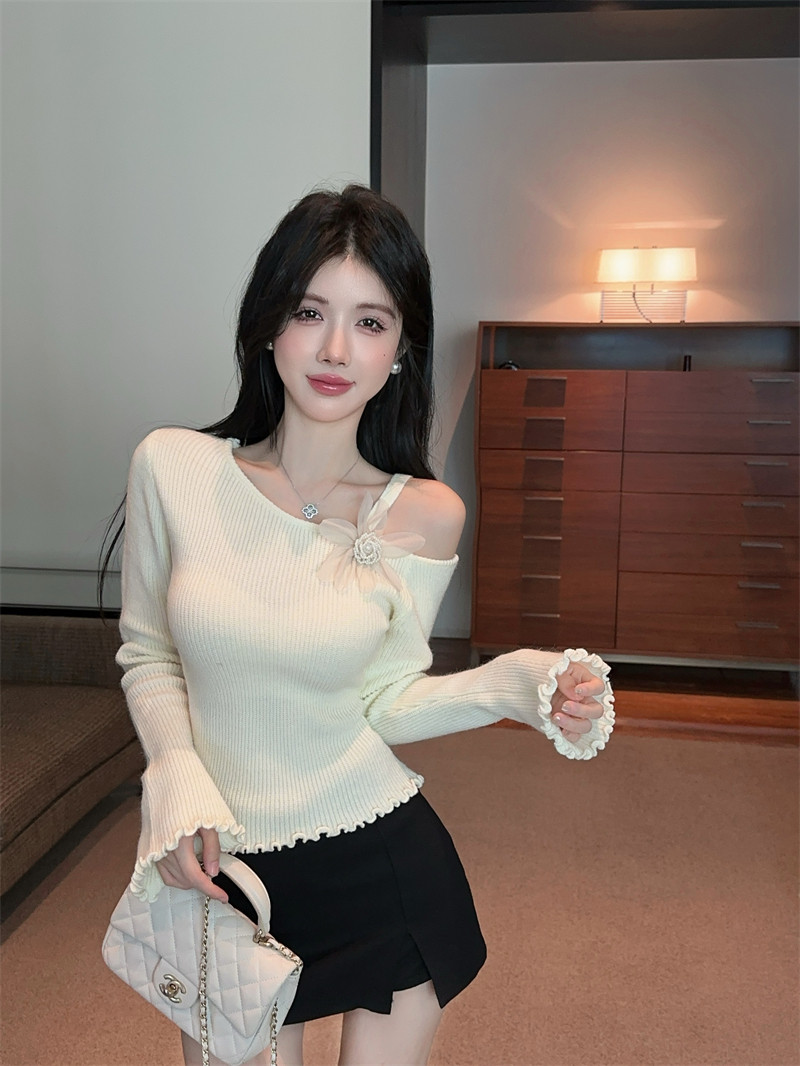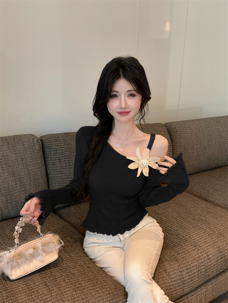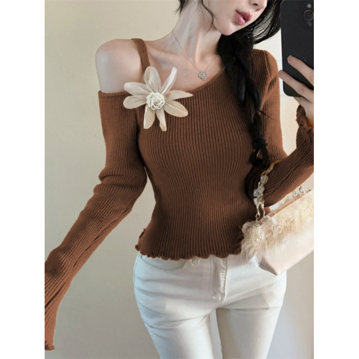 不規則斜領立體花朵針織衫吊帶露肩辣妹木耳邊毛衣女裝百搭毛衣