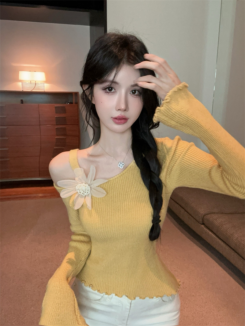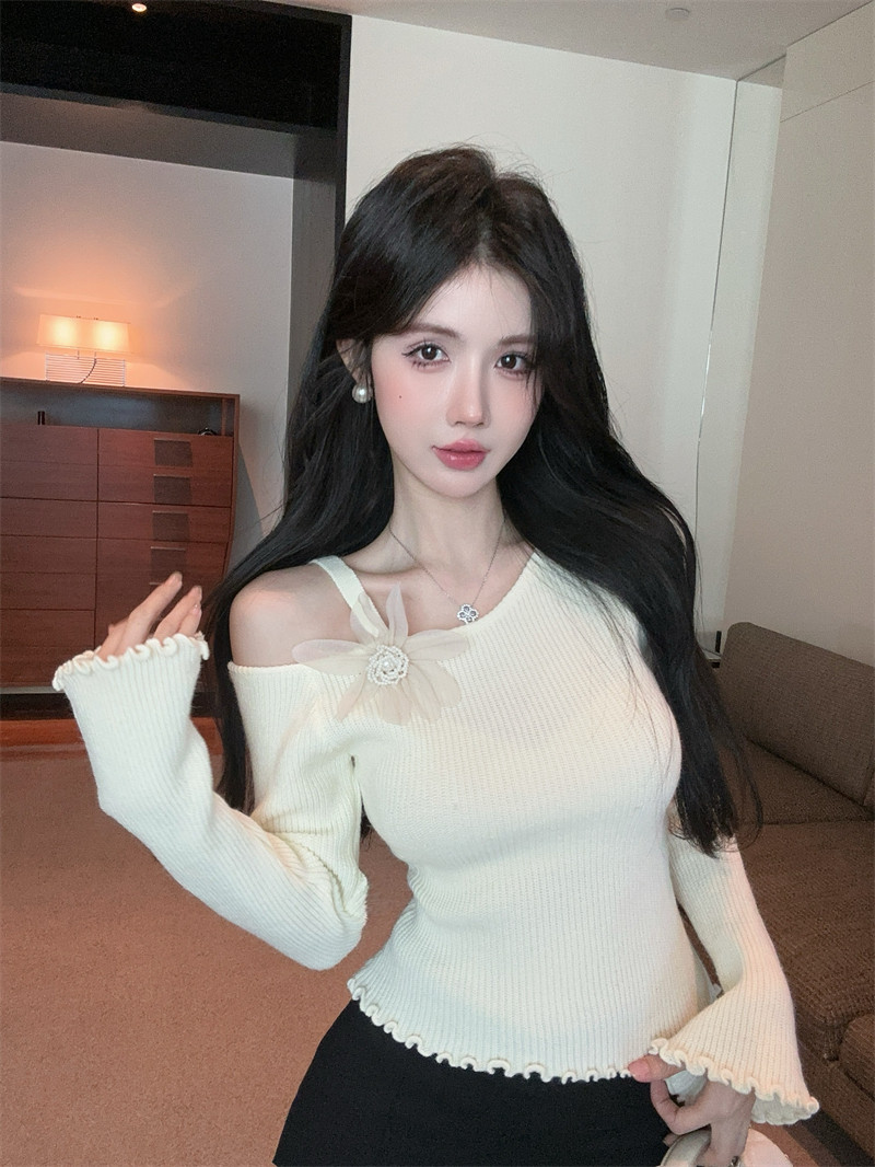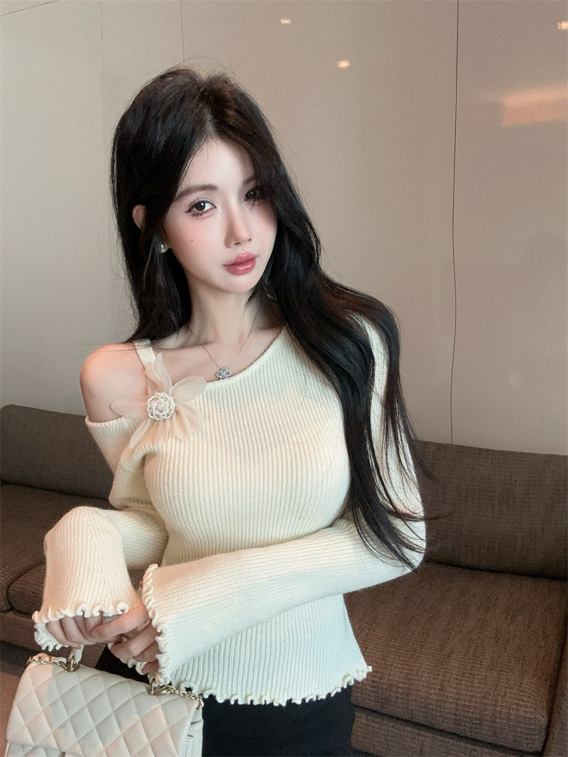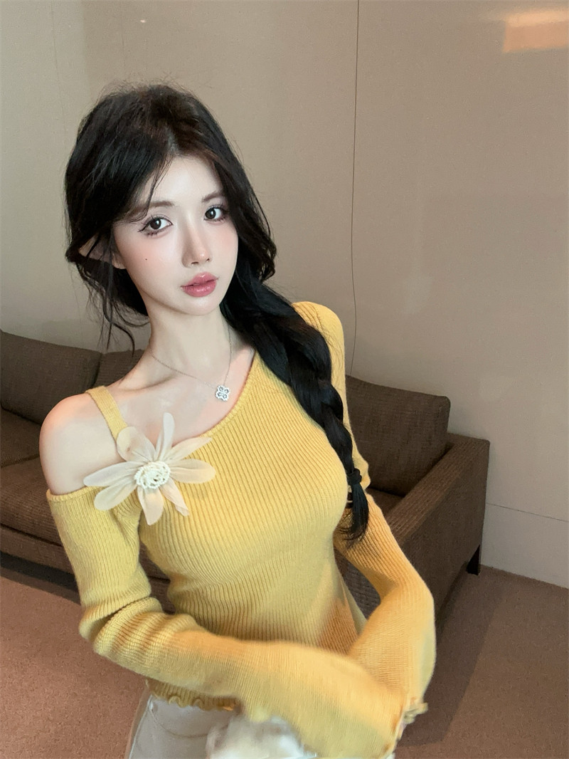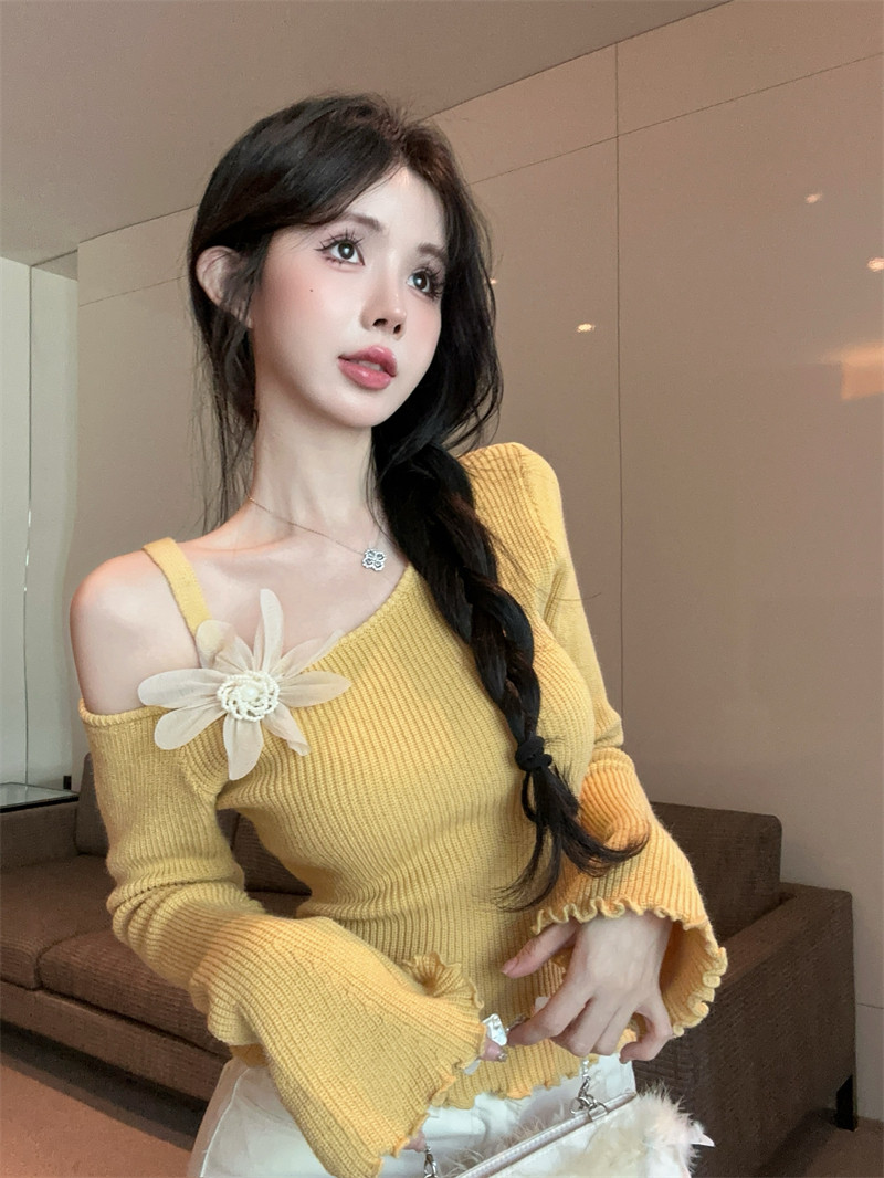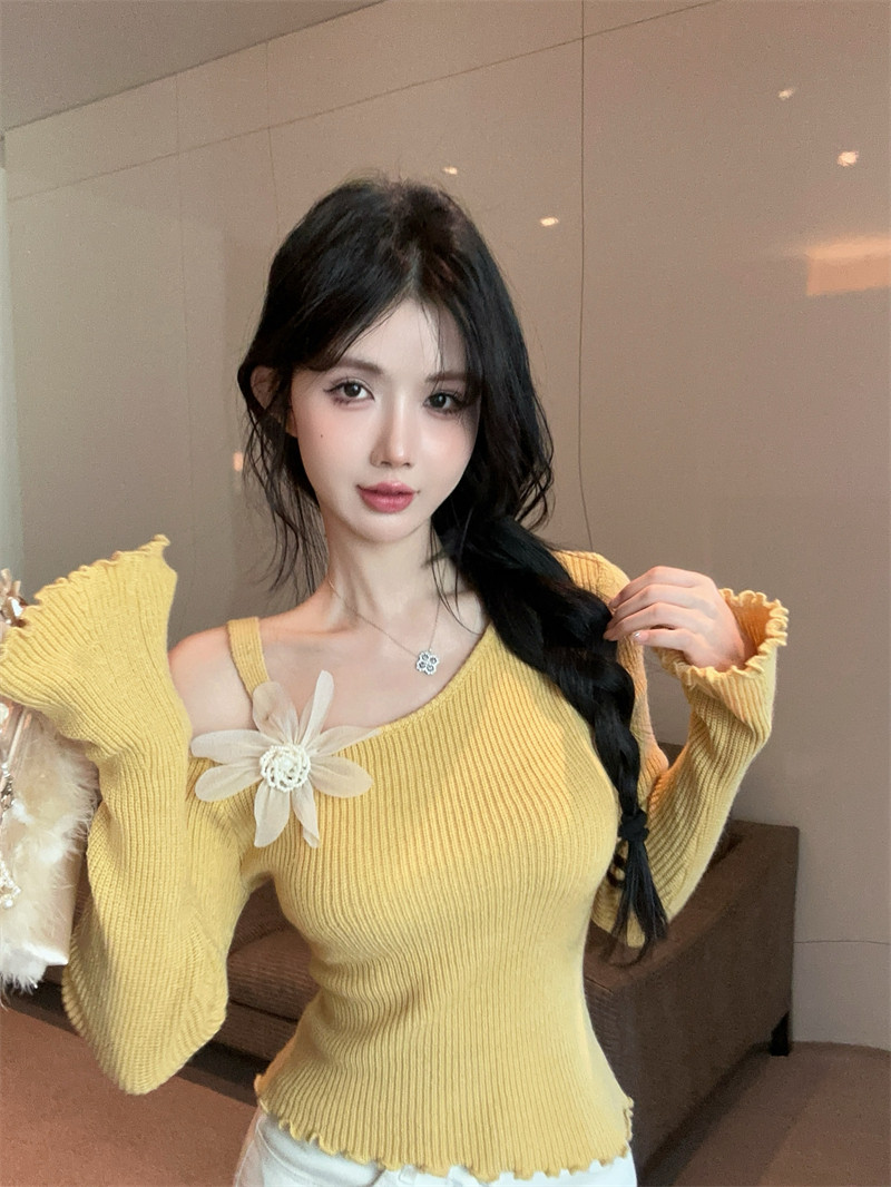 不規則斜領立體花朵針織衫吊帶露肩辣妹木耳邊毛衣女裝百搭毛衣