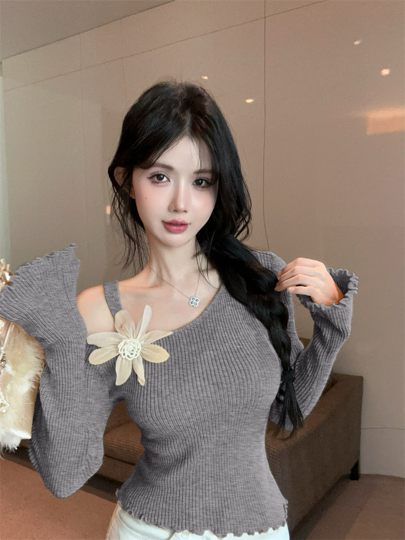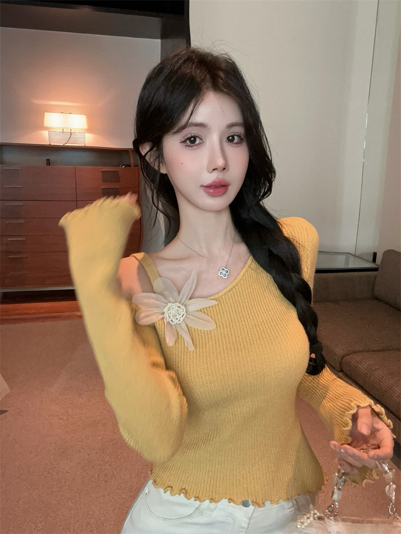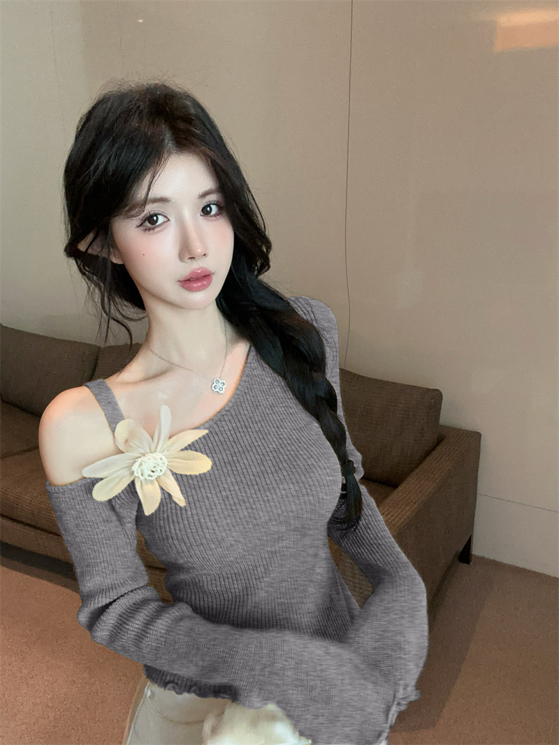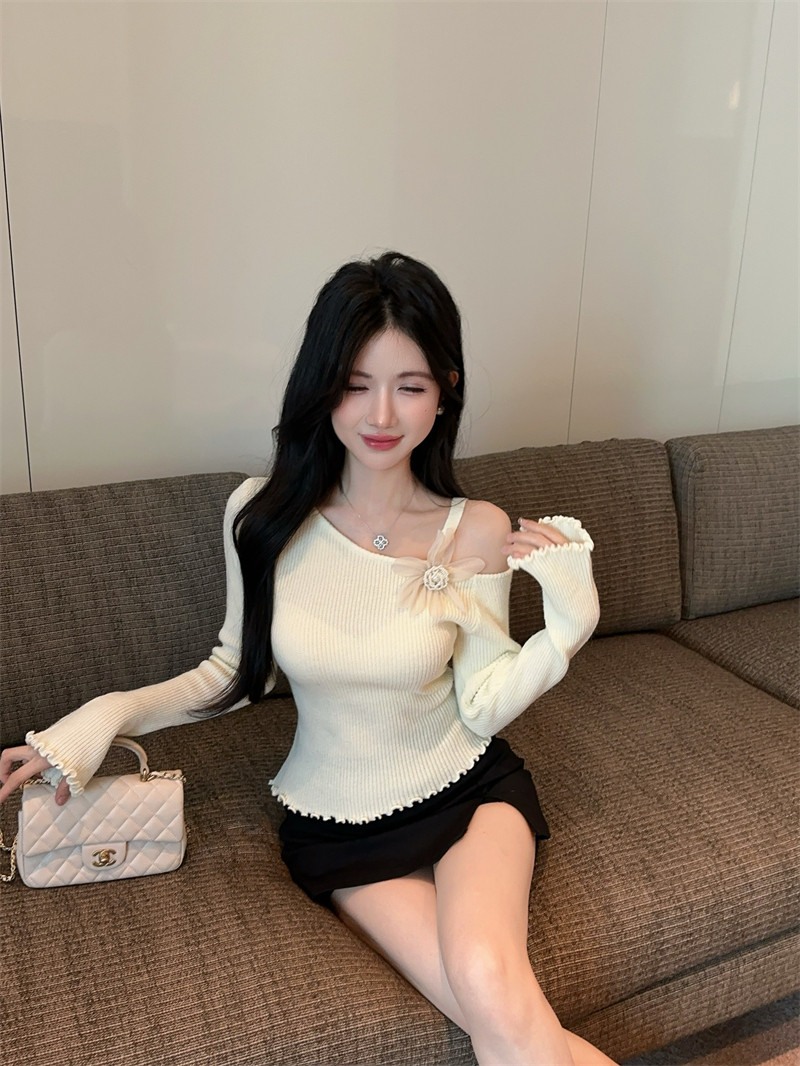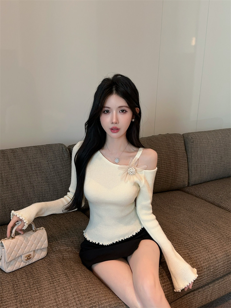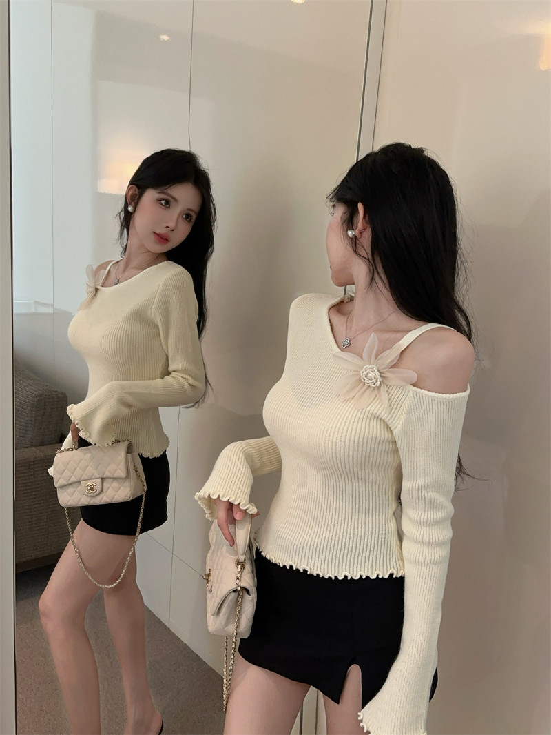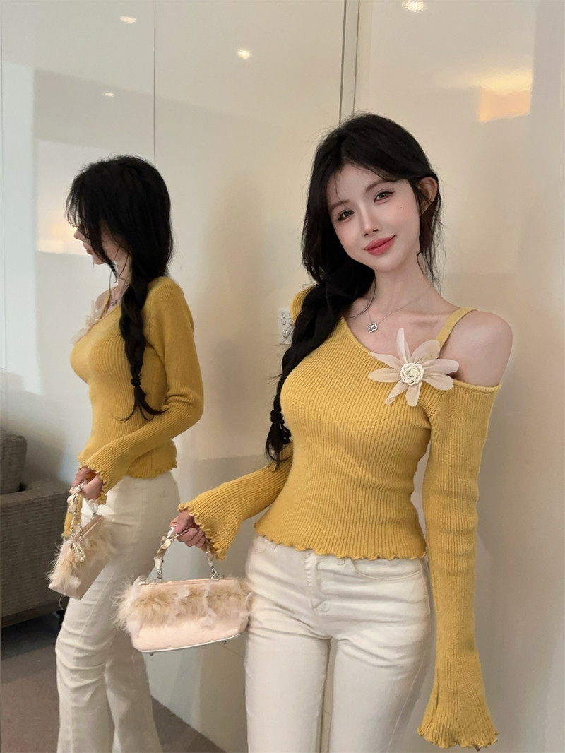 不規則斜領立體花朵針織衫吊帶露肩辣妹木耳邊毛衣女裝百搭毛衣