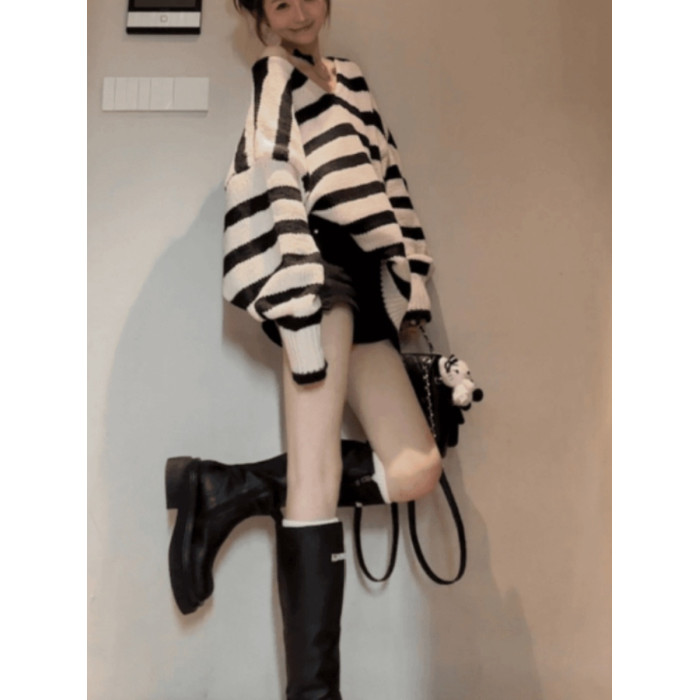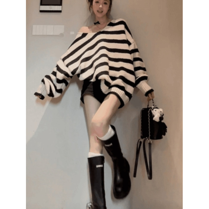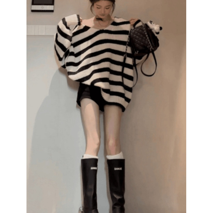 設計感小衆v領針織毛衣女款秋季新款寬鬆顯瘦慵嬾風休閒條紋上衣
