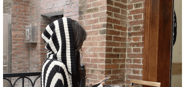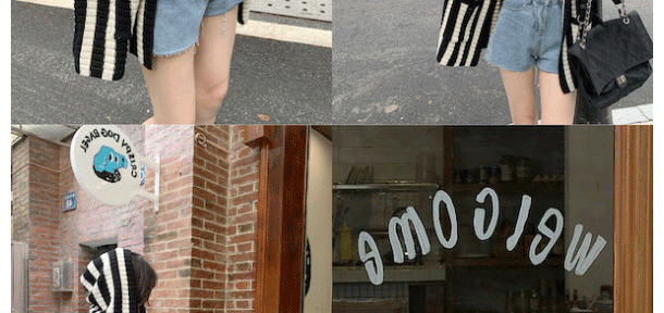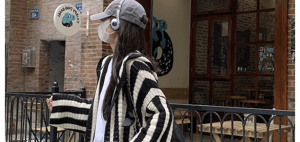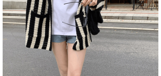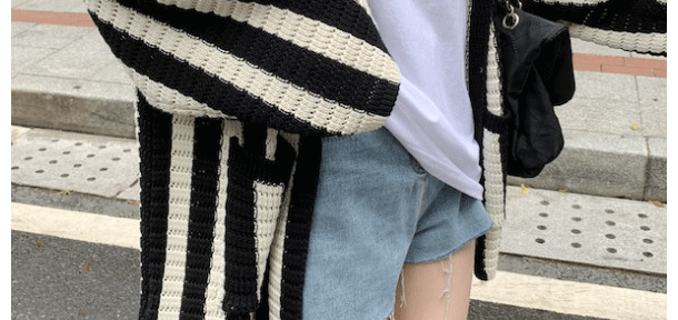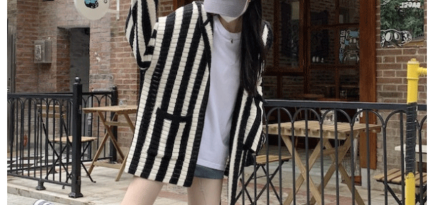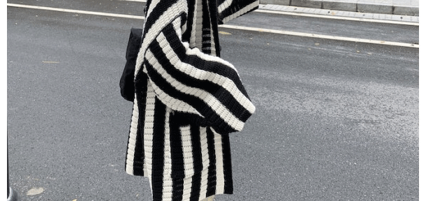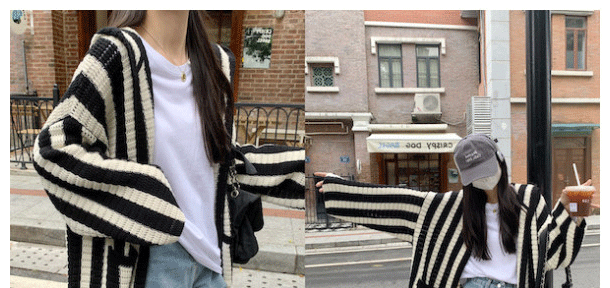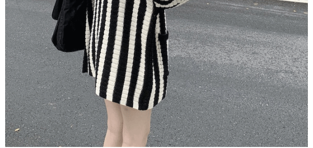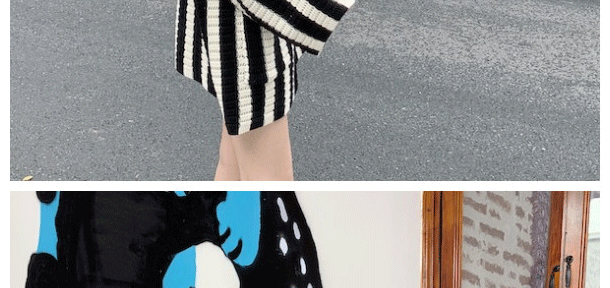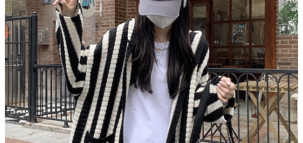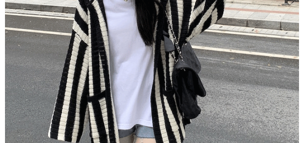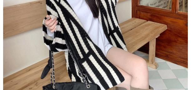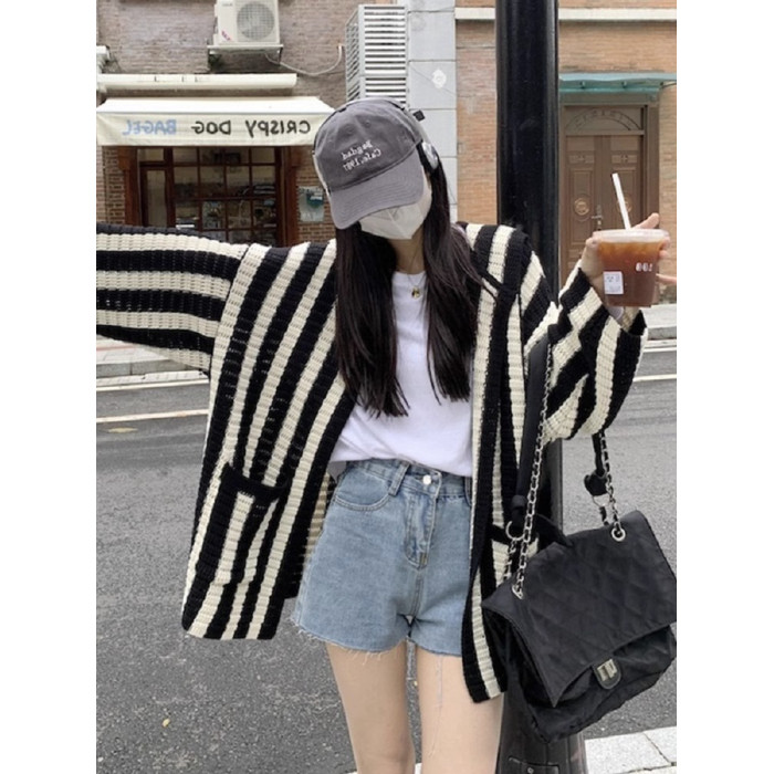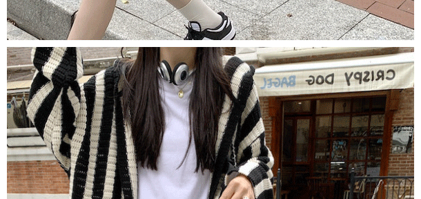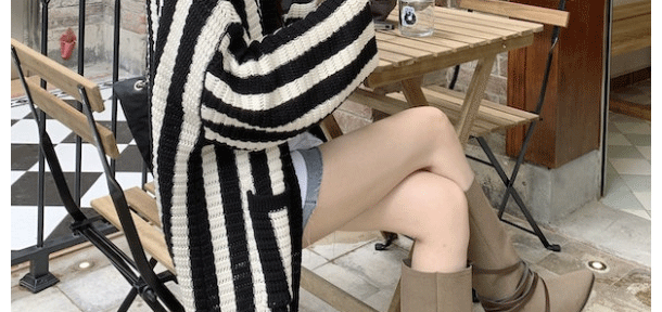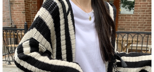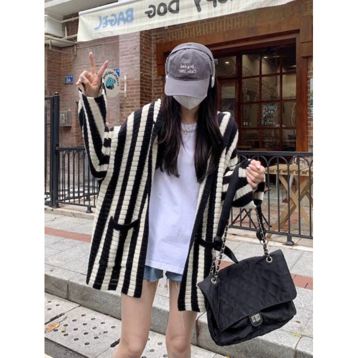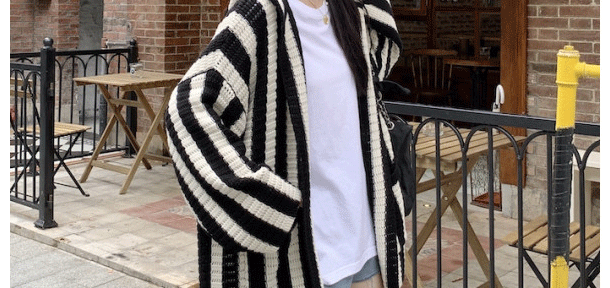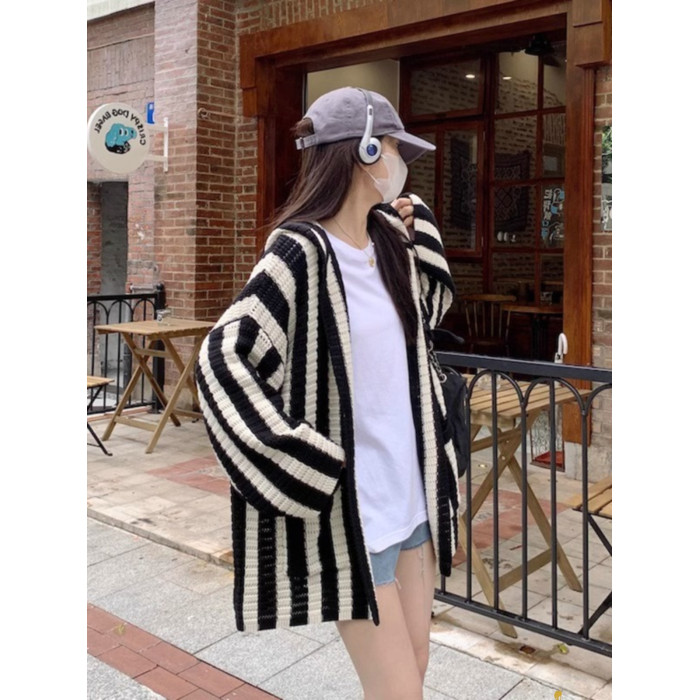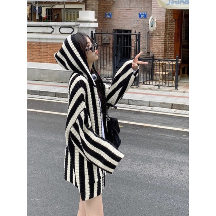 2025秋裝黑白竪條紋連帽外套寬鬆慵嬾中長款針織開衫女休閒大毛衣