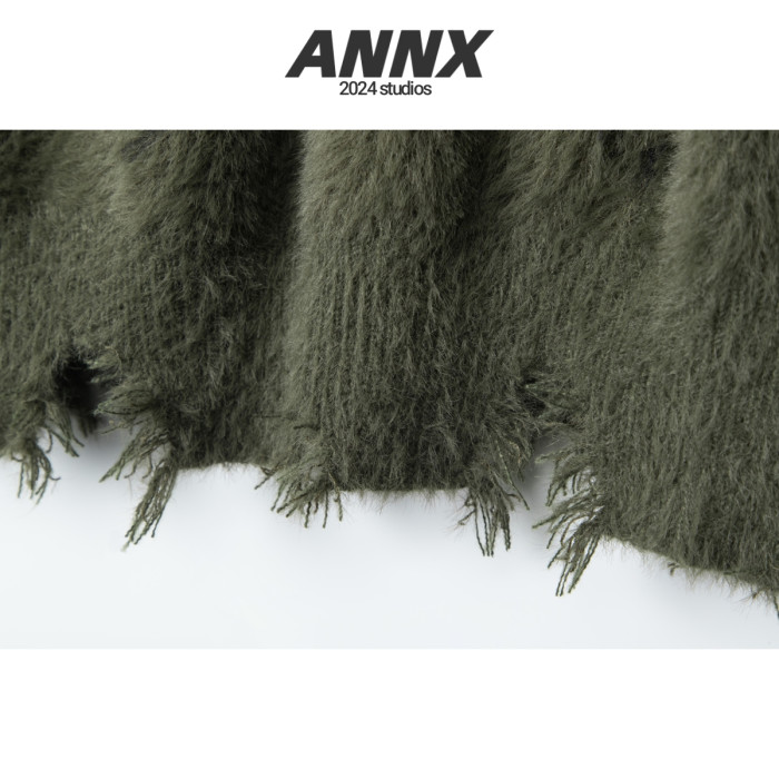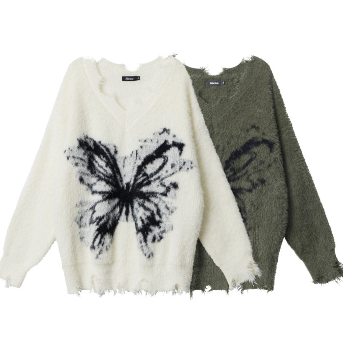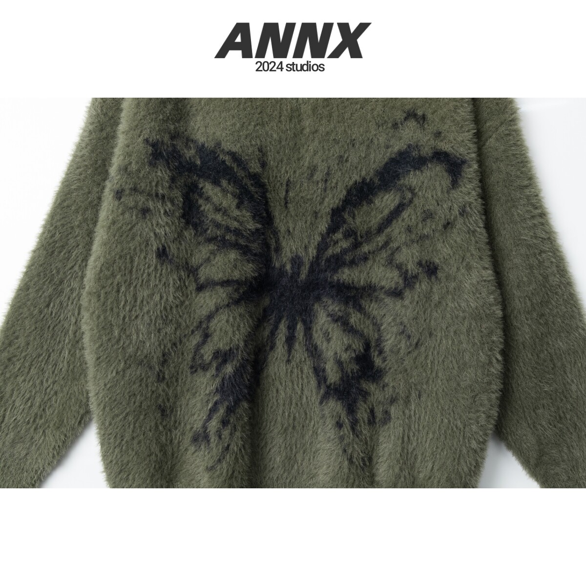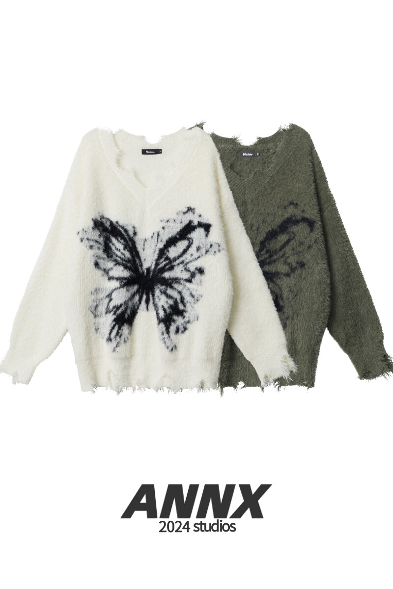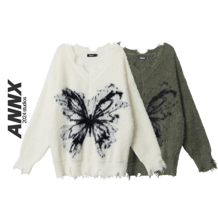 ANNX2026復古毛邊設計感蝴蝶針織衫慵嬾風海馬毛圓領套頭毛衣辣妹