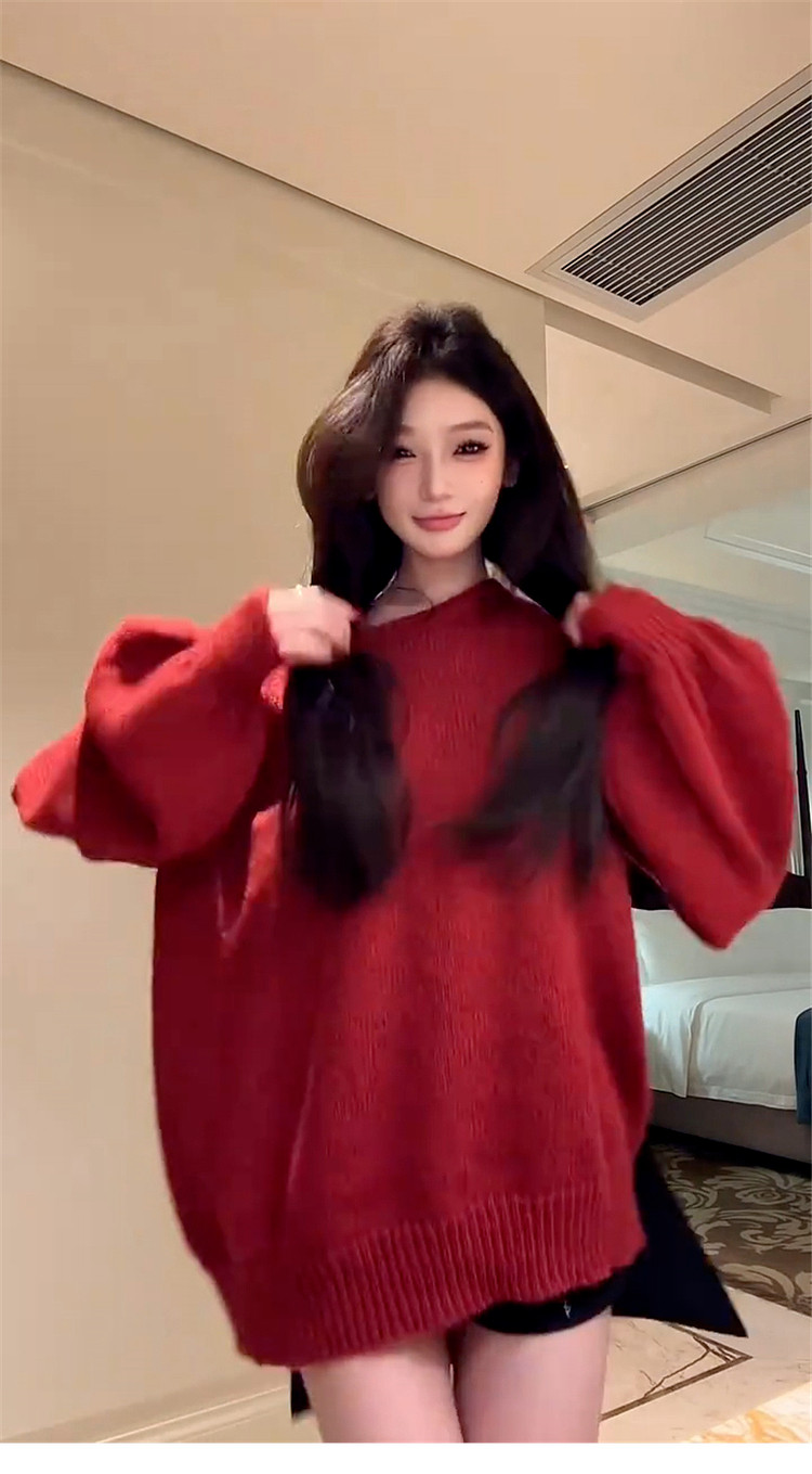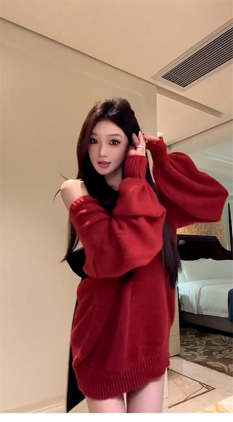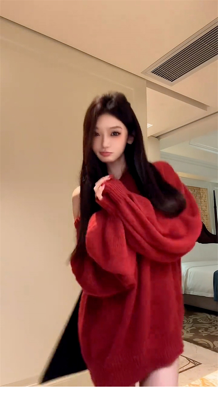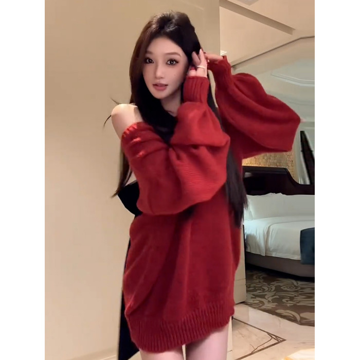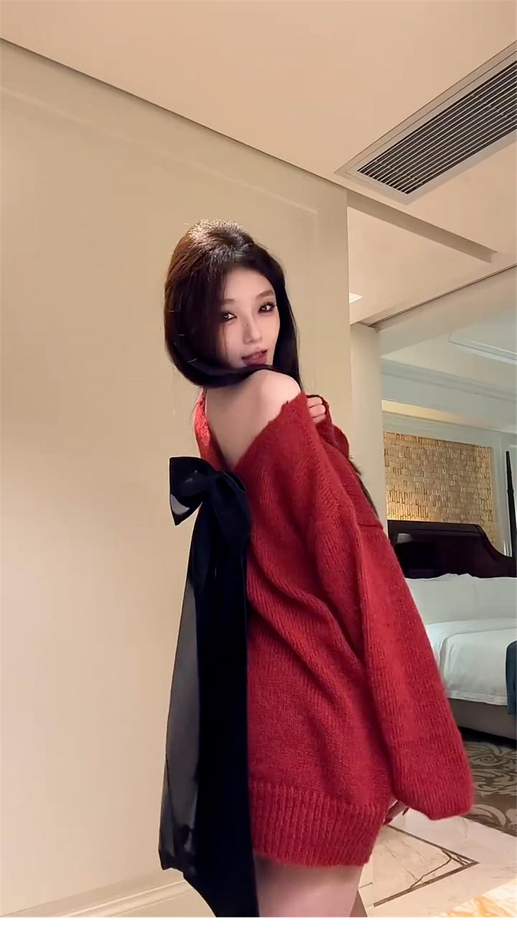 紅色跨年蝴蝶結露背v領毛衣女秋冬2026新款慵嬾風高級感針織上衣