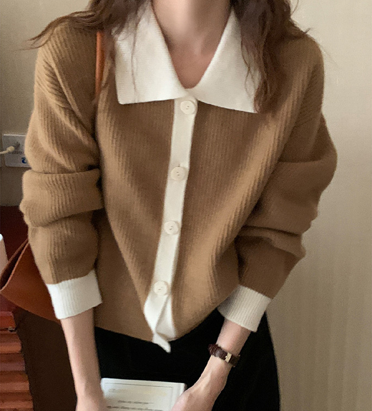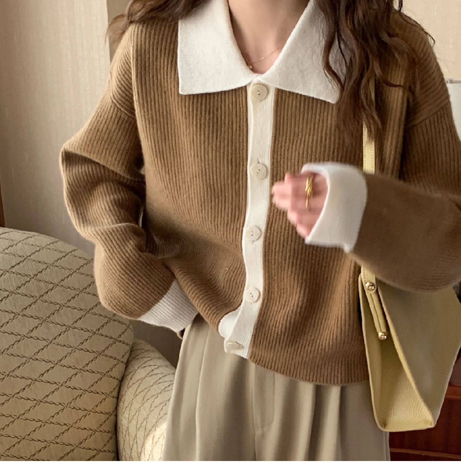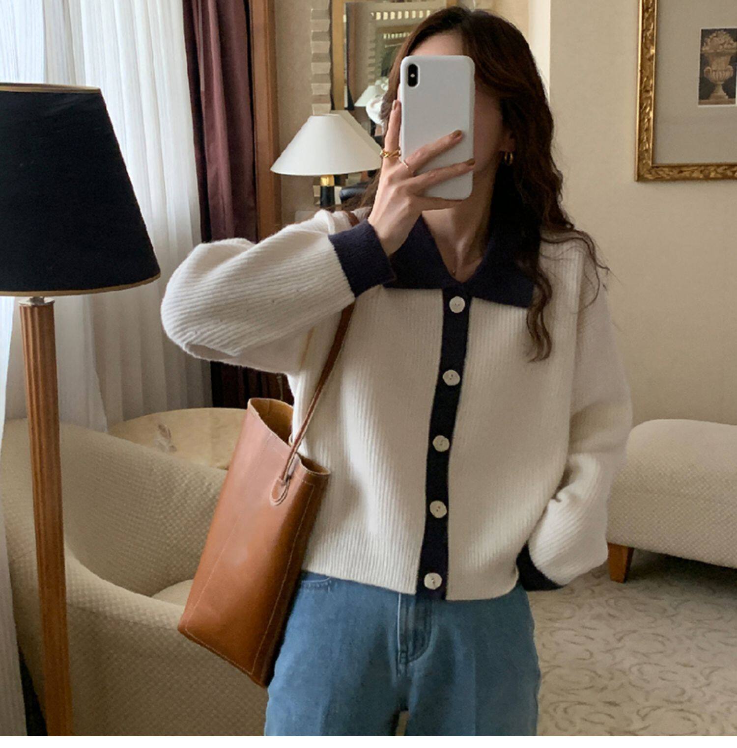 復古翻領撞色針織開衫女短款長袖慵懶寬松polo領米白色毛衣外套冬