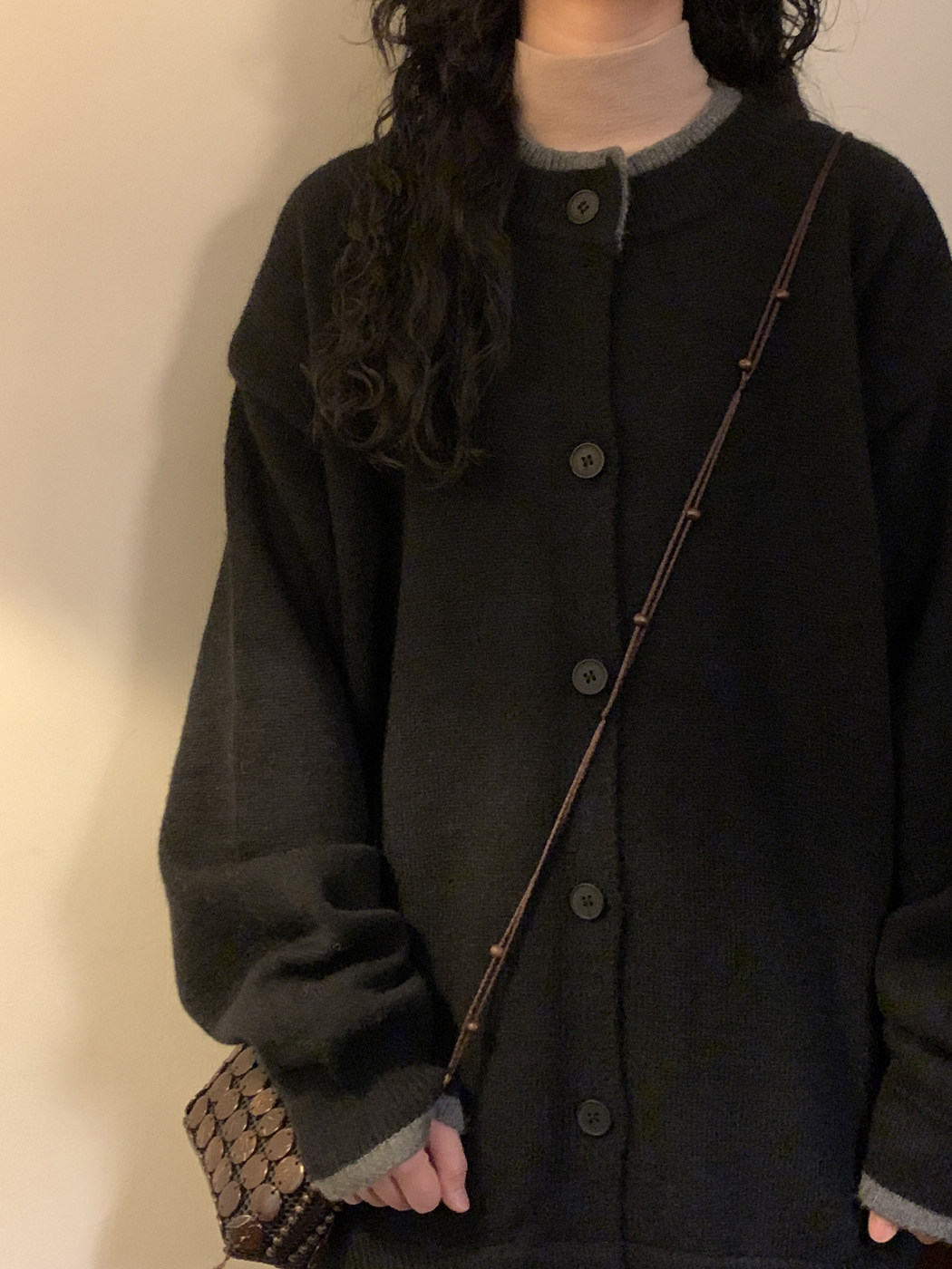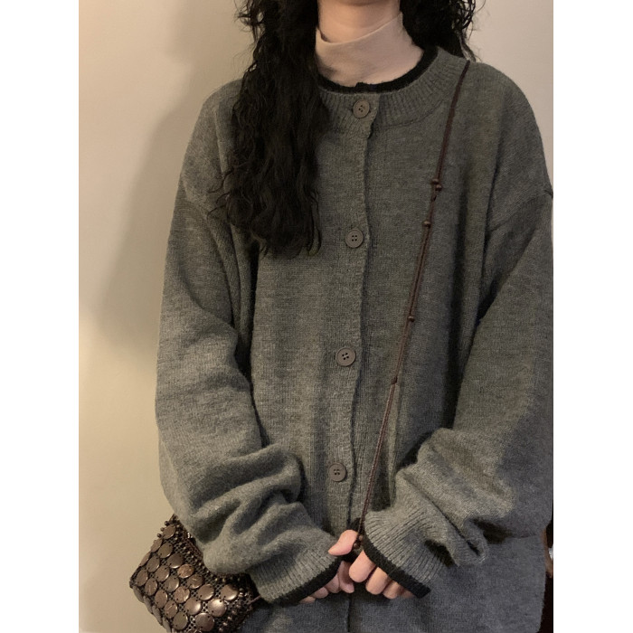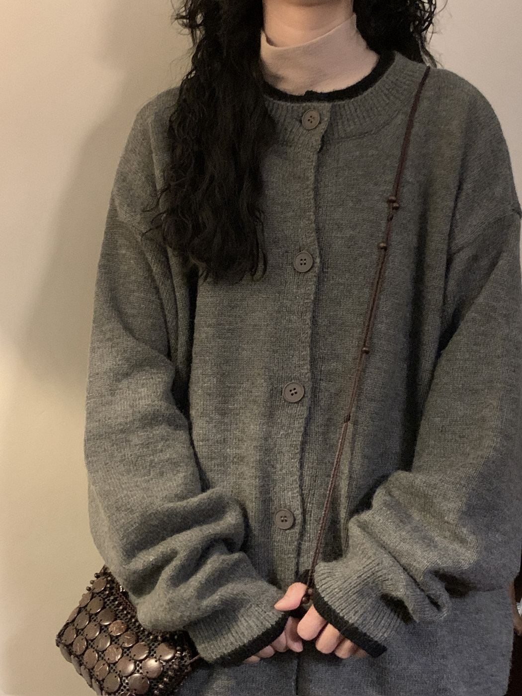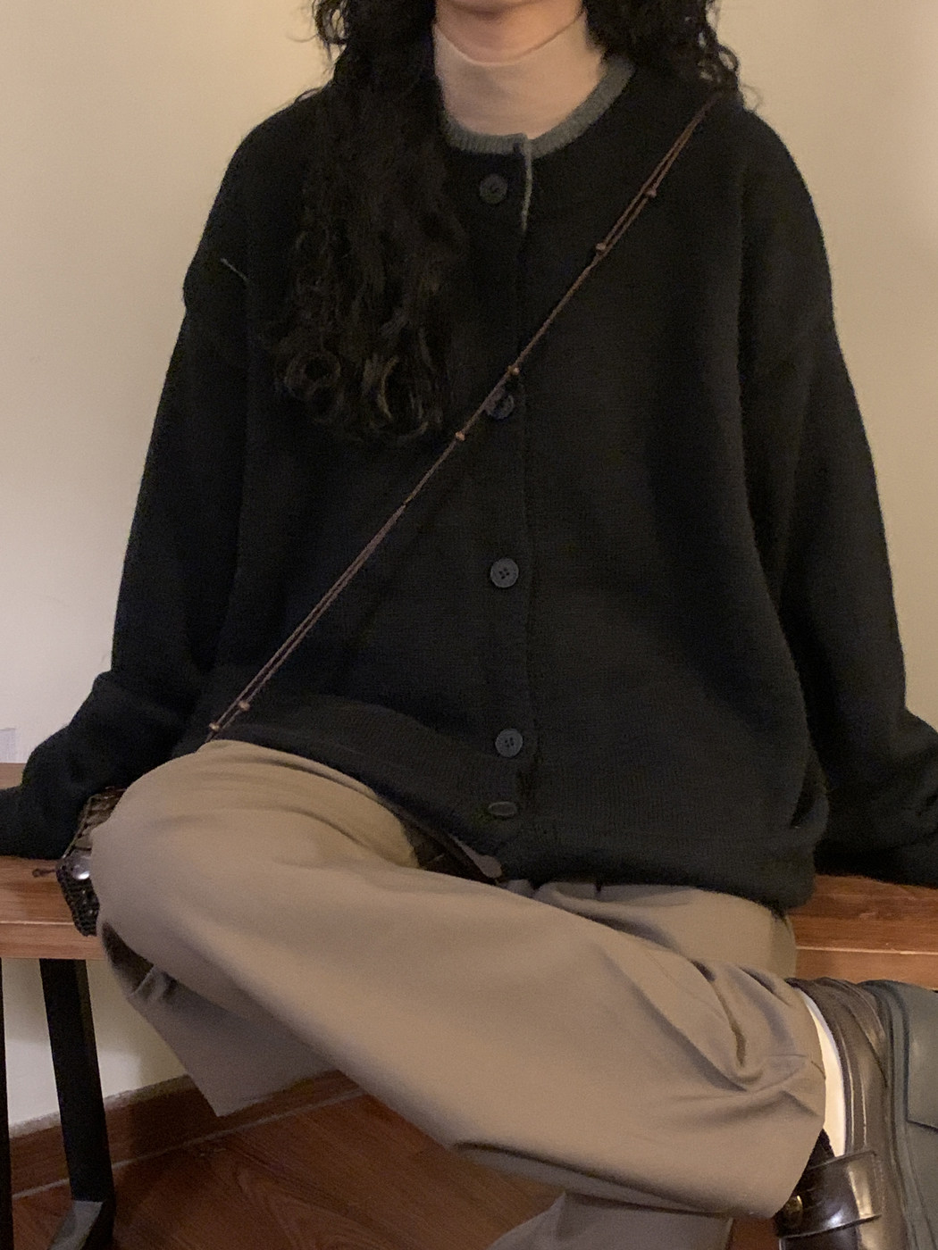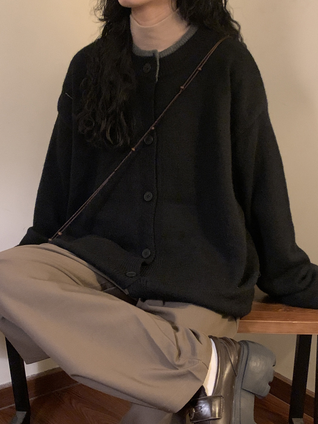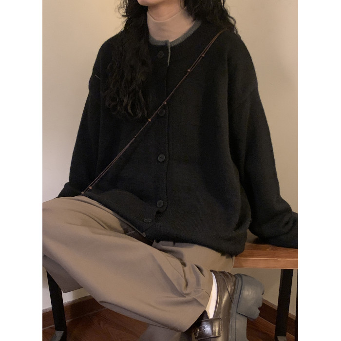 NAGA自製美式復古純色慵懶風休閒百搭圓領針織開衫毛衣簡約外套女