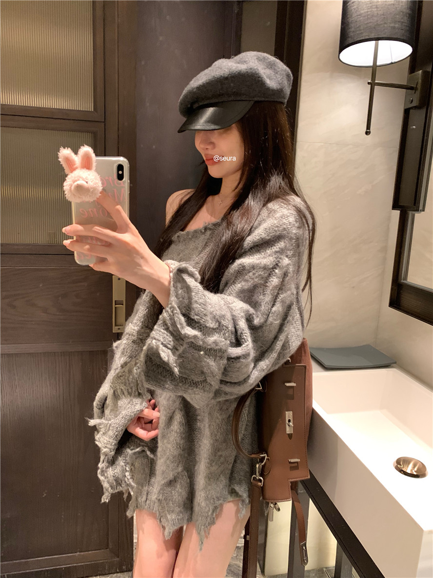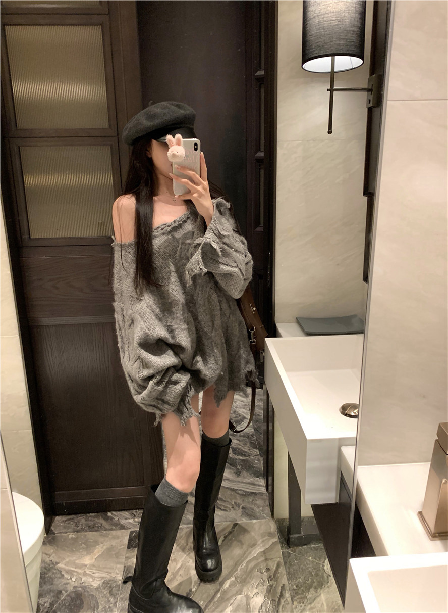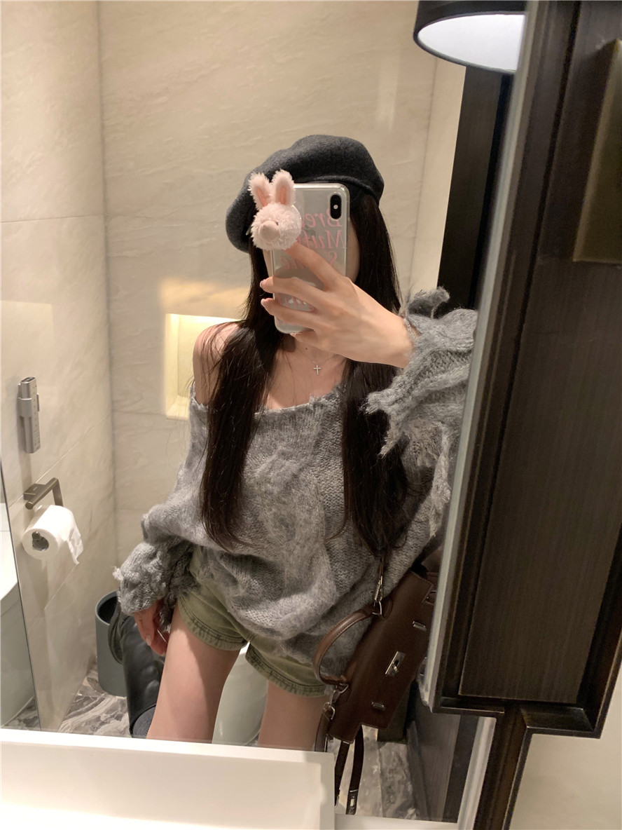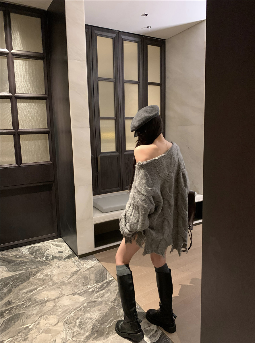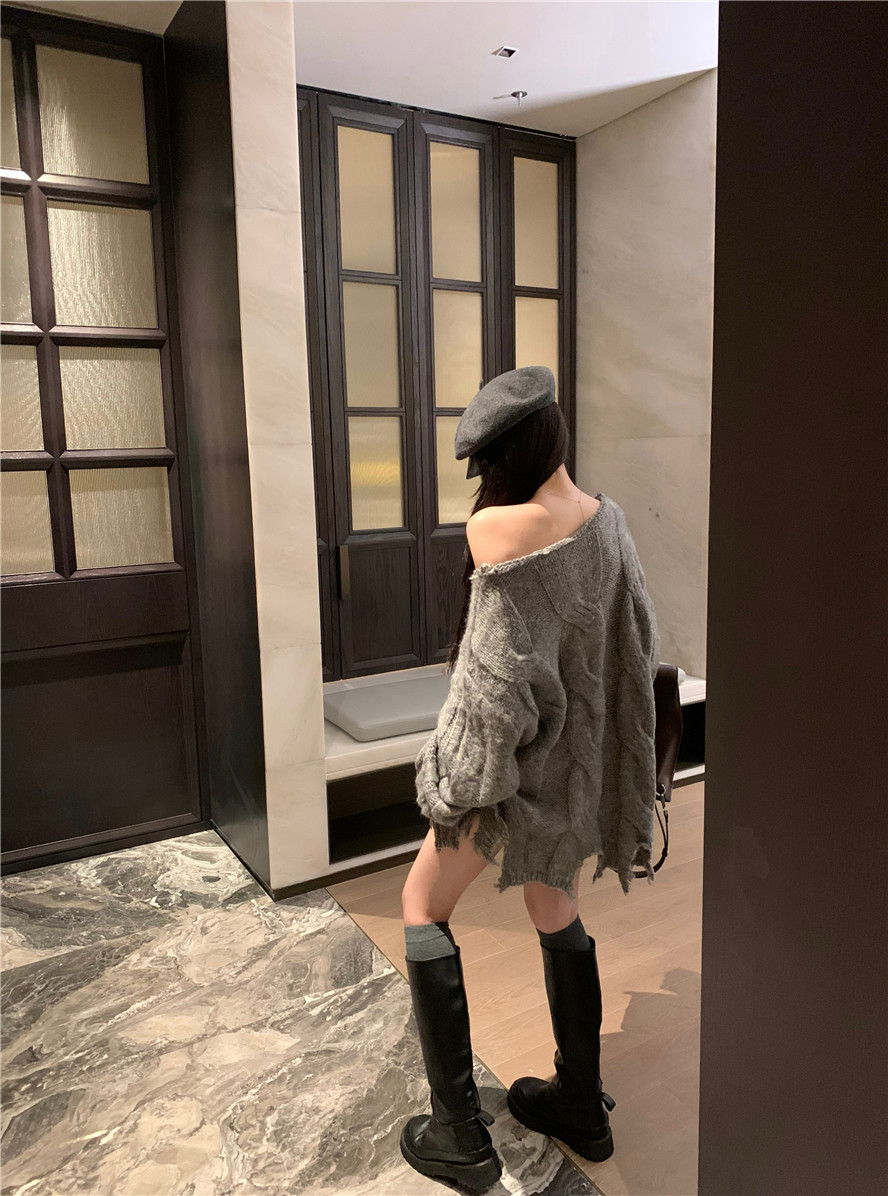 破洞麻花灰色毛衣女秋冬新款設計感小衆寬松外穿慵懶風針織衫上衣