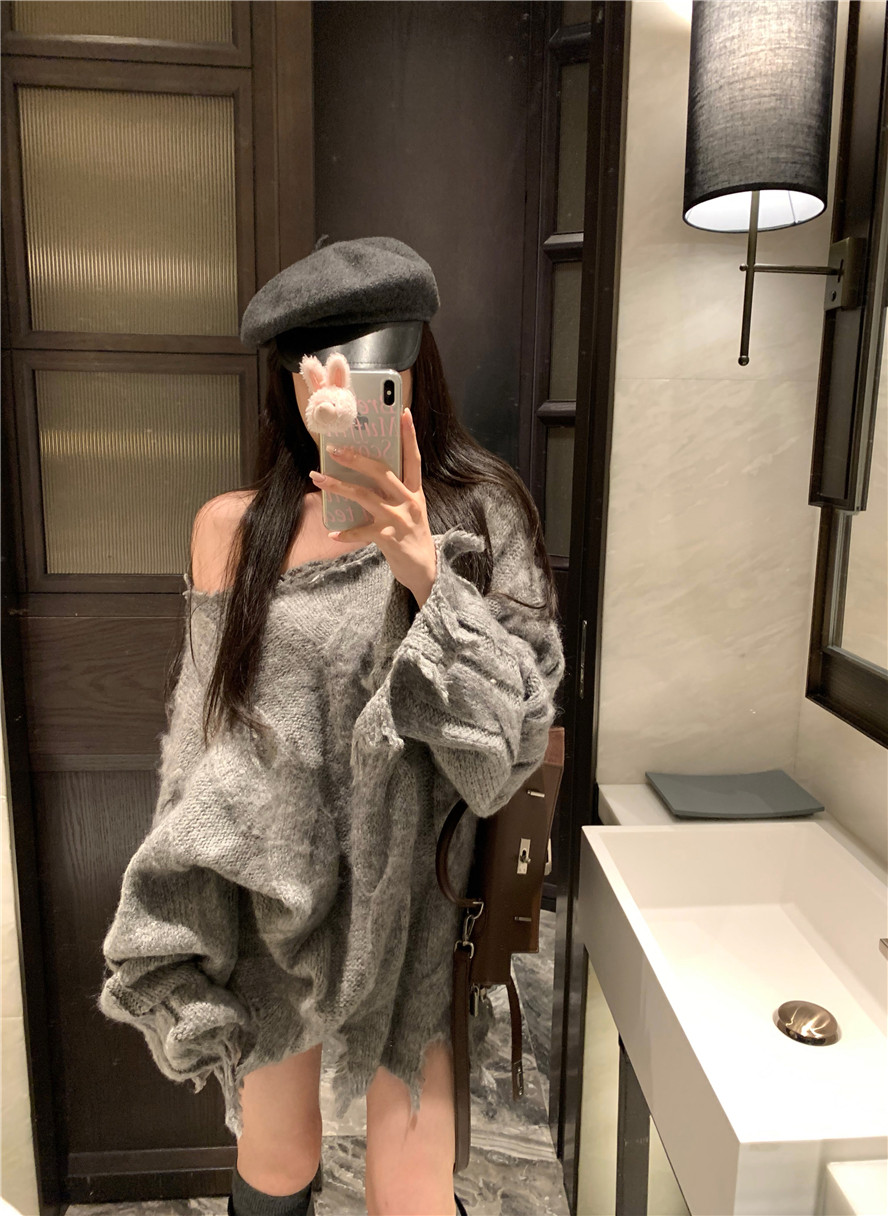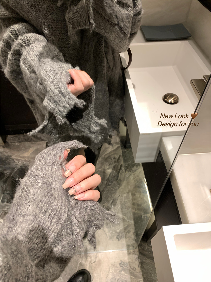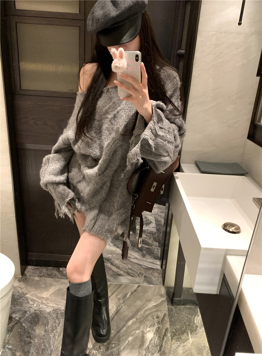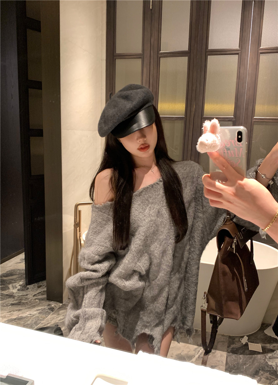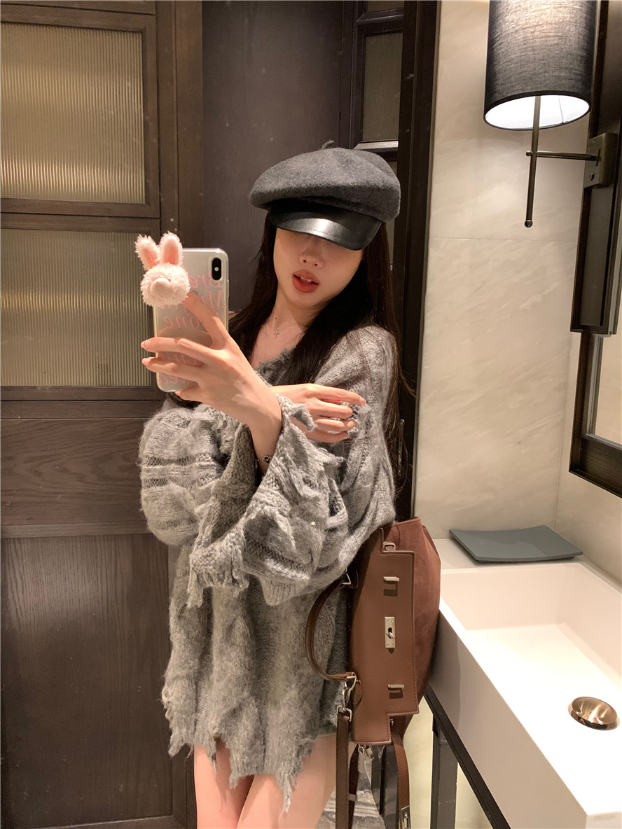 破洞麻花灰色毛衣女秋冬新款設計感小衆寬松外穿慵懶風針織衫上衣