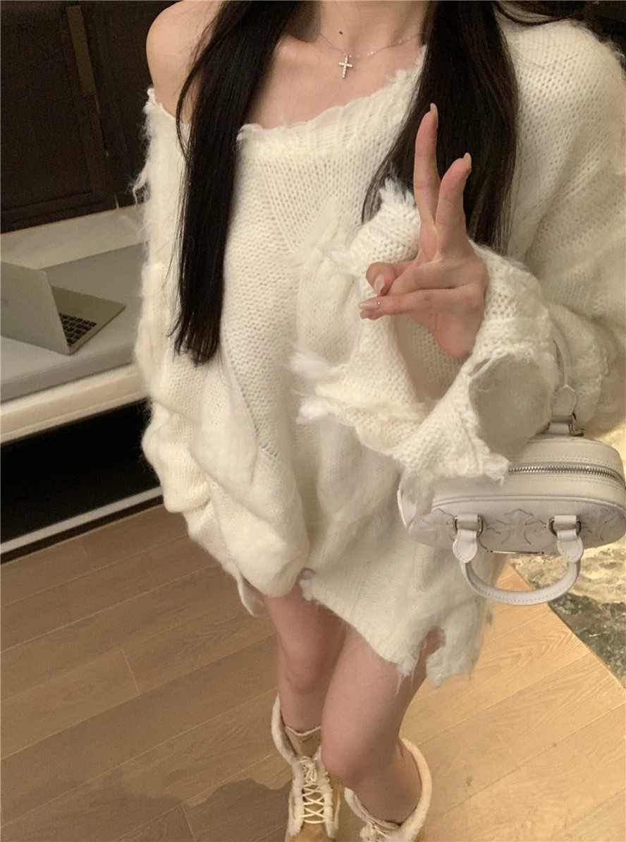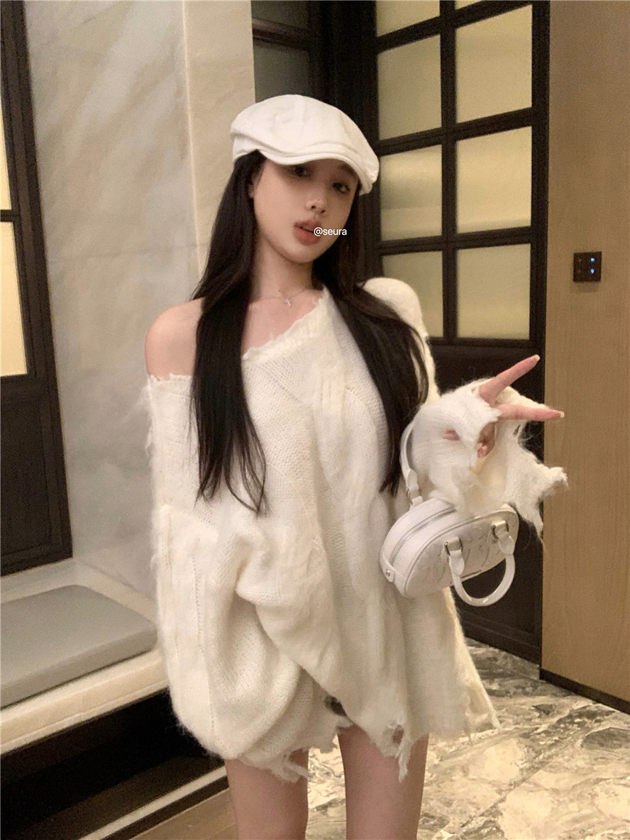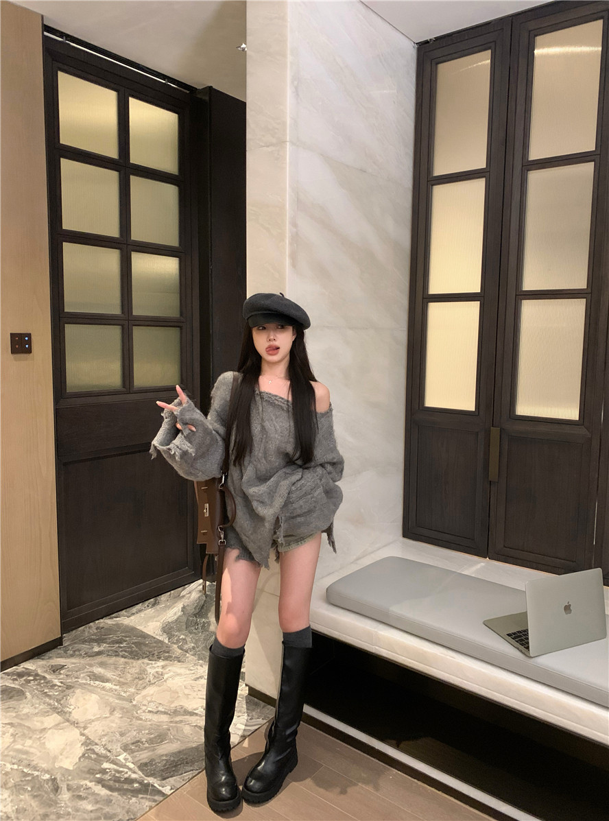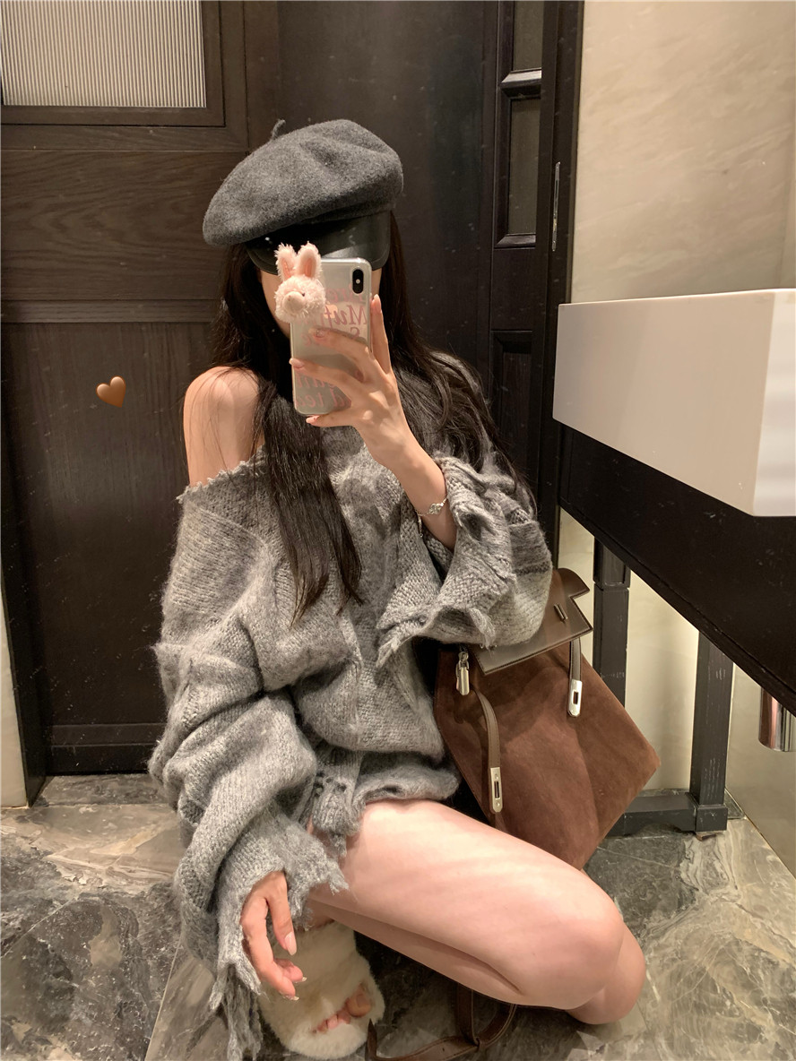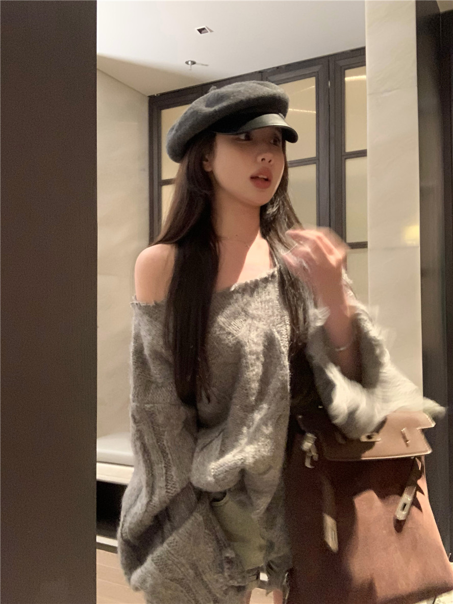 破洞麻花灰色毛衣女秋冬新款設計感小衆寬松外穿慵懶風針織衫上衣