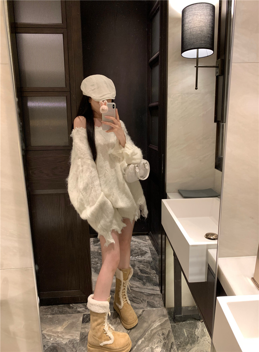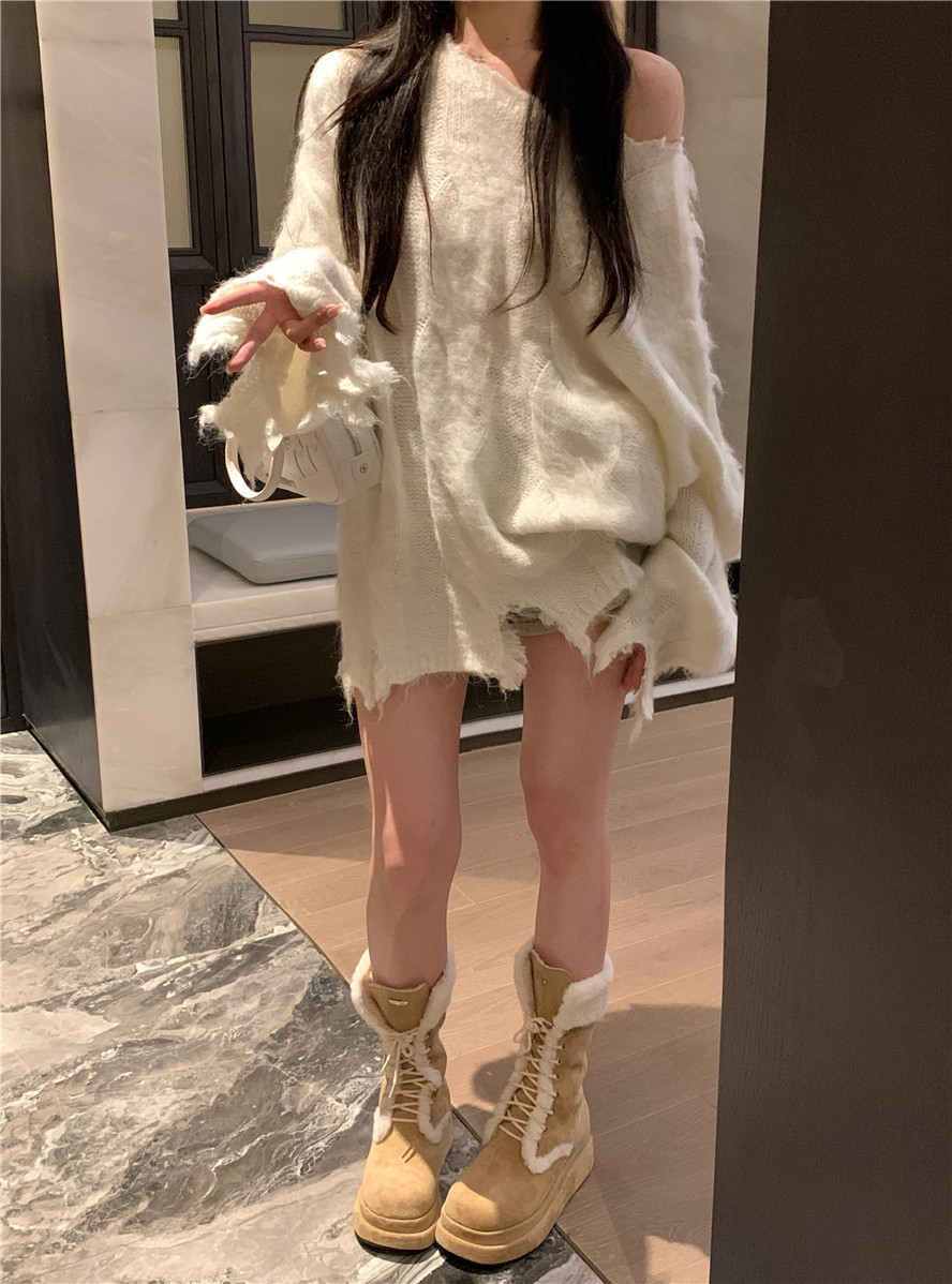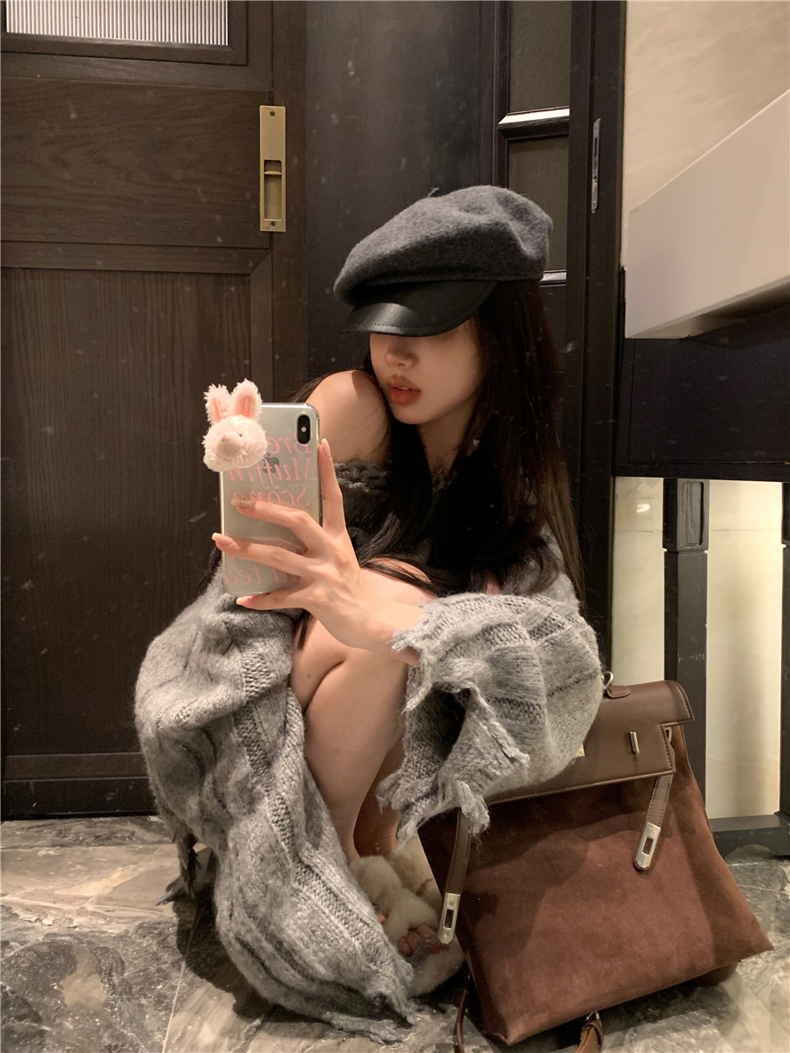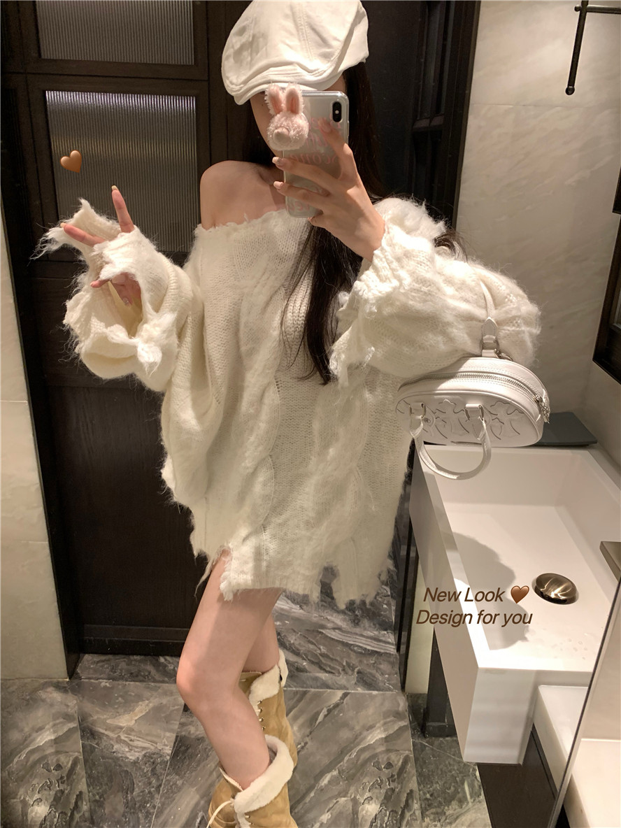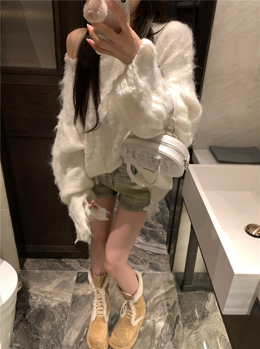 破洞麻花灰色毛衣女秋冬新款設計感小衆寬松外穿慵懶風針織衫上衣