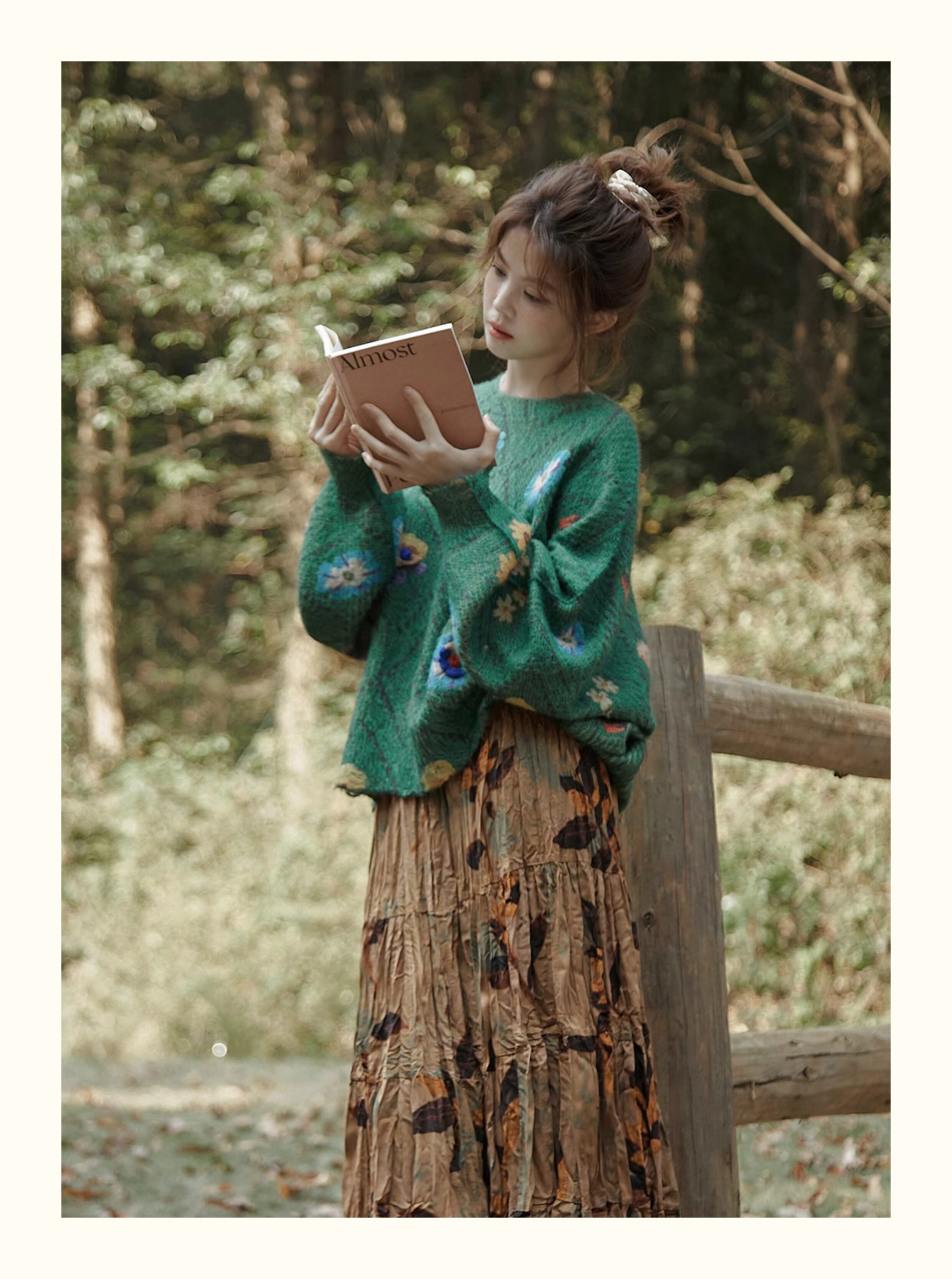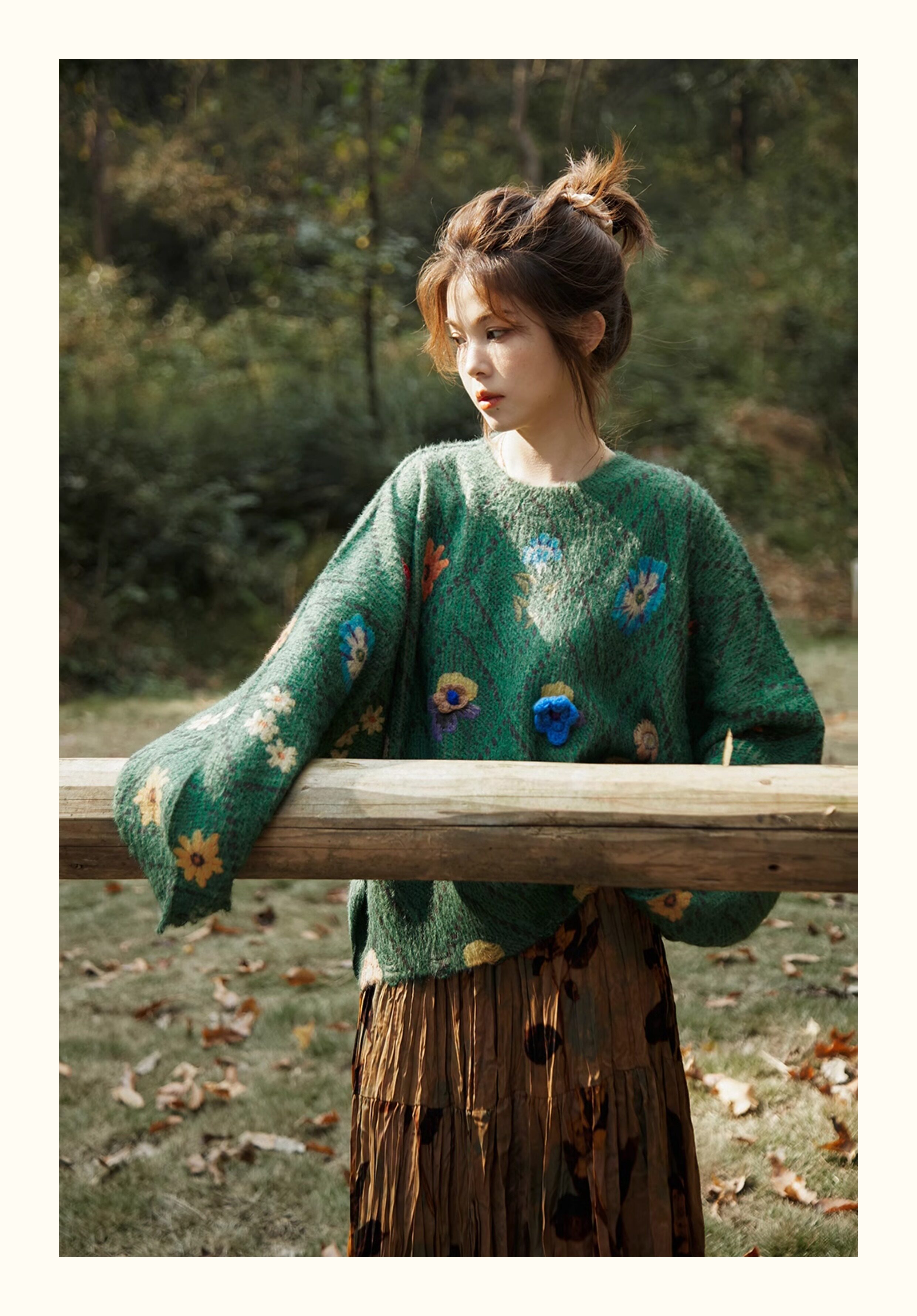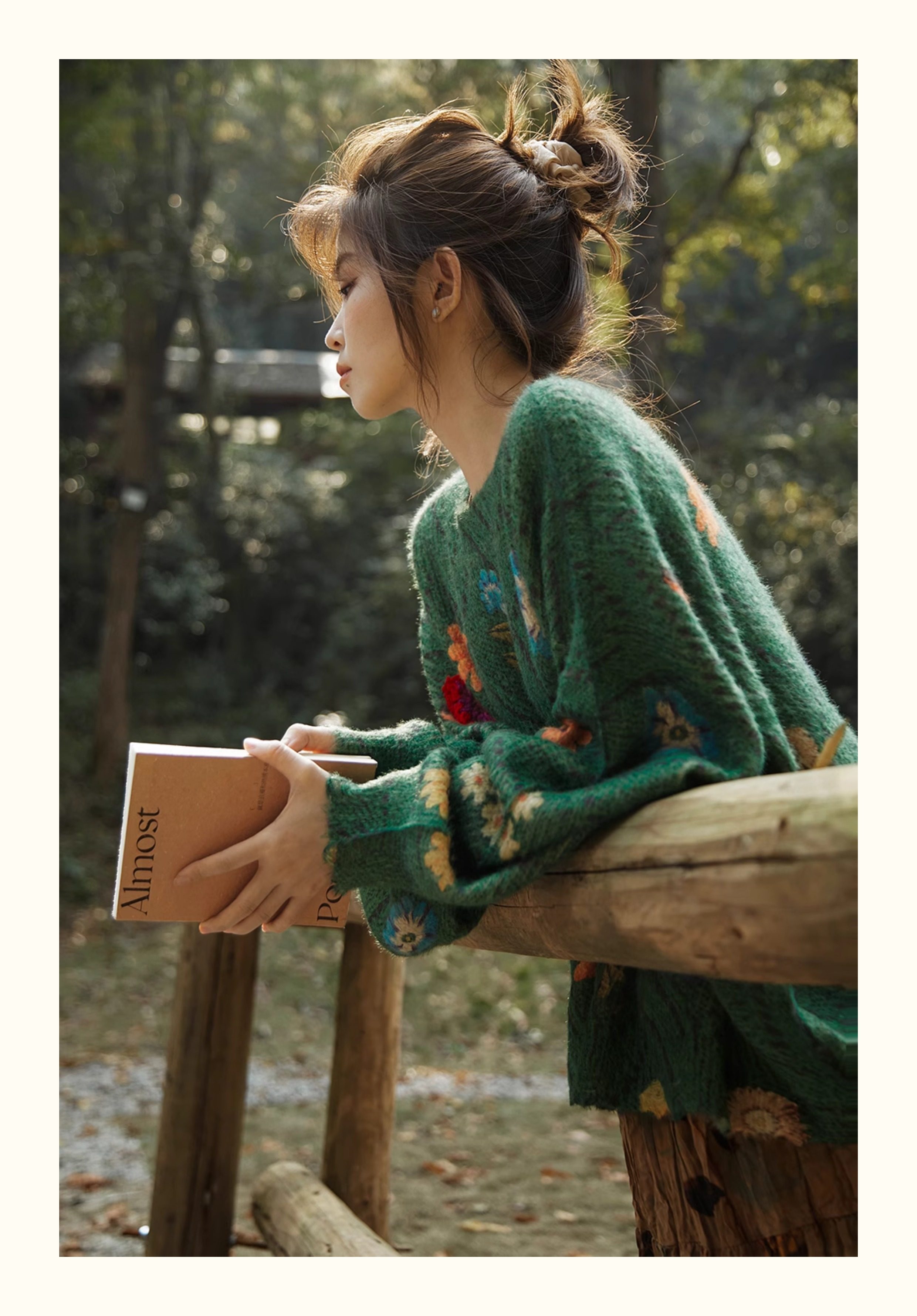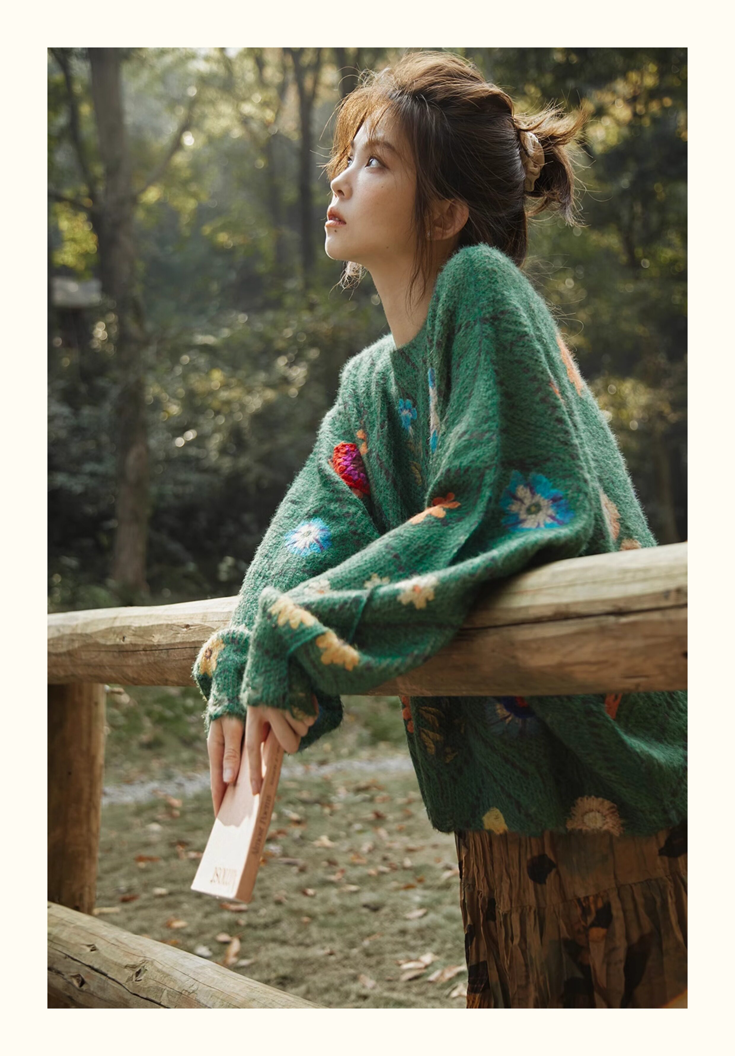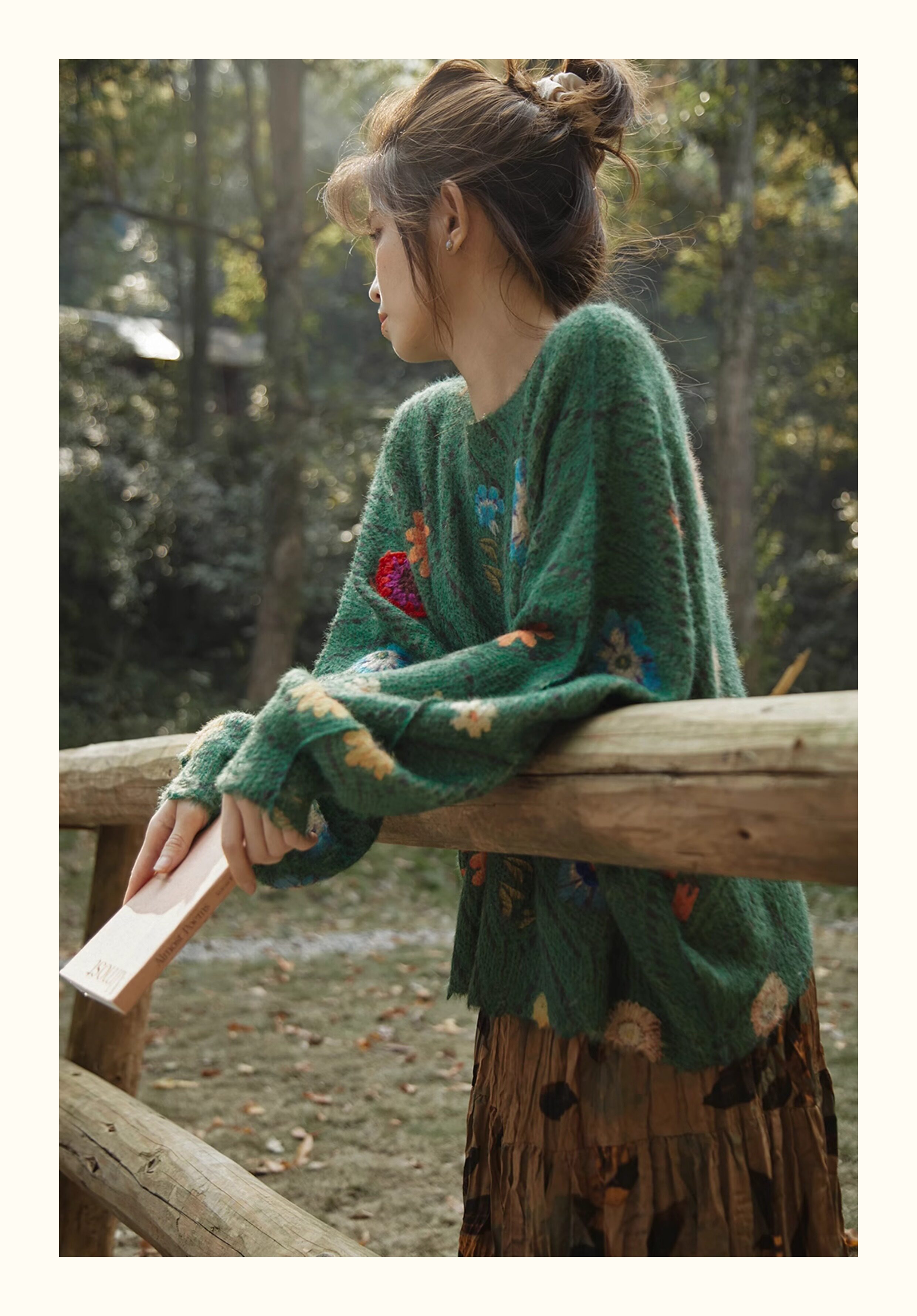 水草不鹹Dannn 草地綠色花朵燈籠袖針織慵懶軟軟糯糯秋冬毛衣女