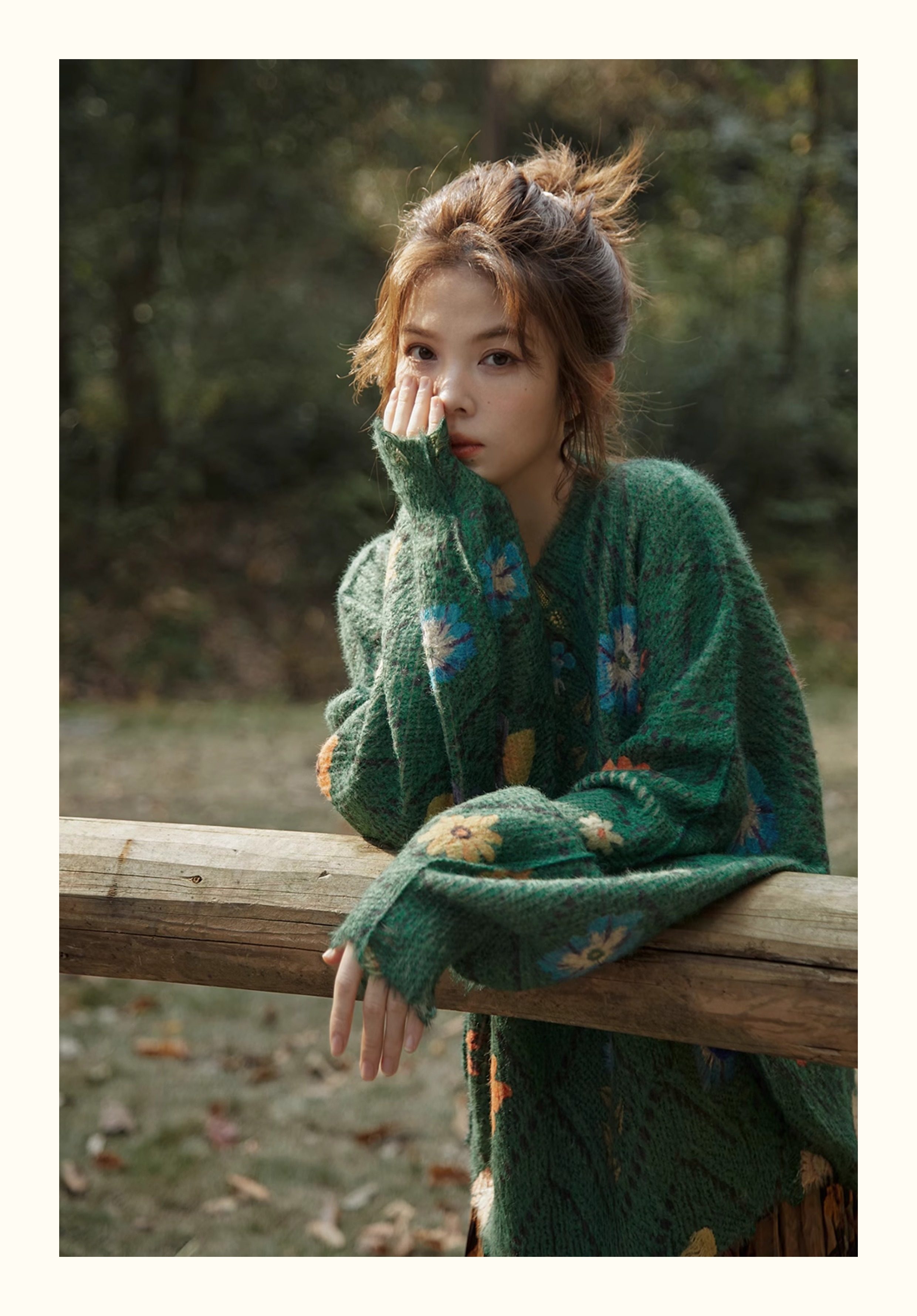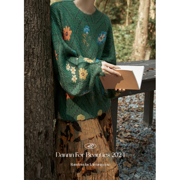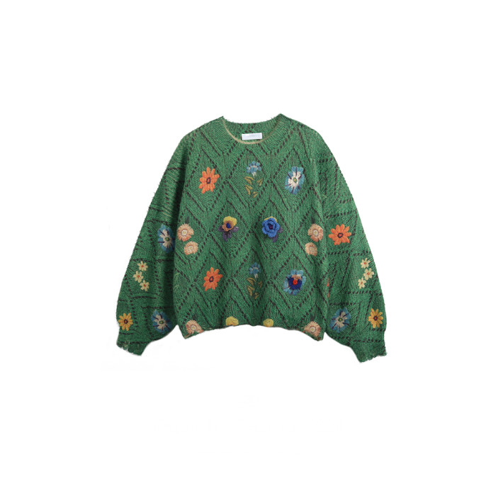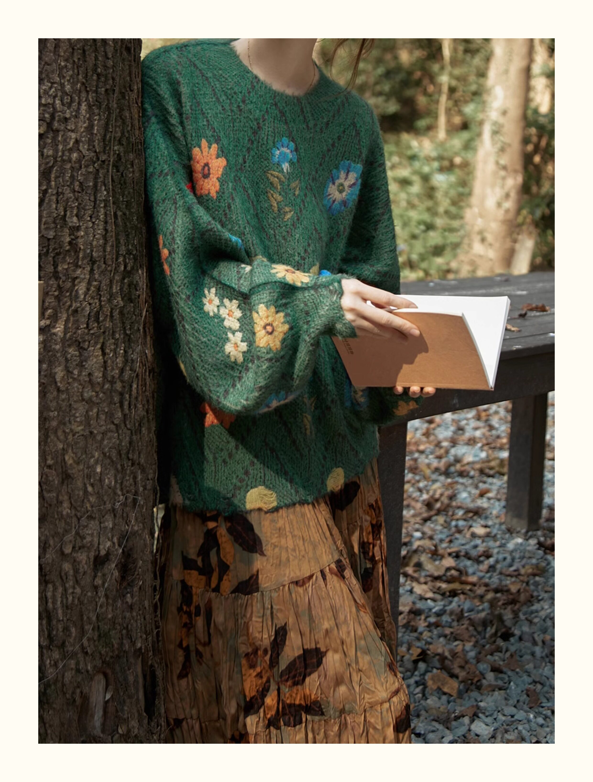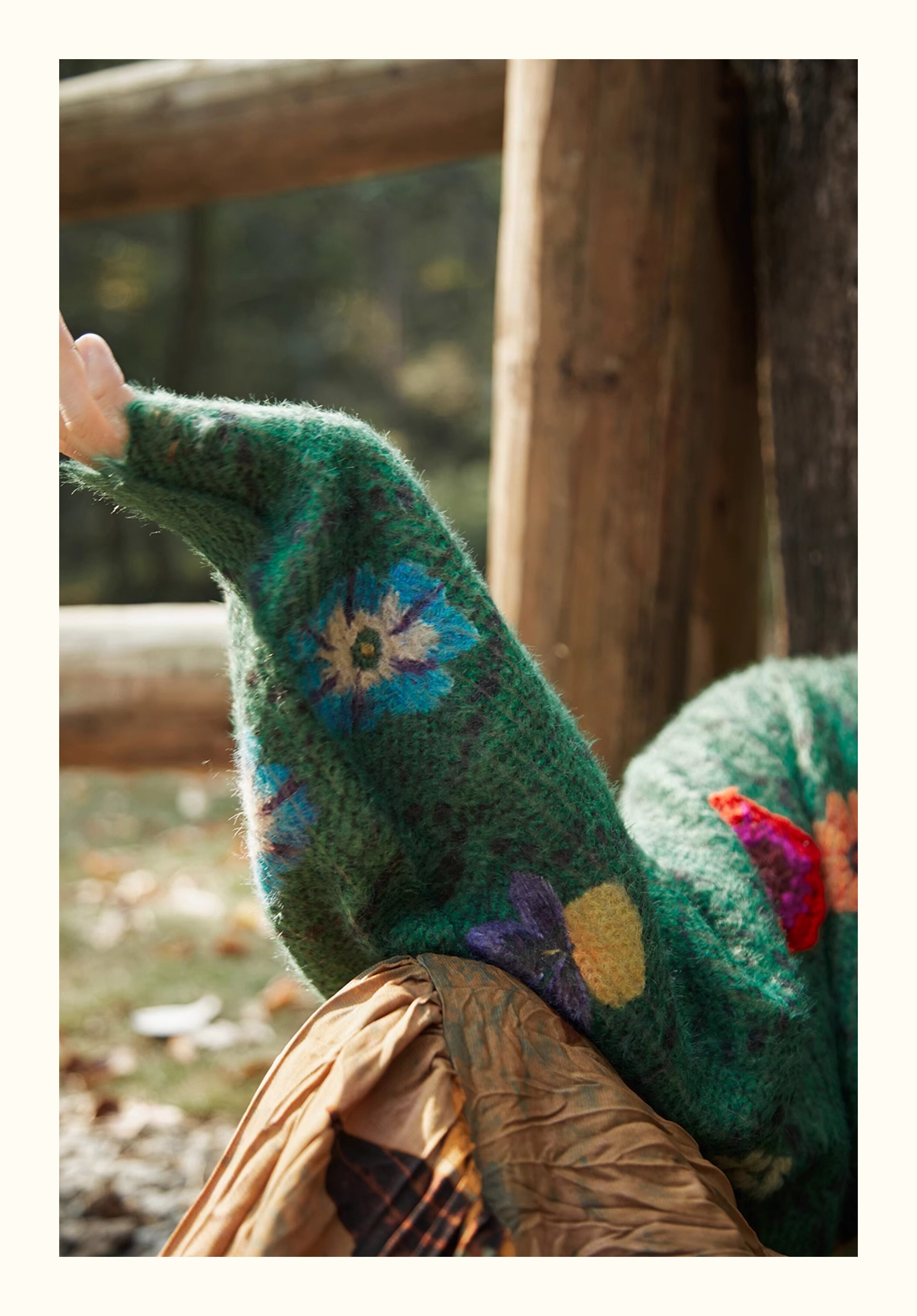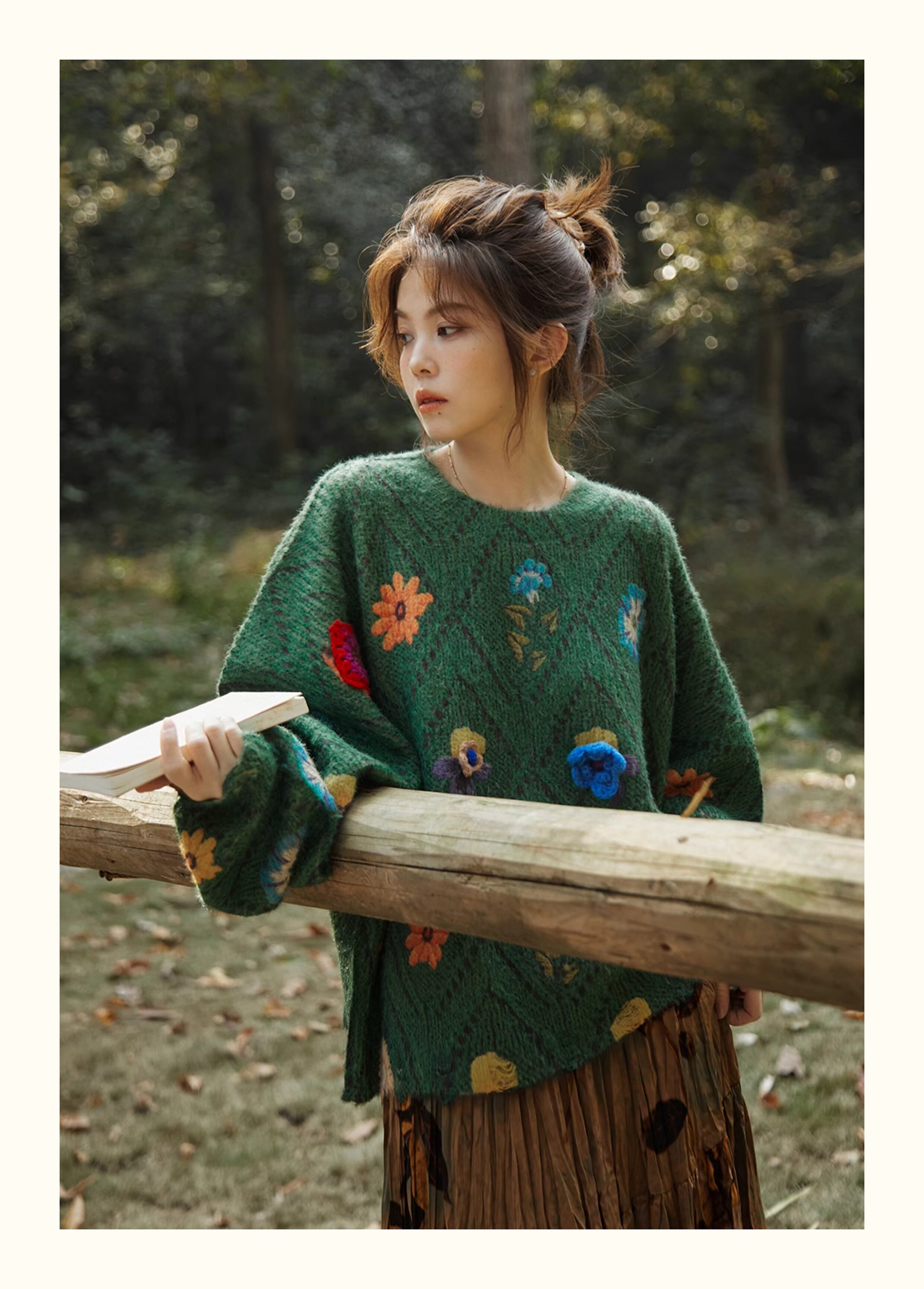 水草不鹹Dannn 草地綠色花朵燈籠袖針織慵懶軟軟糯糯秋冬毛衣女