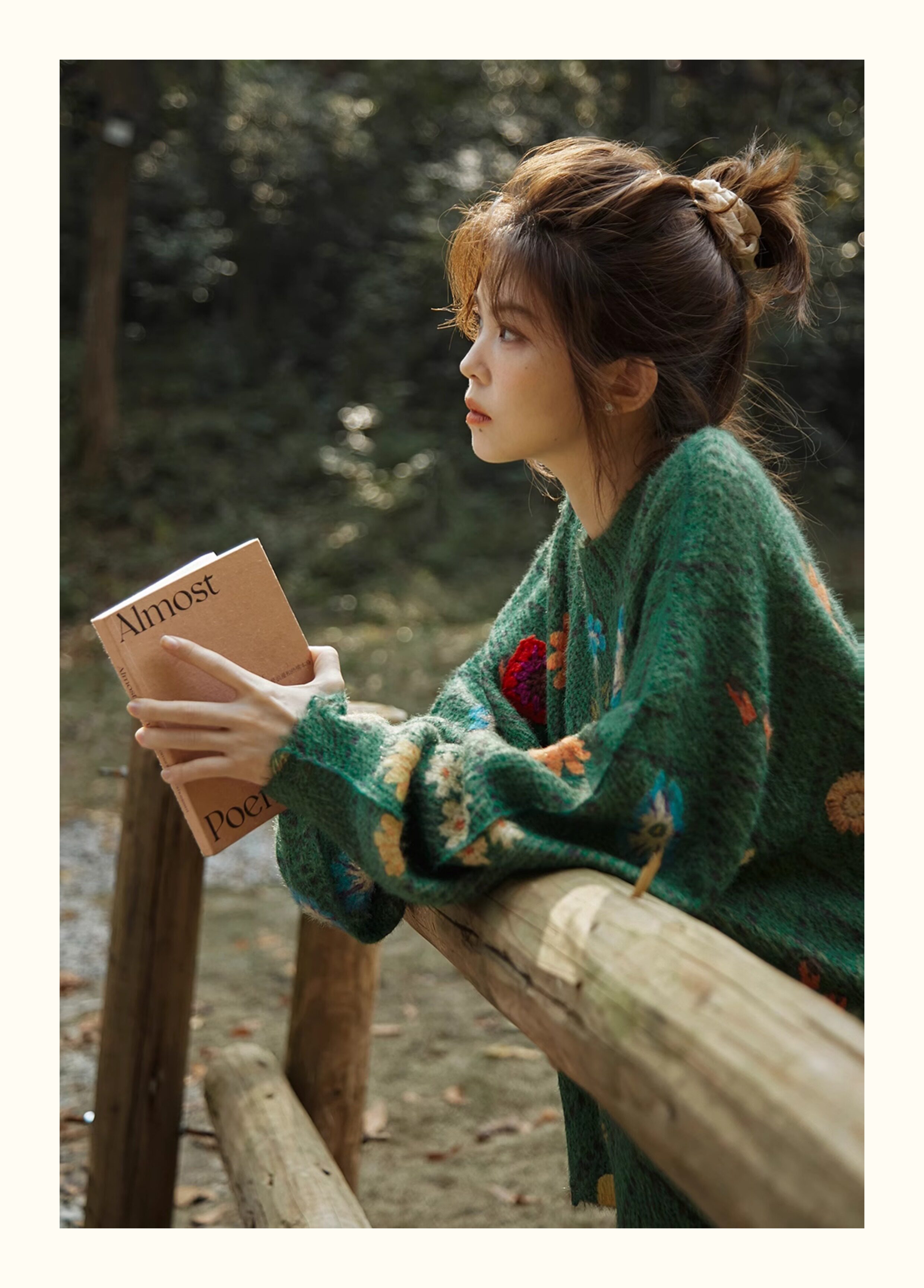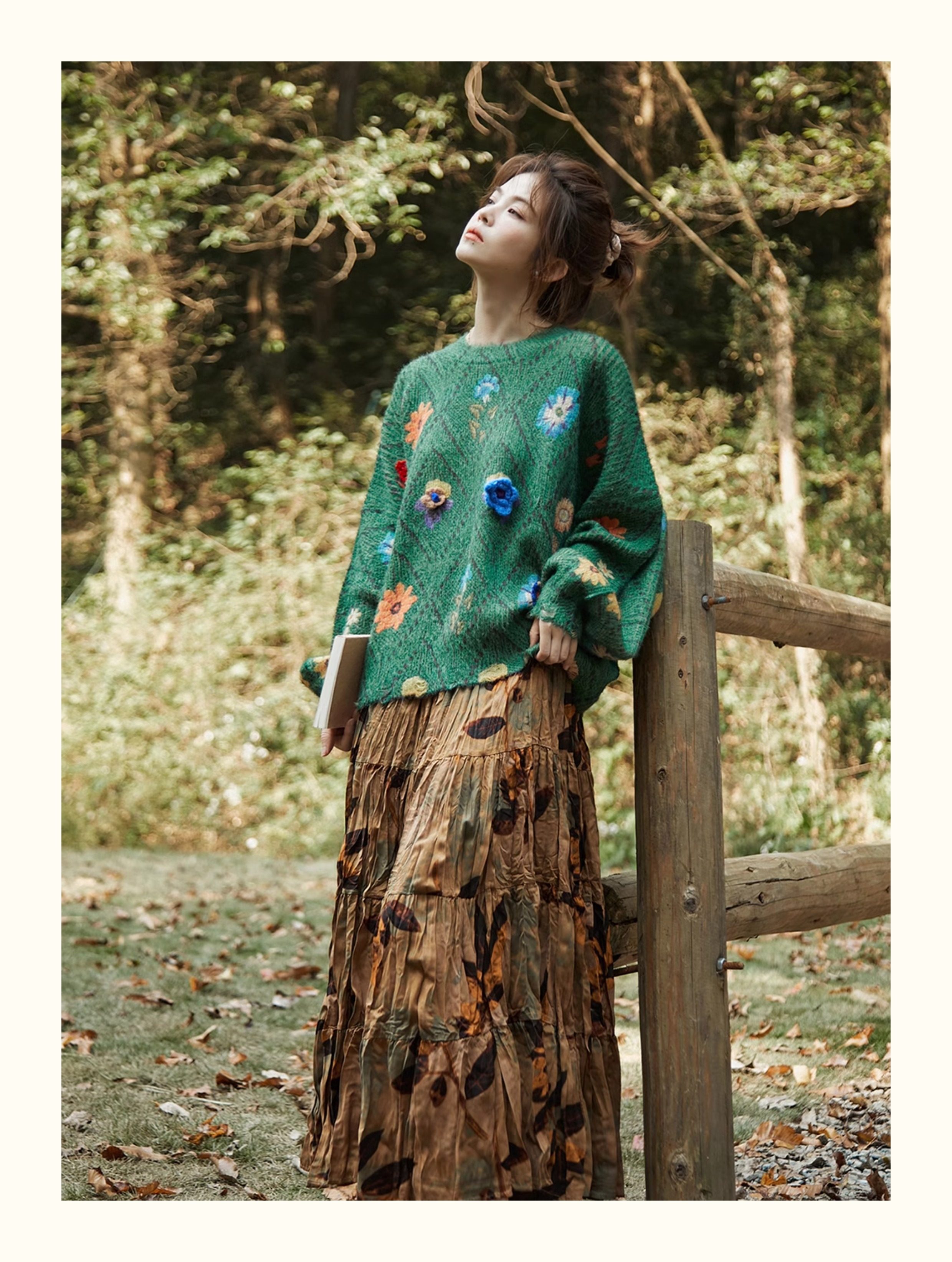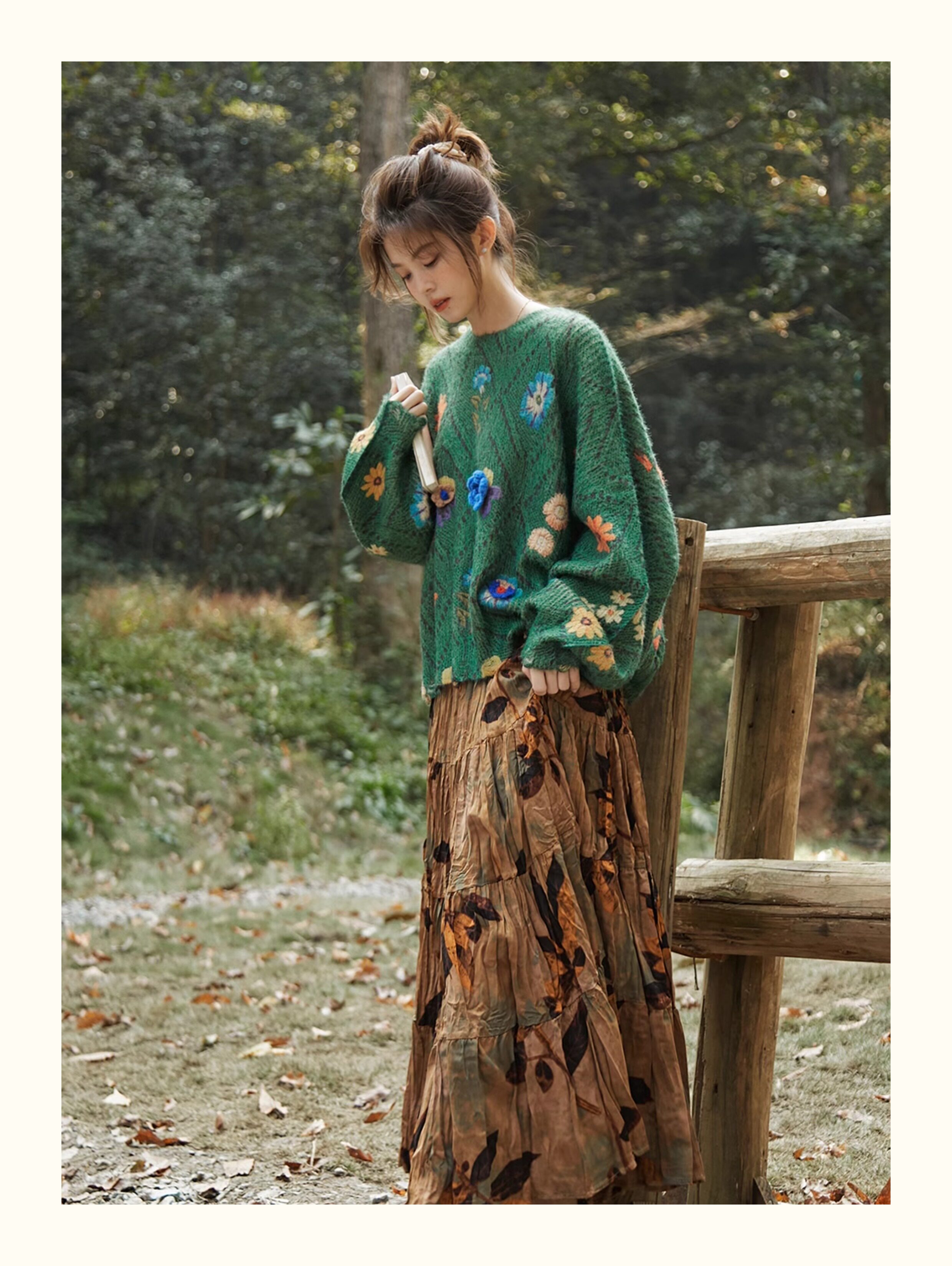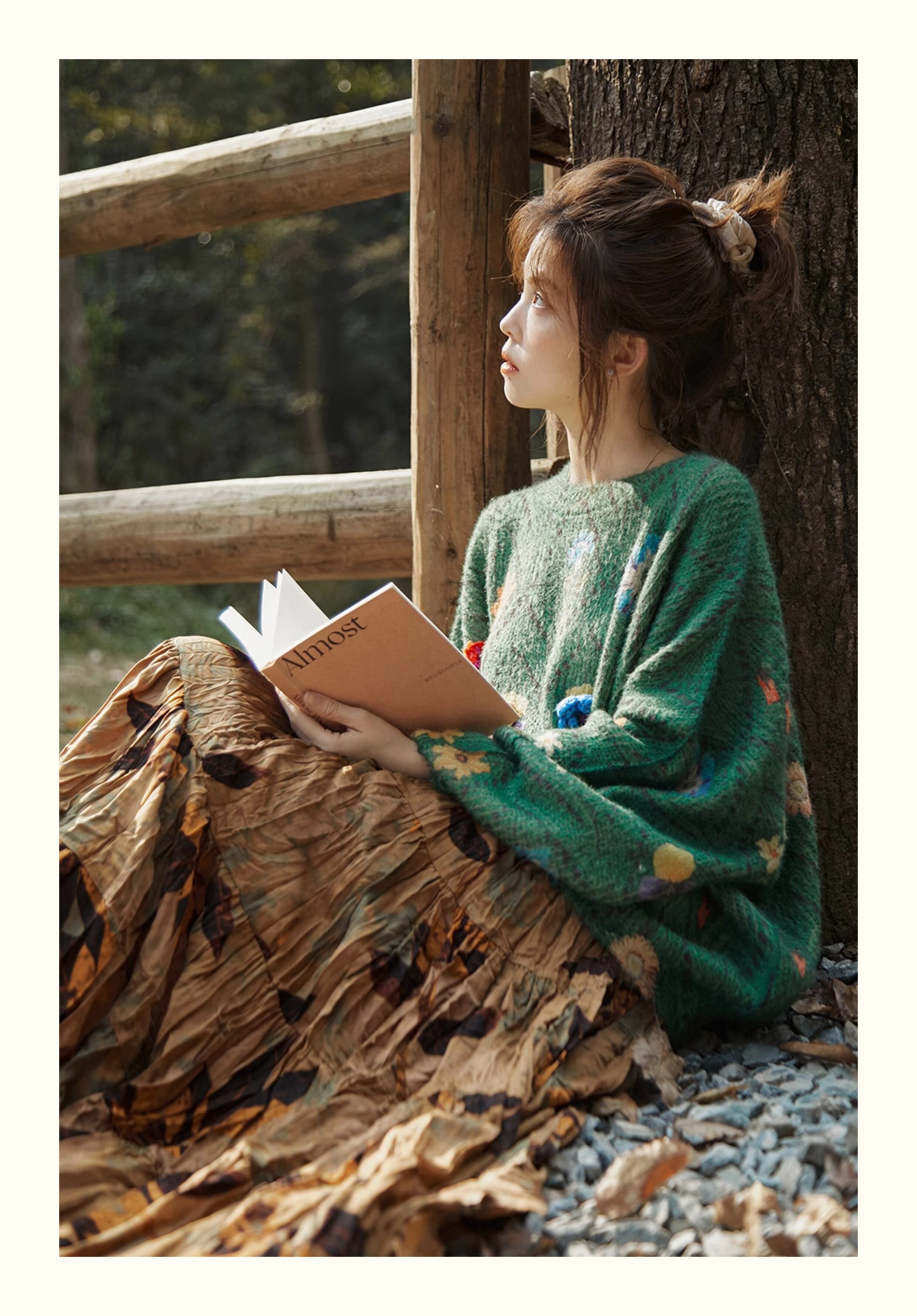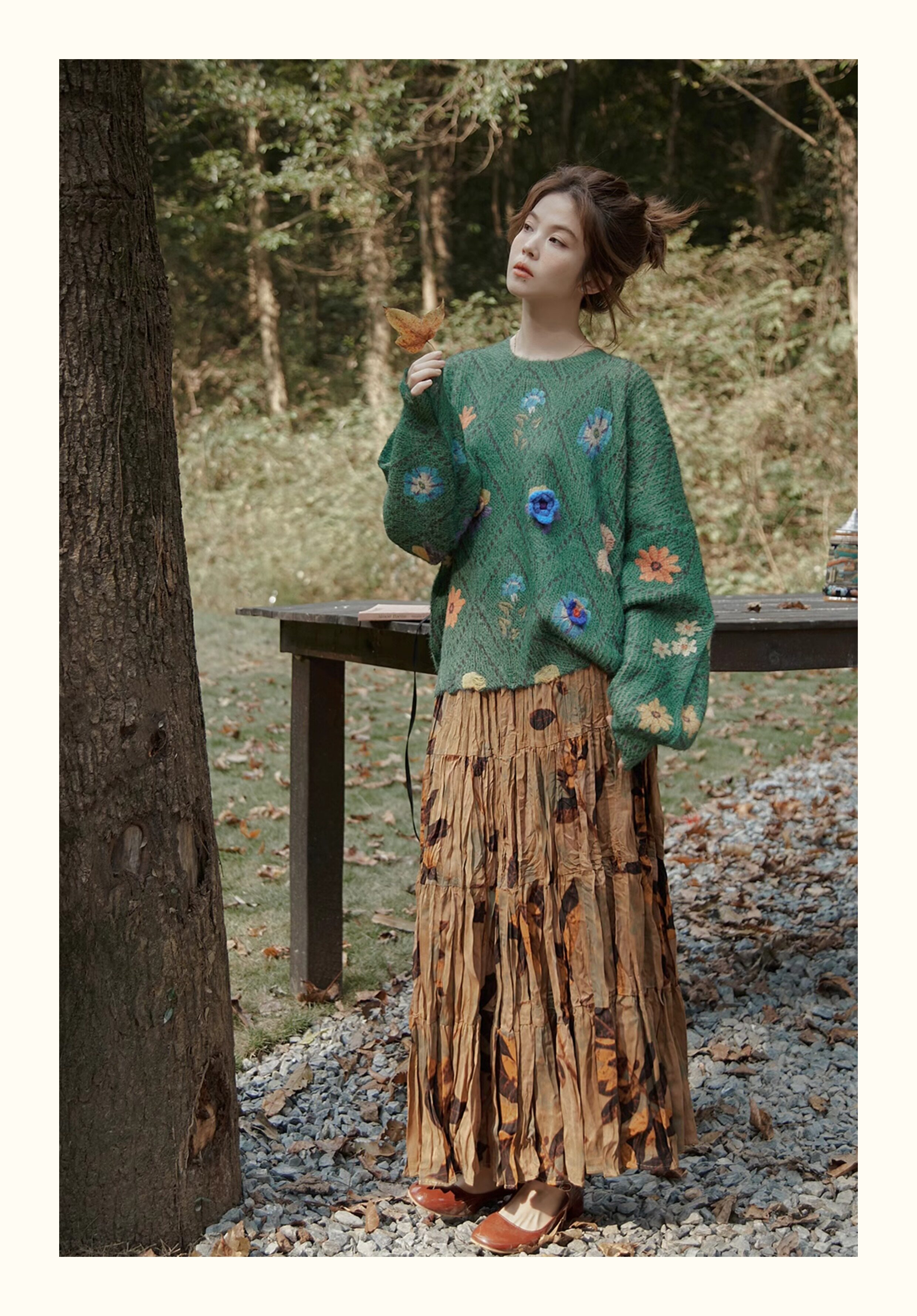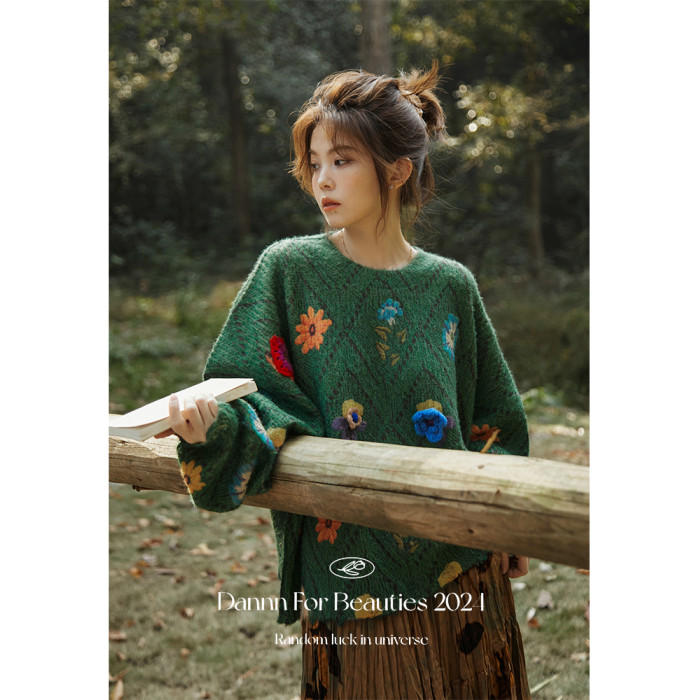 水草不鹹Dannn 草地綠色花朵燈籠袖針織慵懶軟軟糯糯秋冬毛衣女