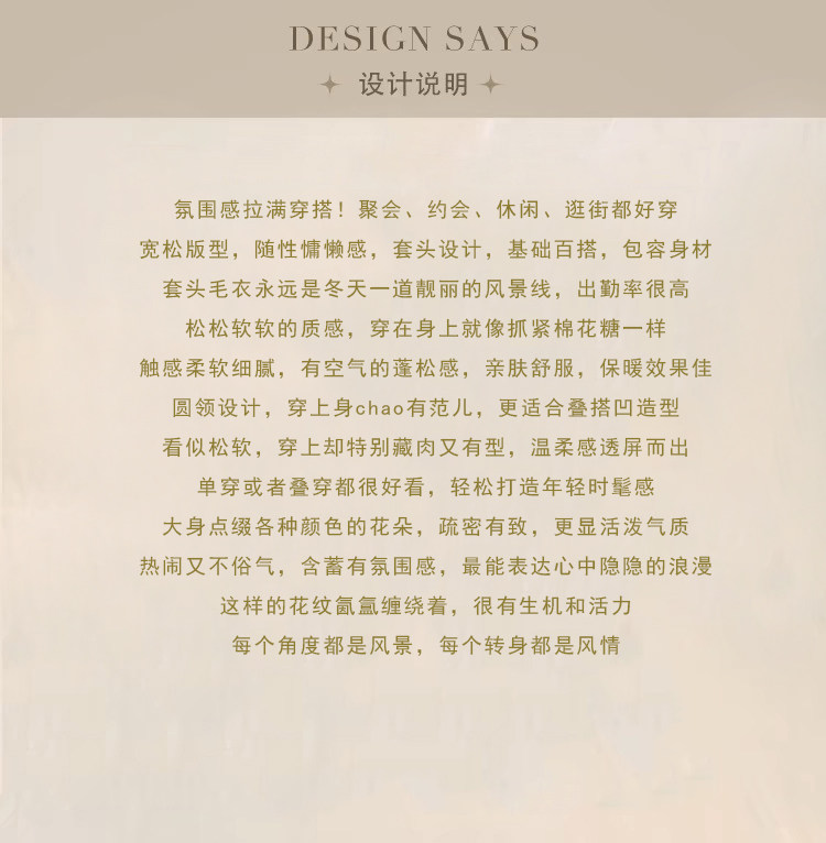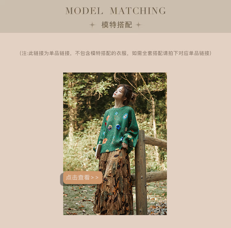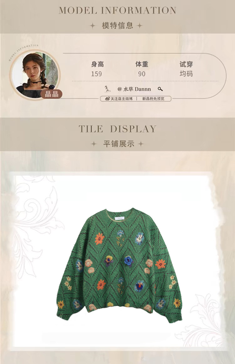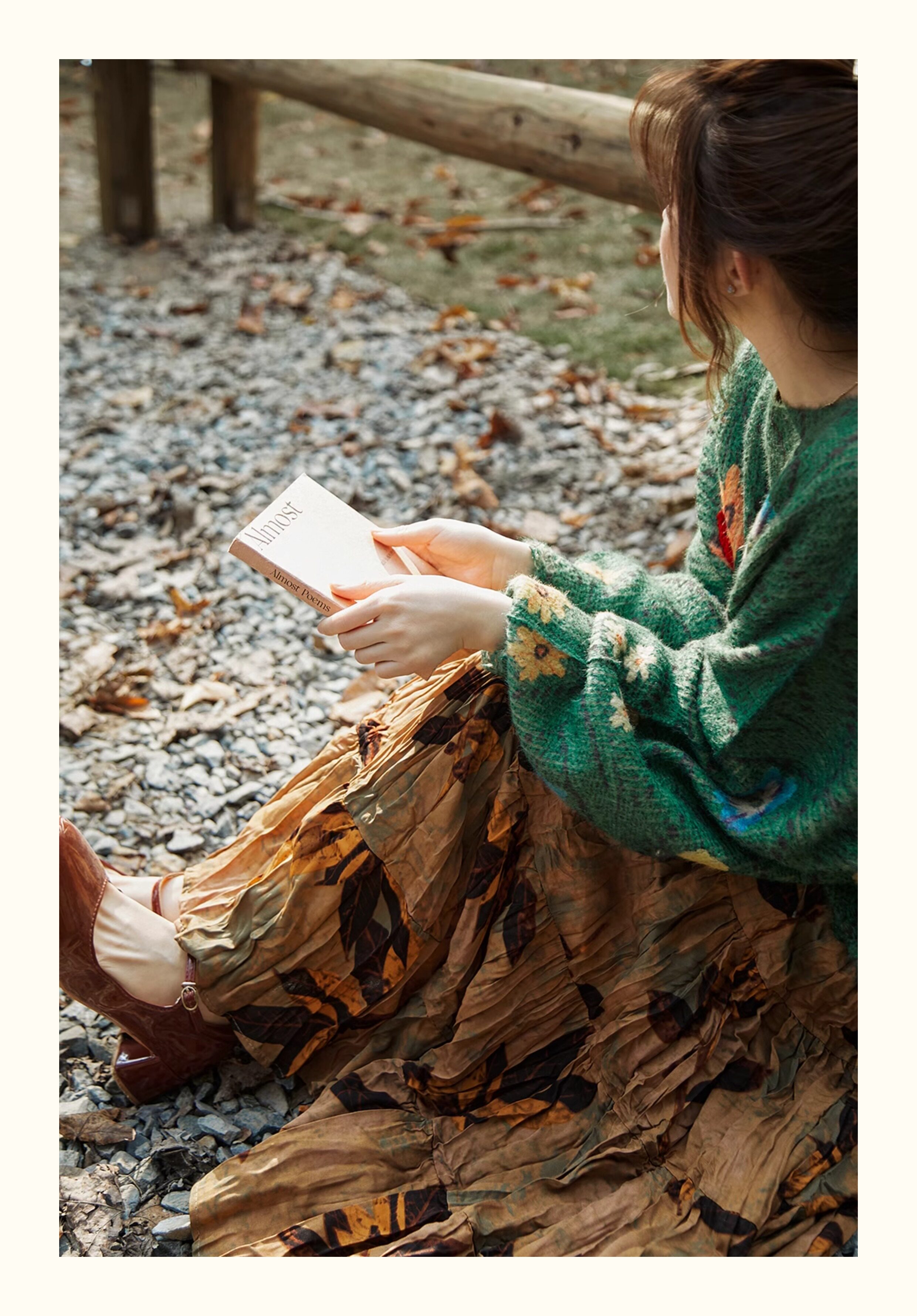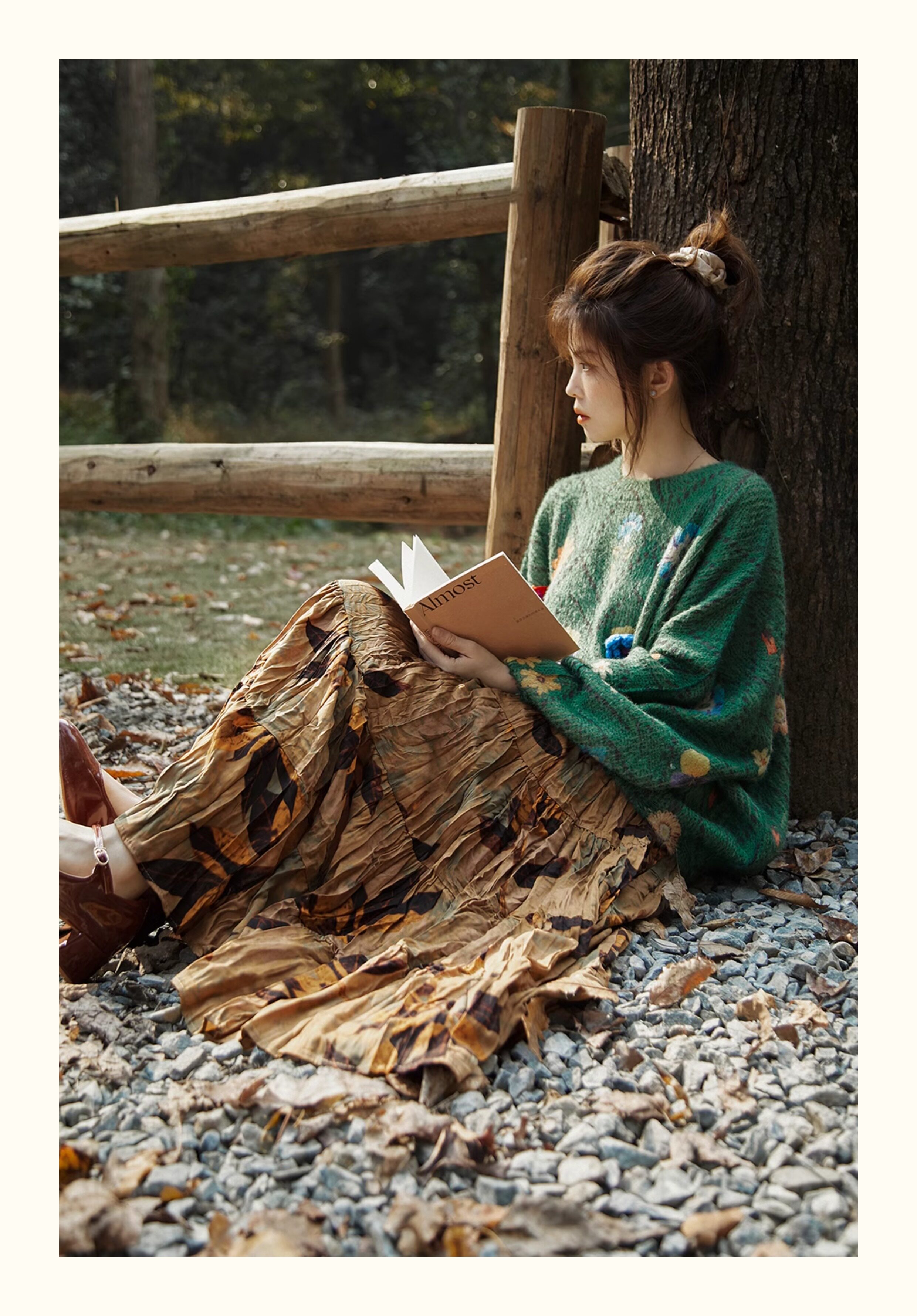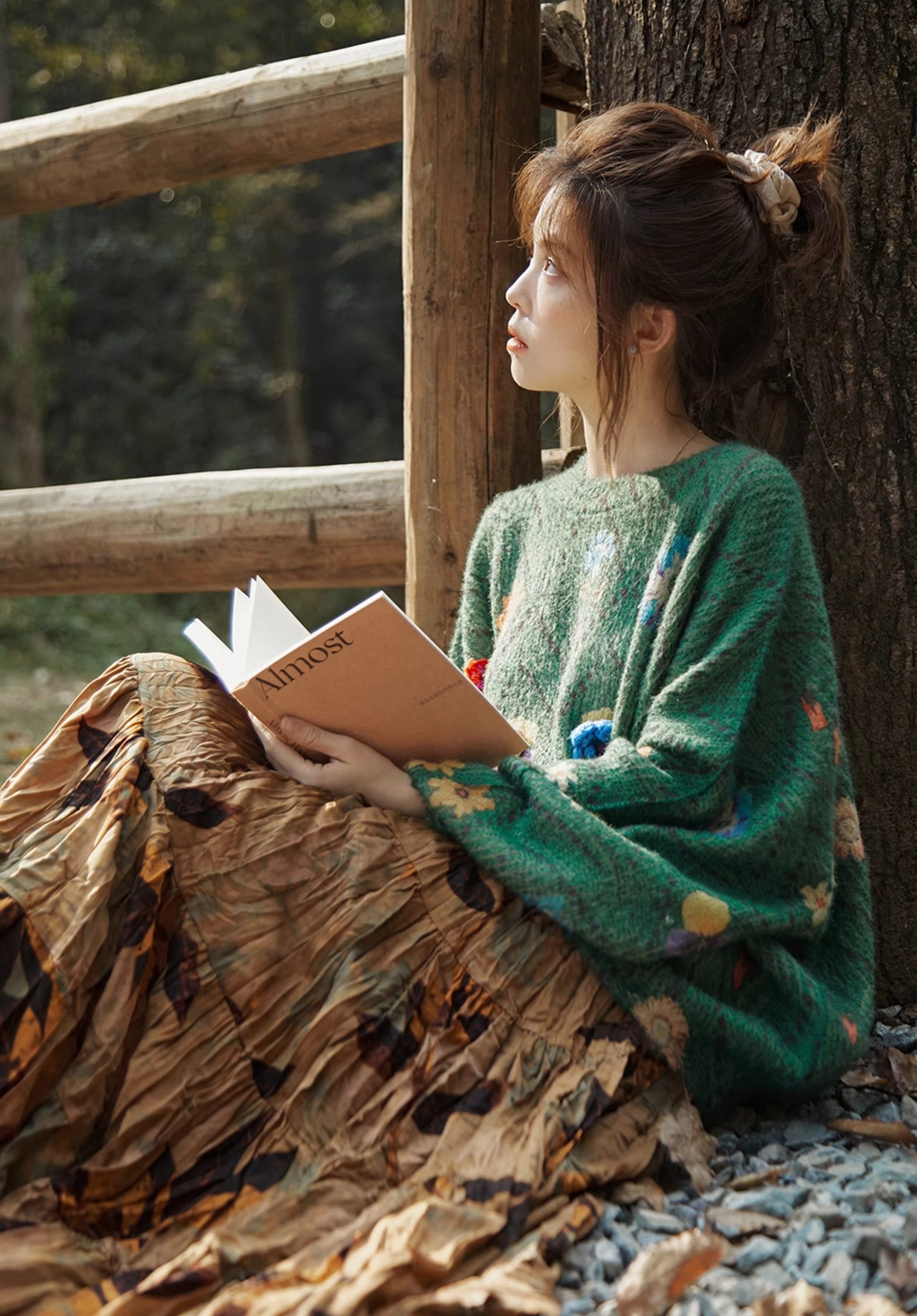 水草不鹹Dannn 草地綠色花朵燈籠袖針織慵懶軟軟糯糯秋冬毛衣女