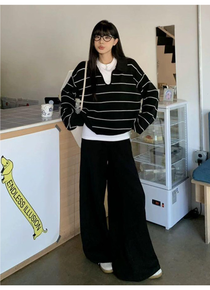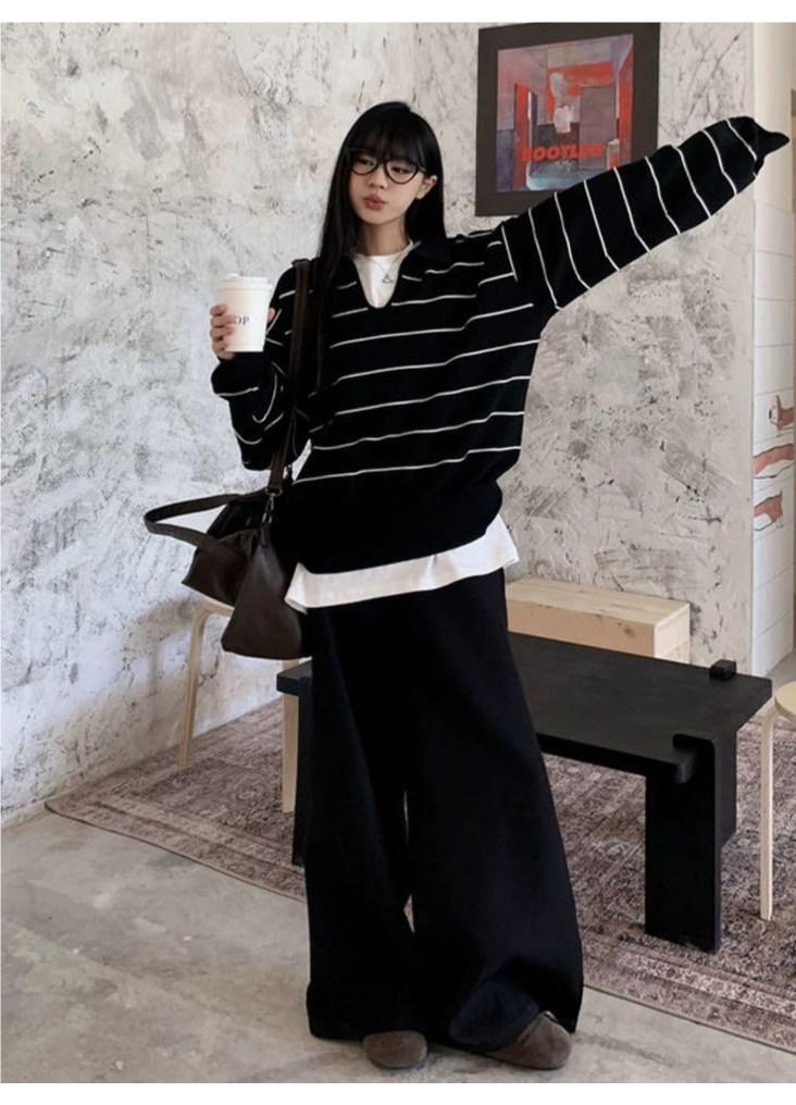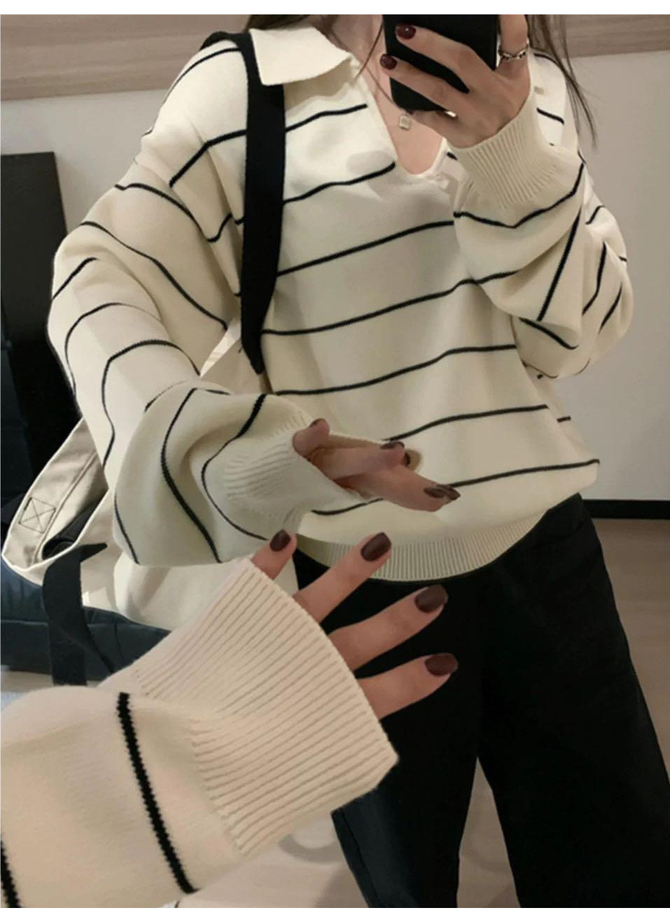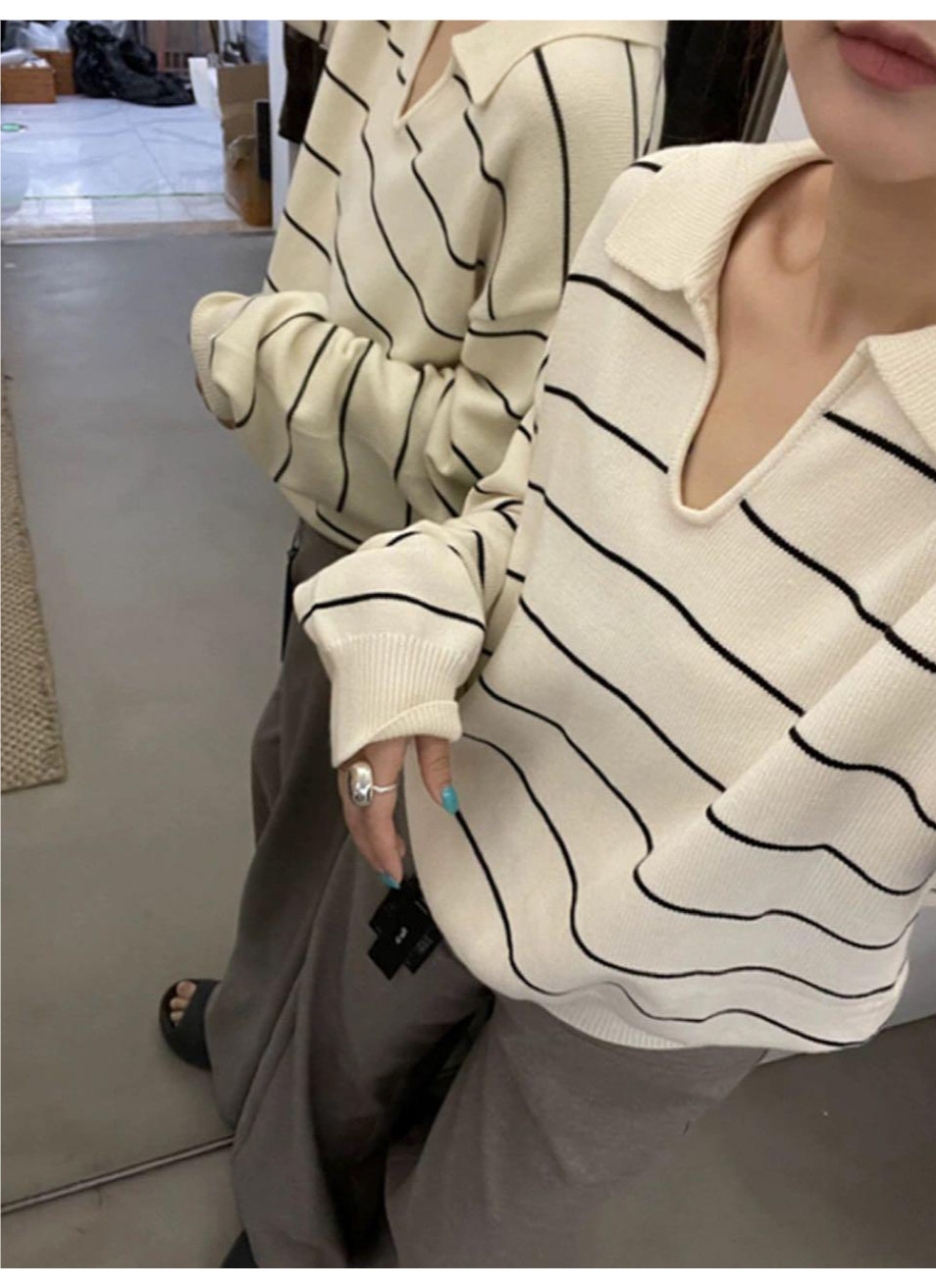 韓式慵懶風V領條紋針織衫女秋冬Polo領撞色寬松長袖毛衣打底上衣