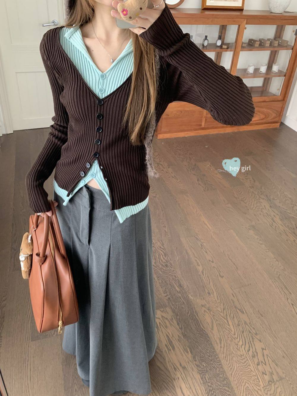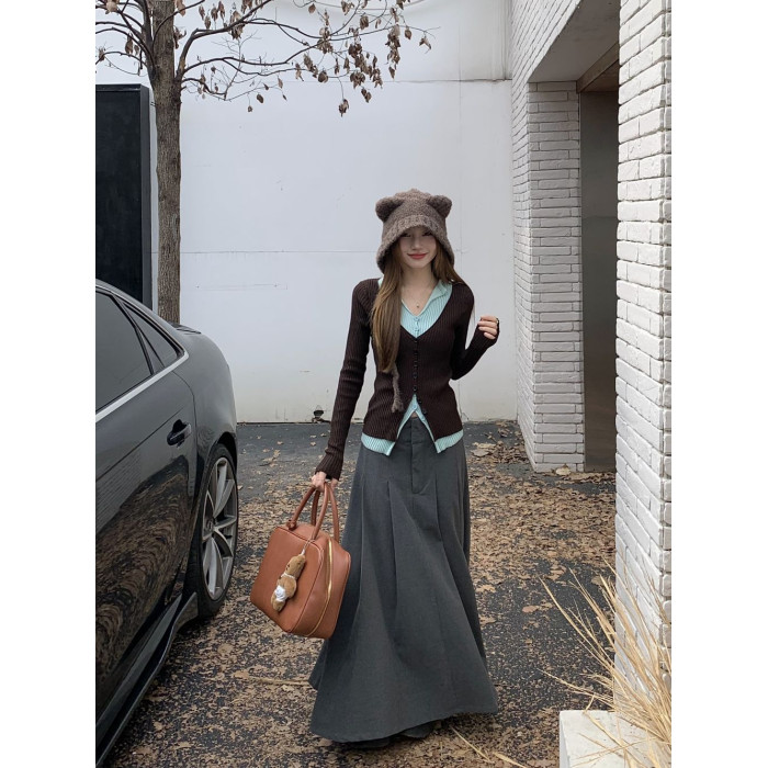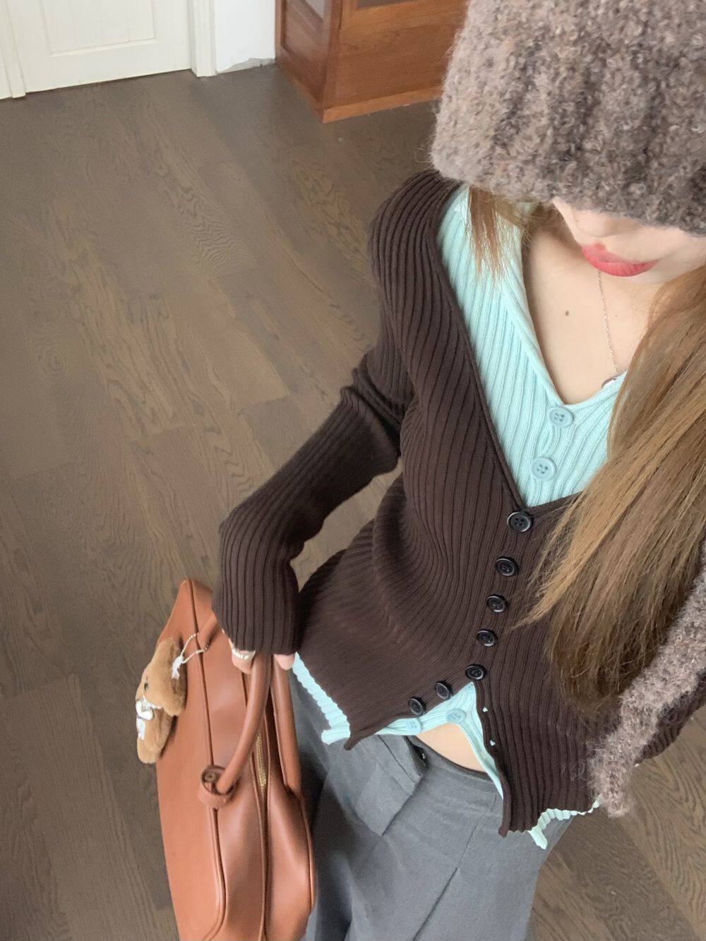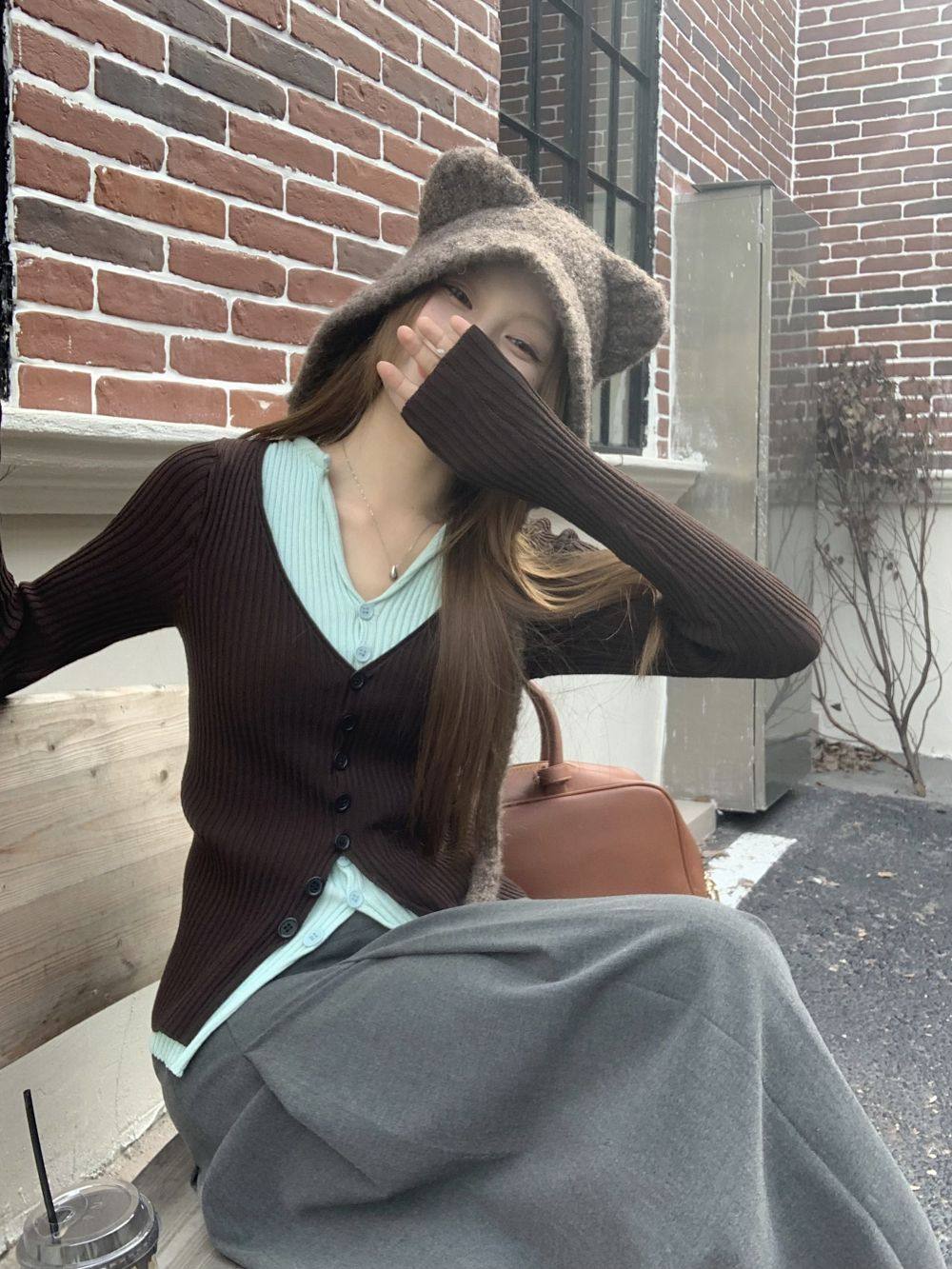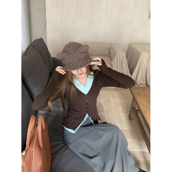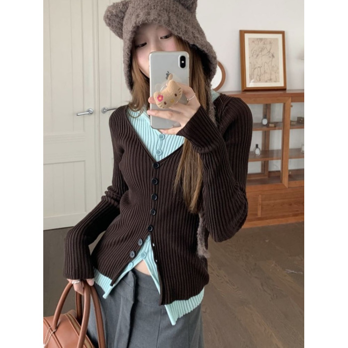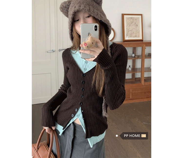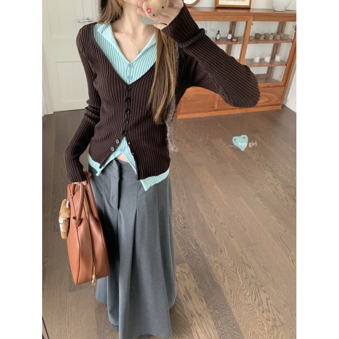 PPHOME撞色拼接V領長袖針織衫女秋季假兩件毛衣韓系小衆修身上衣