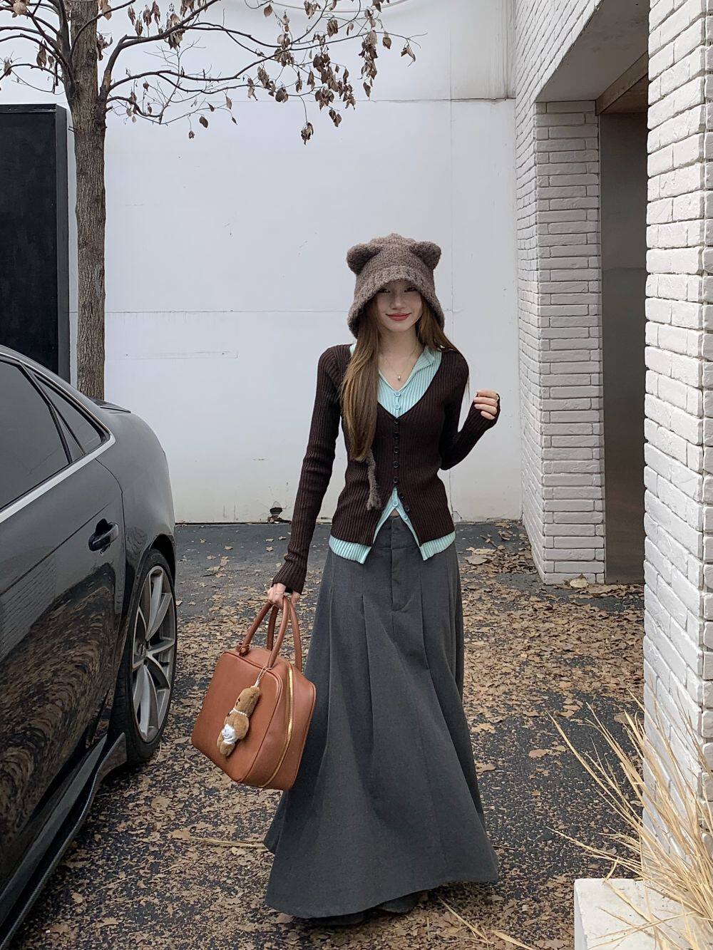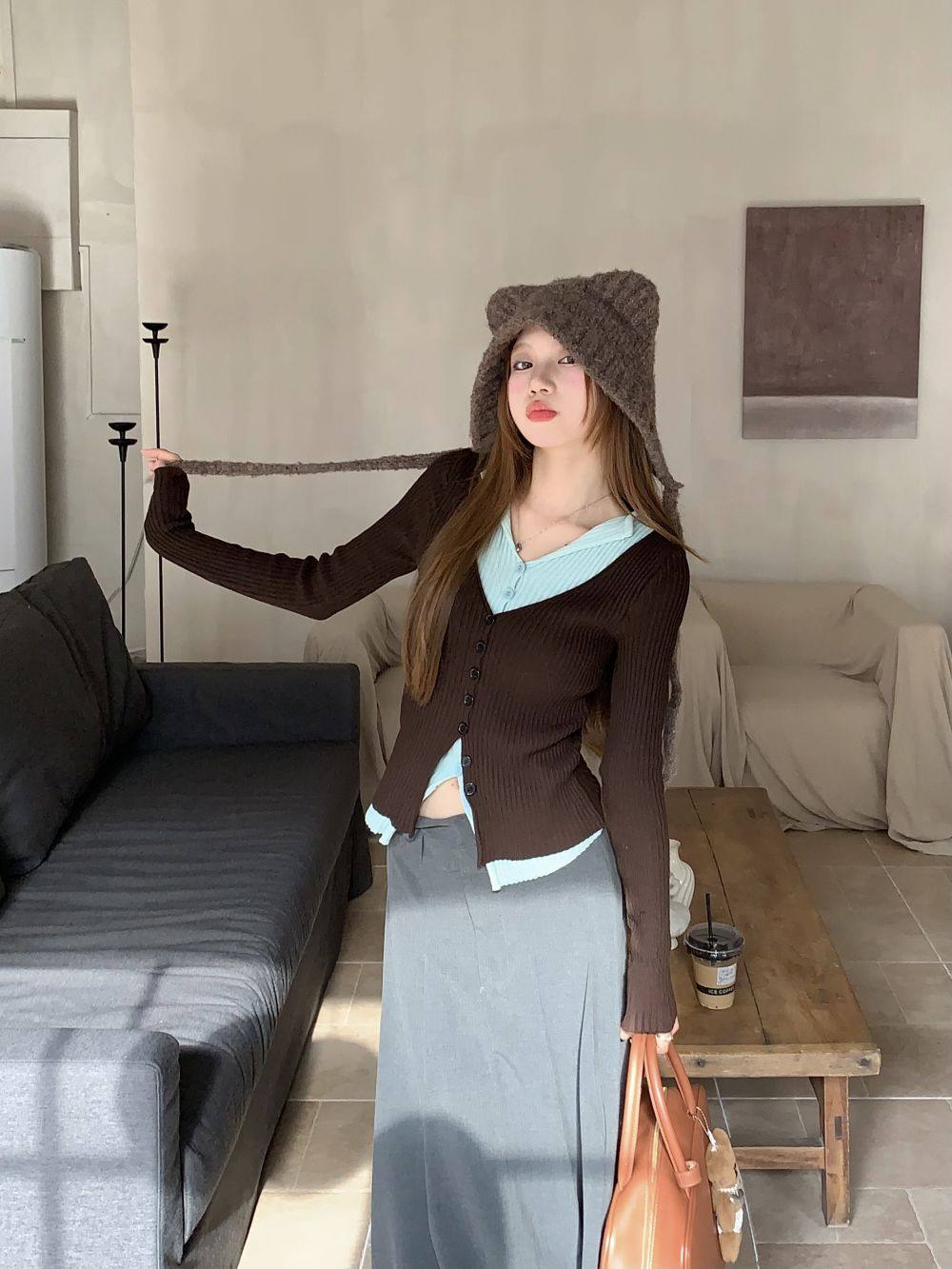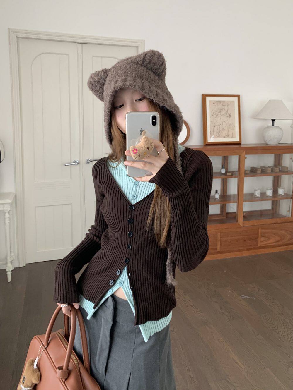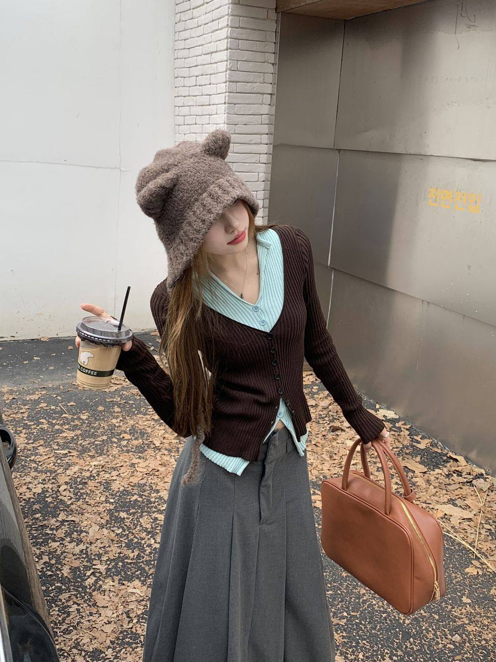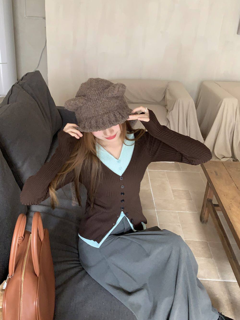 PPHOME撞色拼接V領長袖針織衫女秋季假兩件毛衣韓系小衆修身上衣