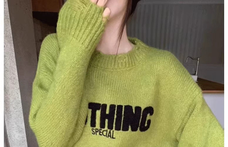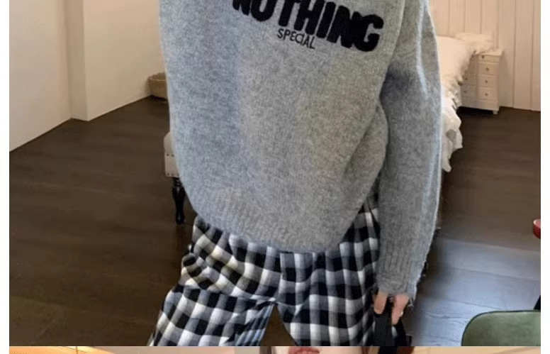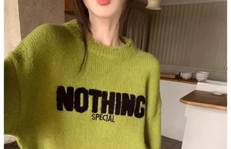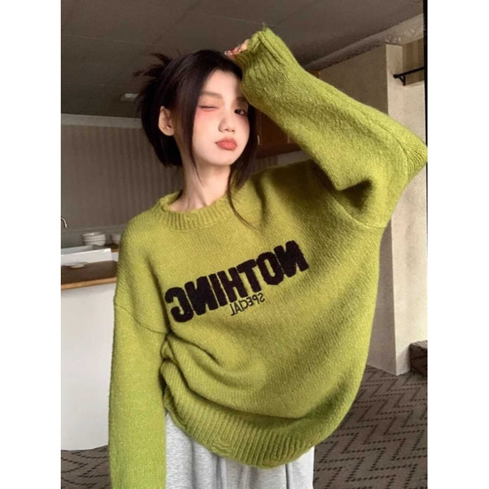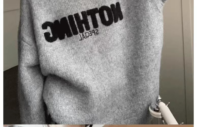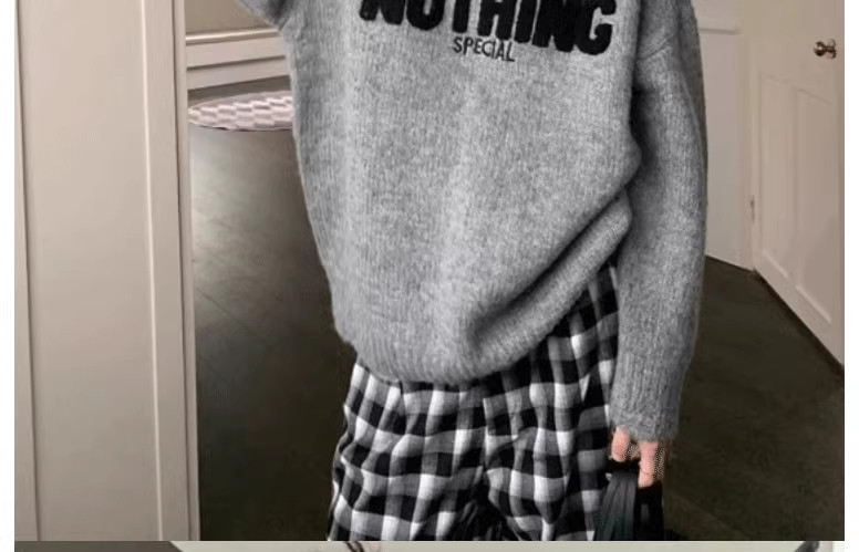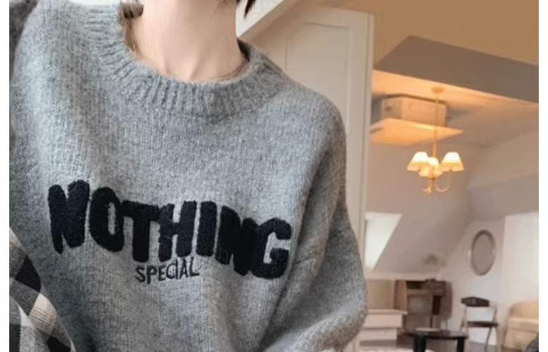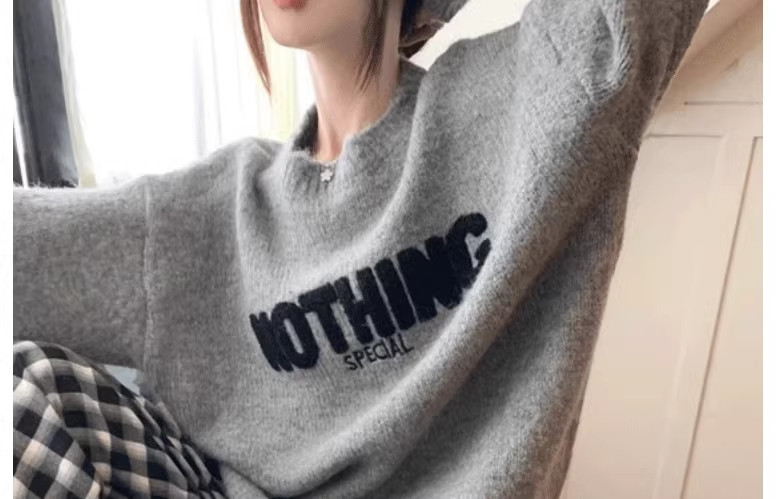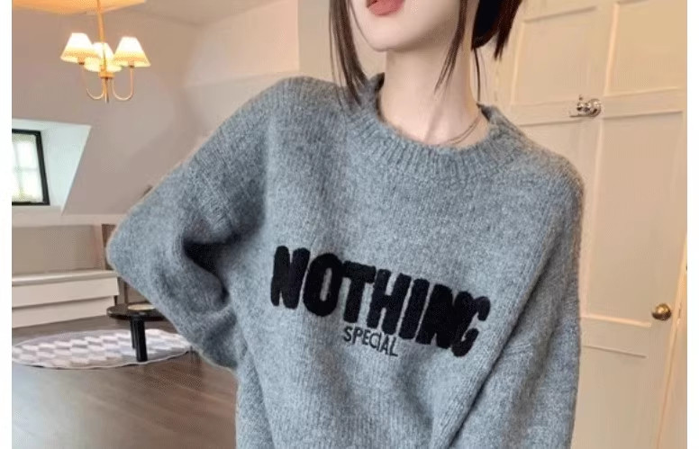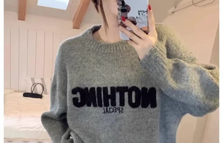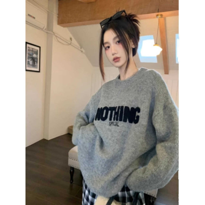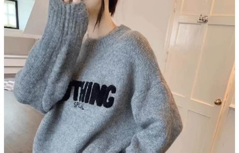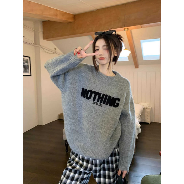 灰色字母刺綉圓領長袖針織衫女秋冬季寬鬆打底衫套頭上衣外穿毛衣