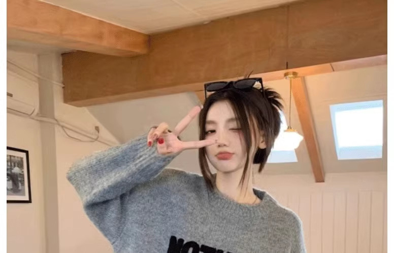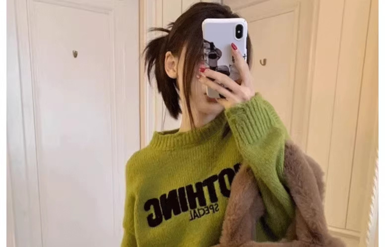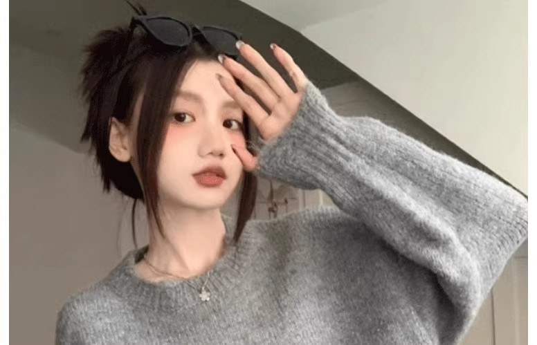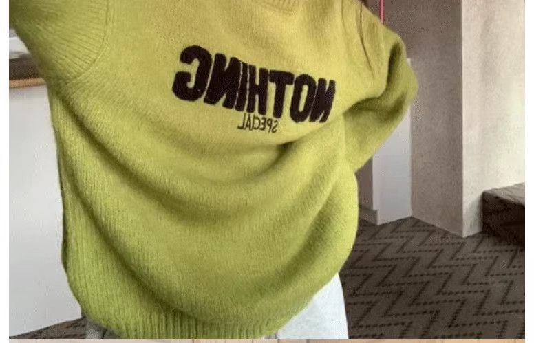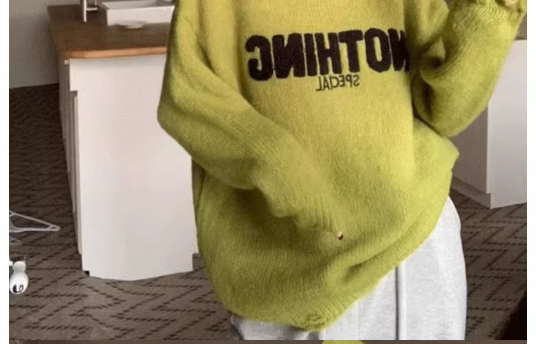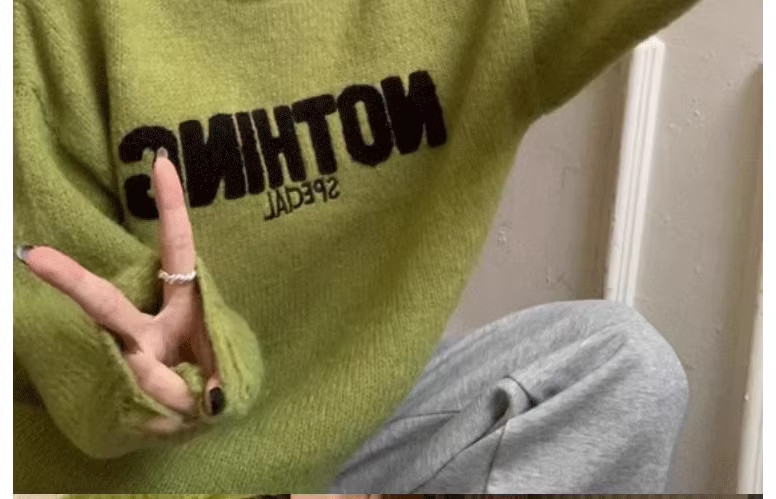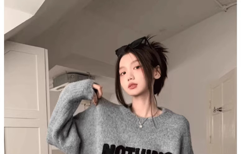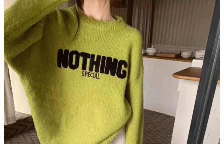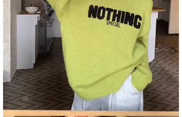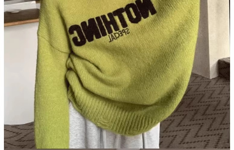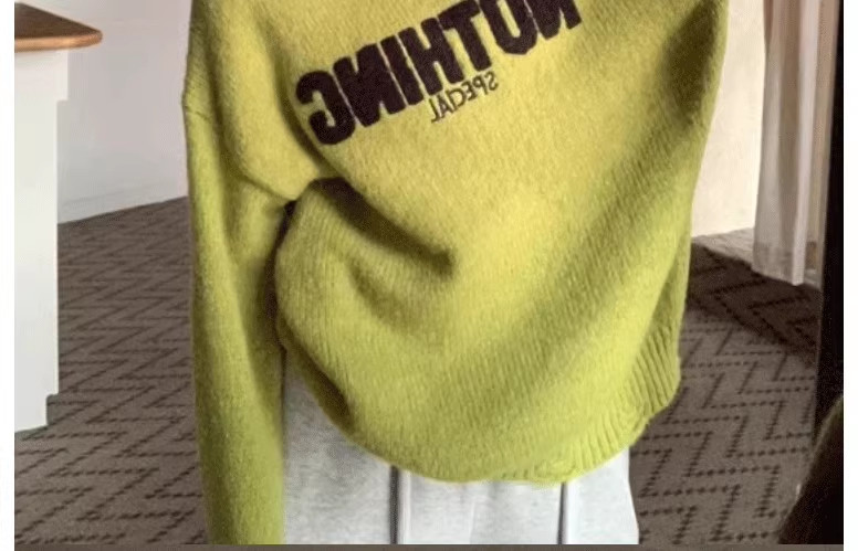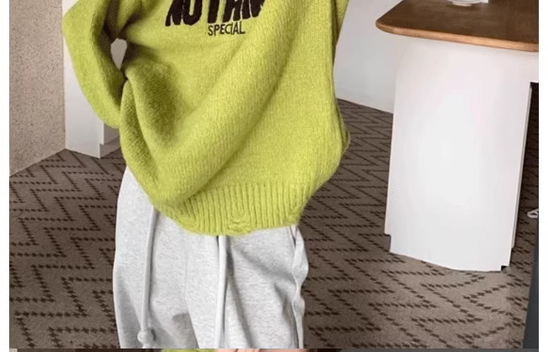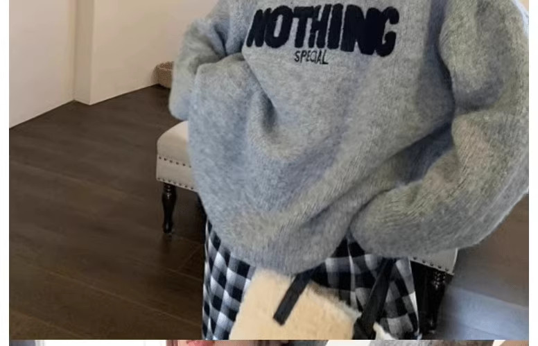灰色字母刺綉圓領長袖針織衫女秋冬季寬鬆打底衫套頭上衣外穿毛衣