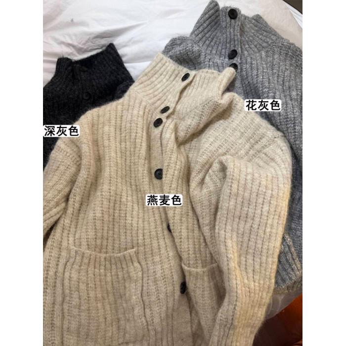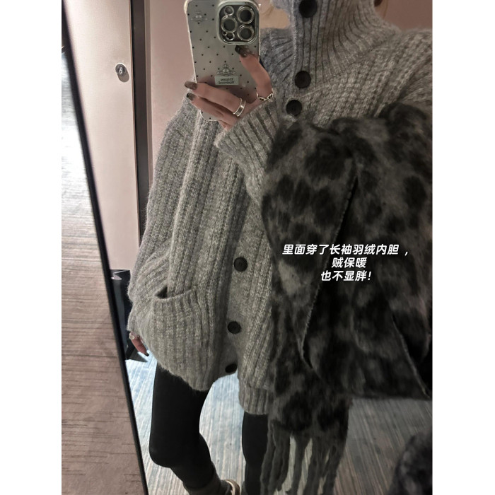 韓系穿搭慵懶風立領開衫毛衣秋冬加厚高級感寬松軟糯針織上衣外套