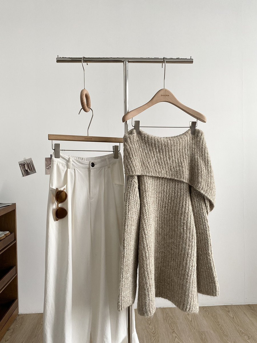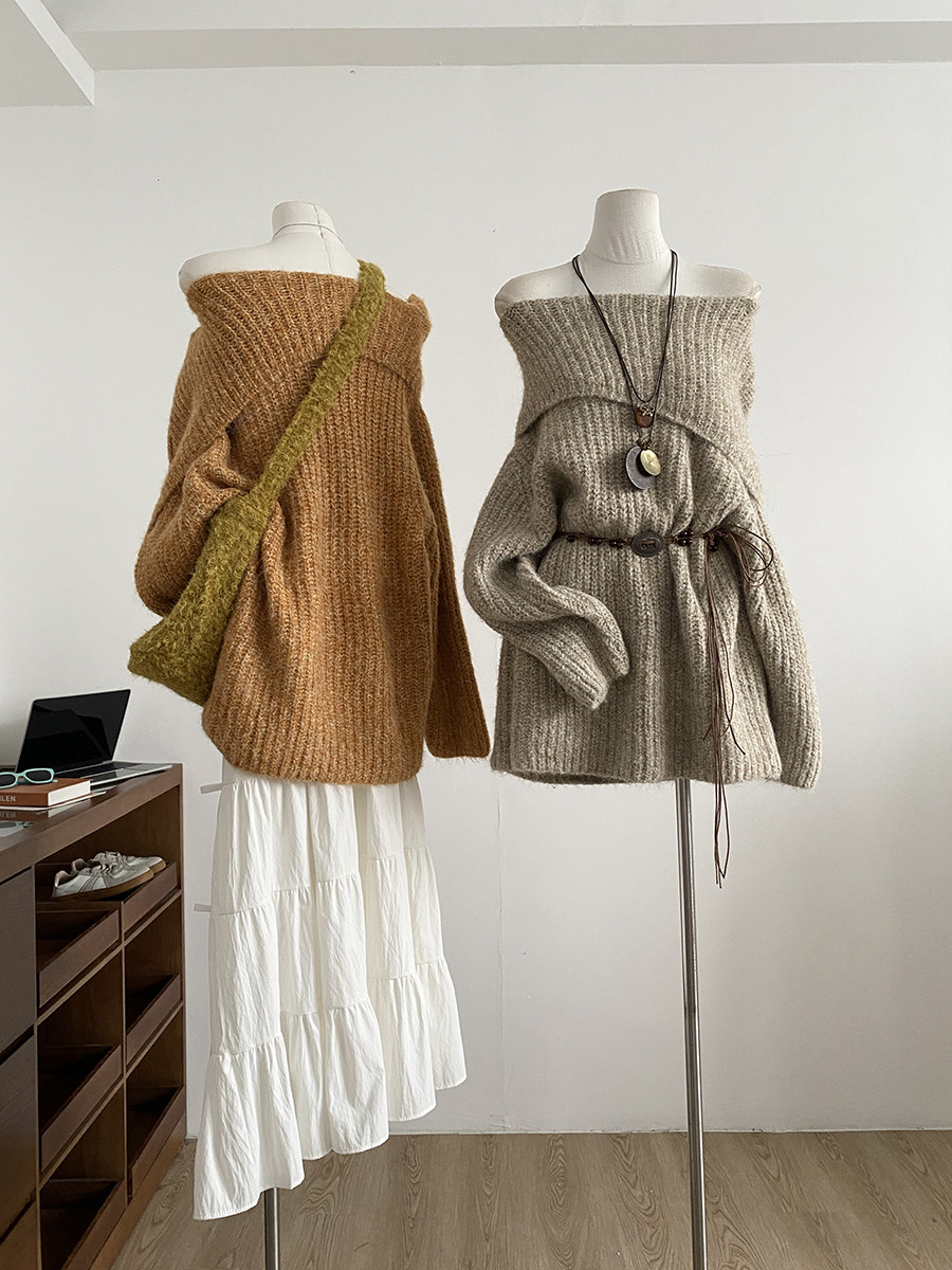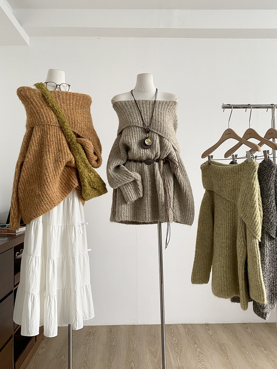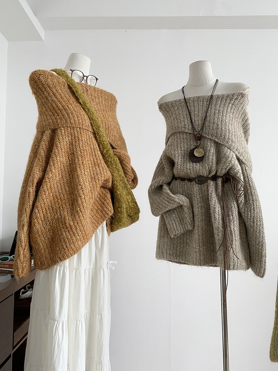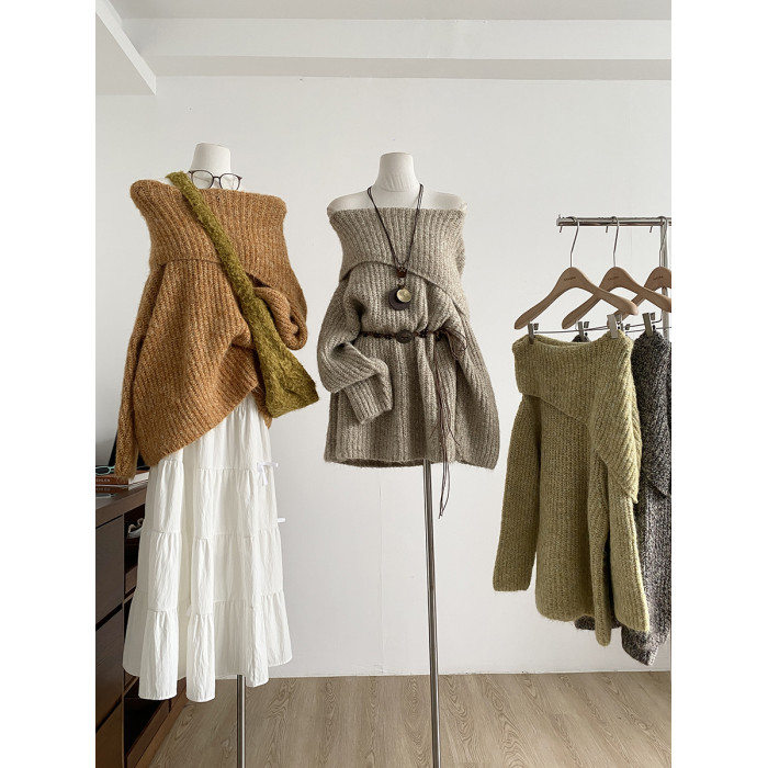 2025冬季新款韓系溫柔一字肩針織毛衣女寬松顯瘦減齡軟糯露肩上衣