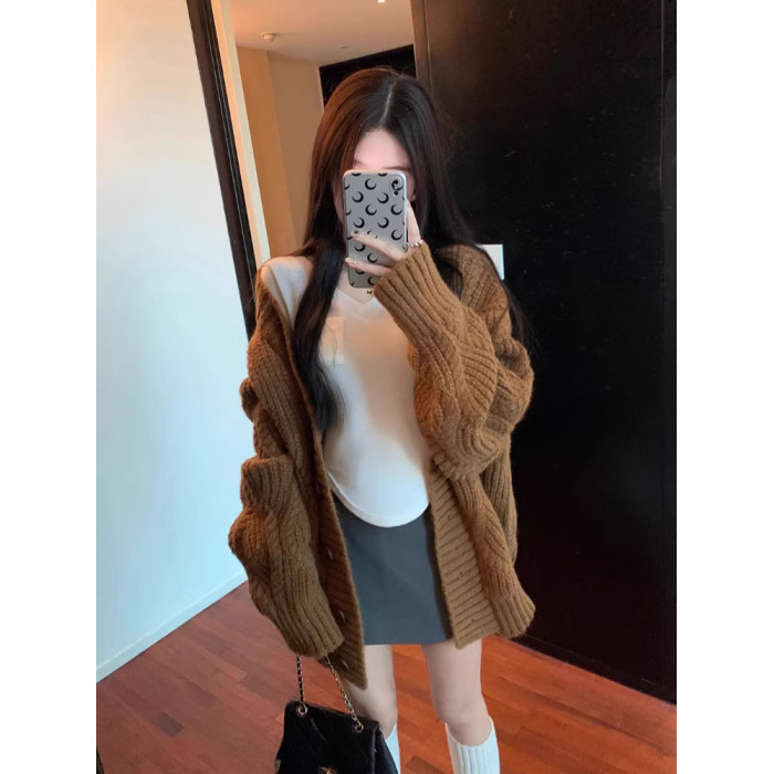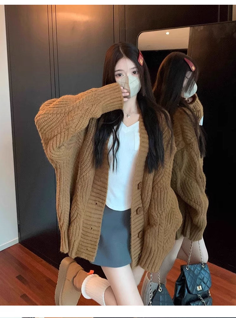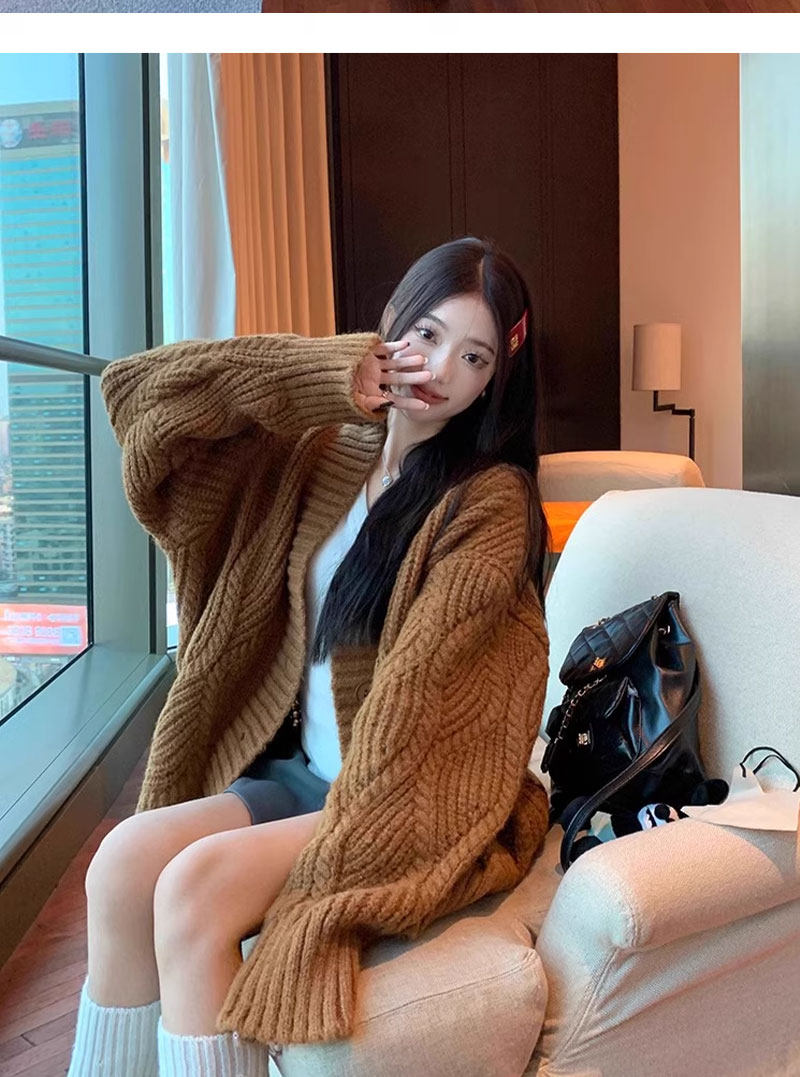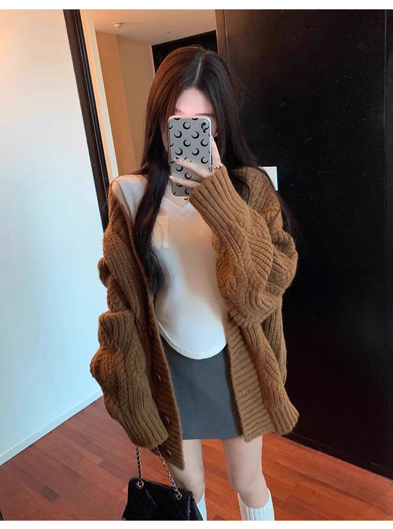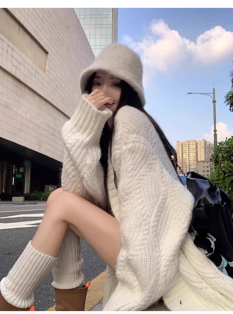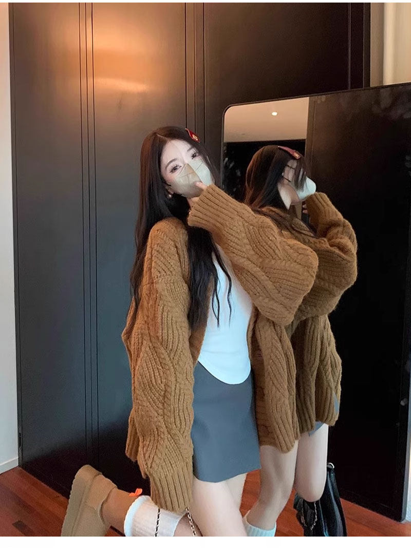 寬松慵懶風加厚麻花毛衣外套女秋冬小個子外穿針織開衫中長款上衣
