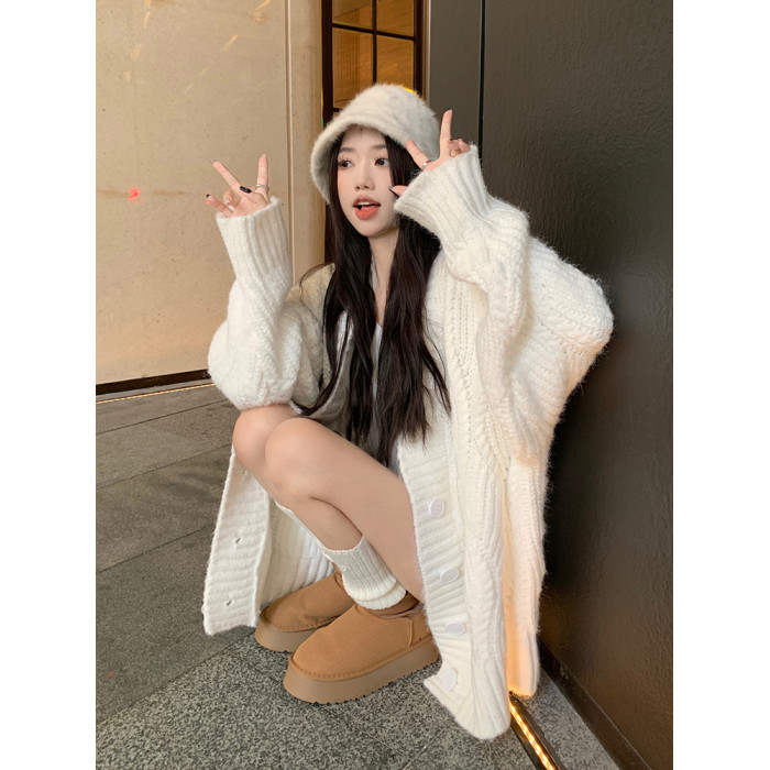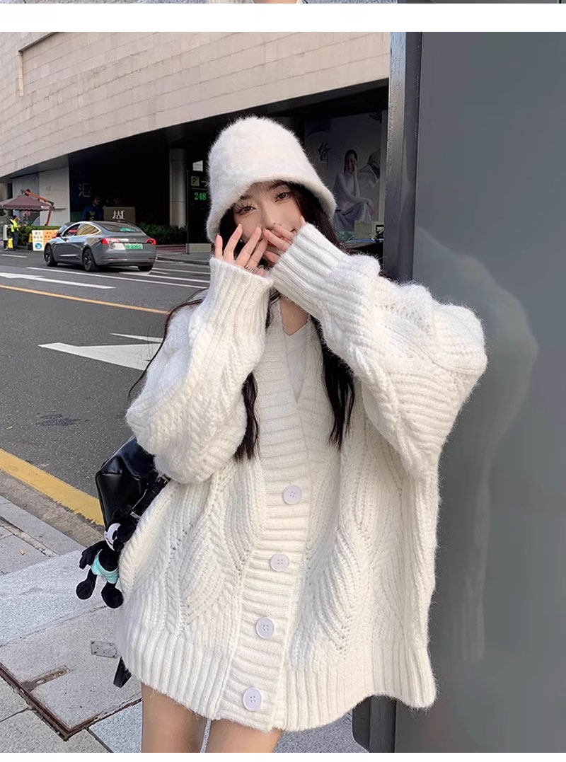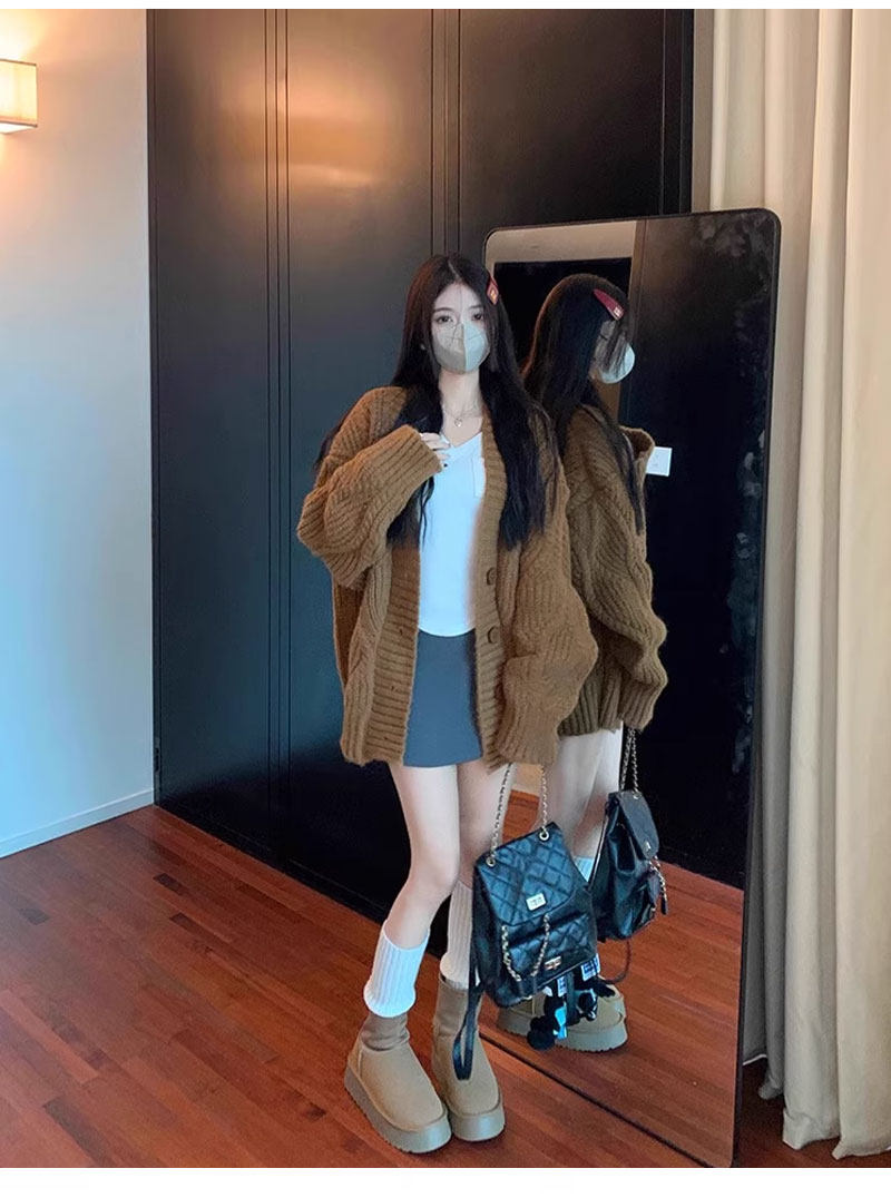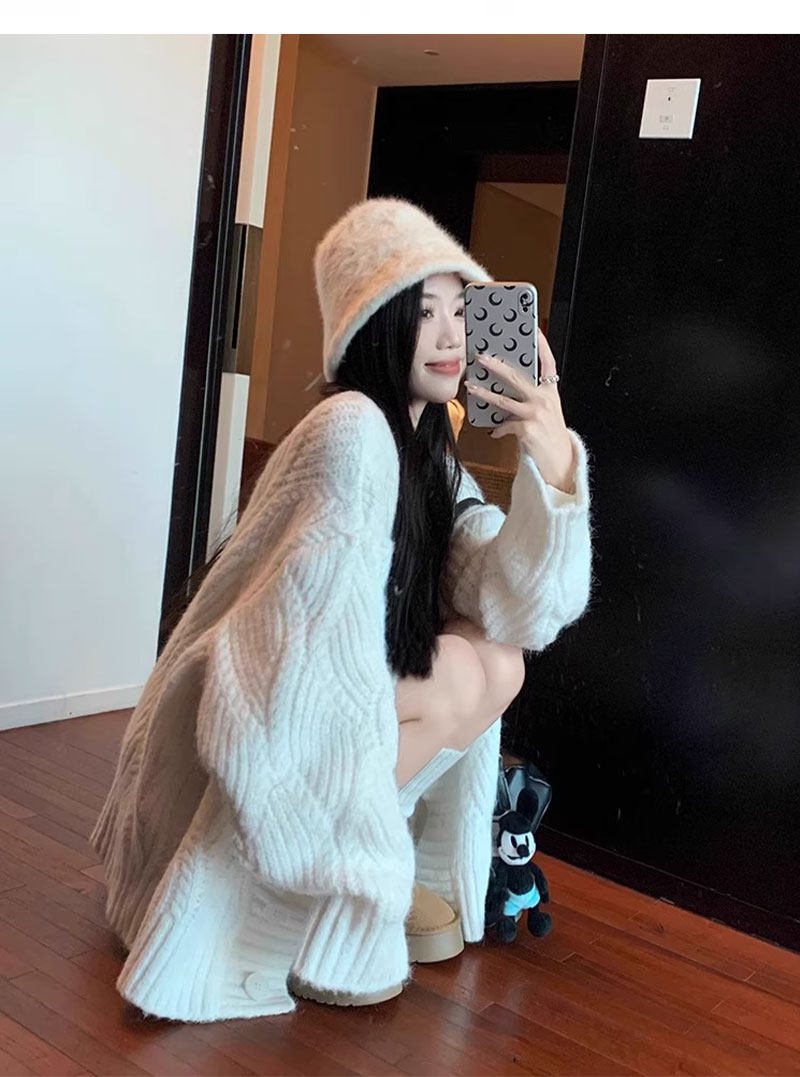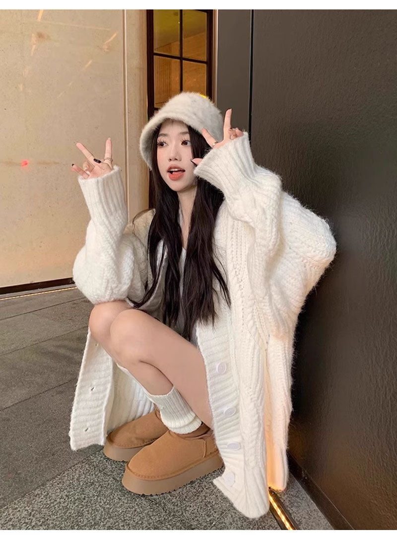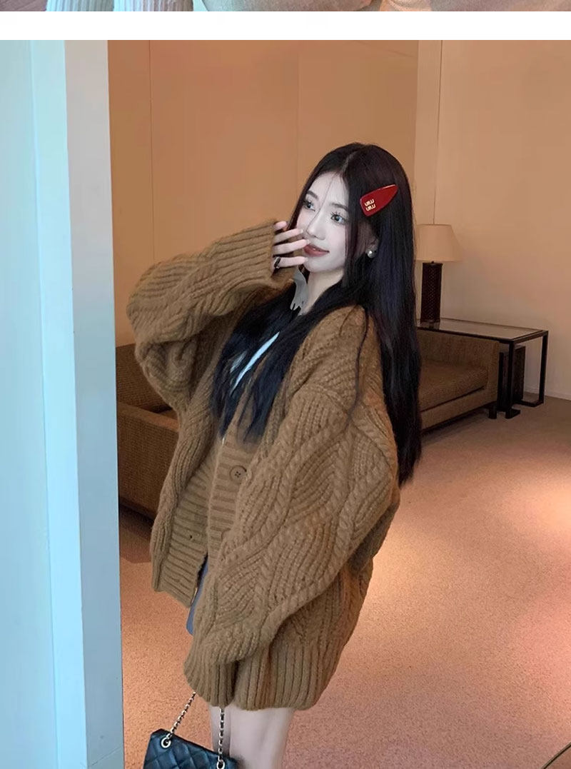 寬松慵懶風加厚麻花毛衣外套女秋冬小個子外穿針織開衫中長款上衣