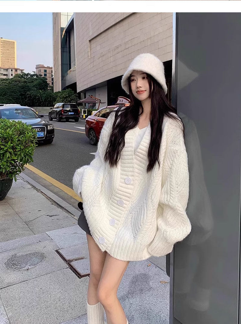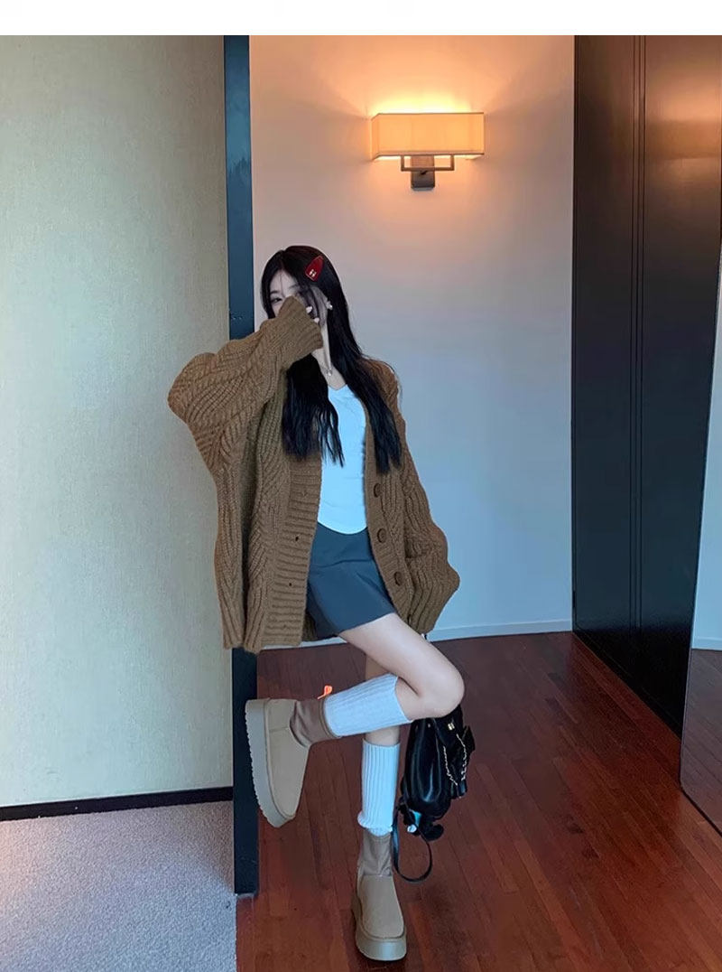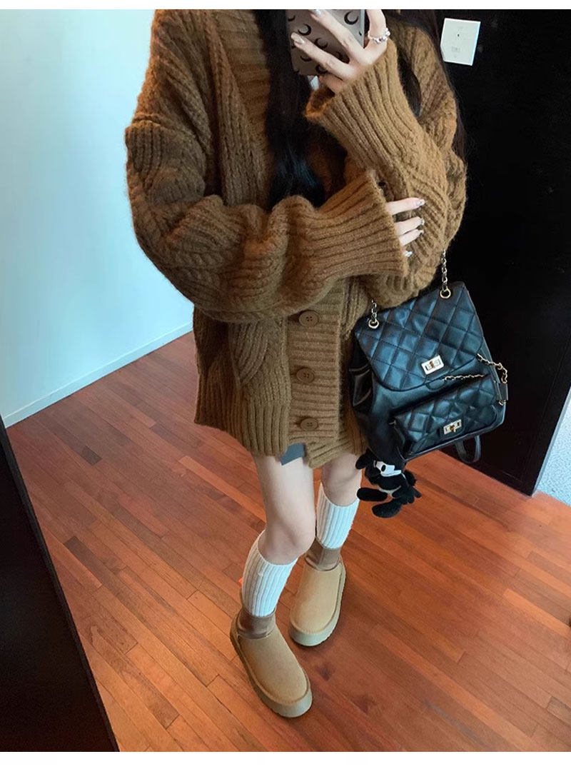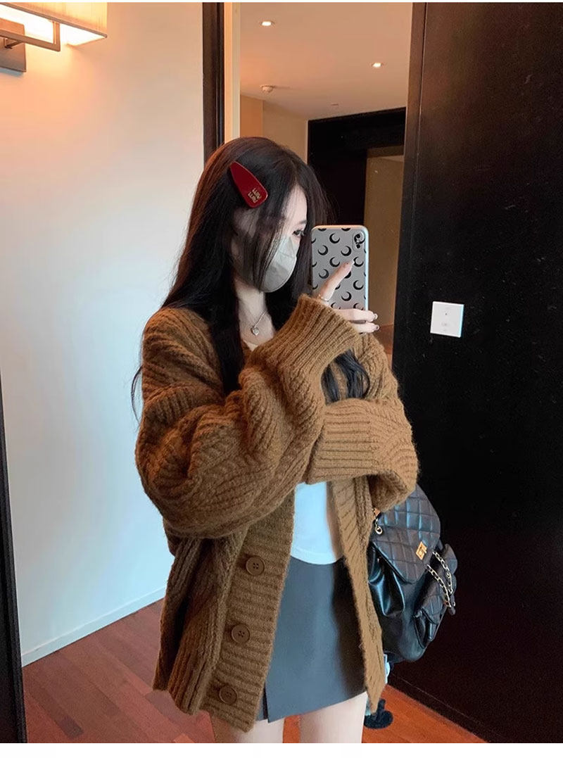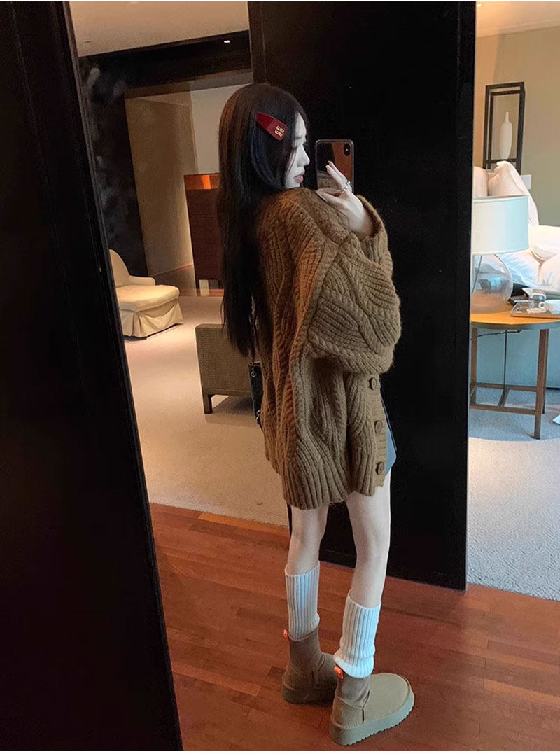 寬松慵懶風加厚麻花毛衣外套女秋冬小個子外穿針織開衫中長款上衣