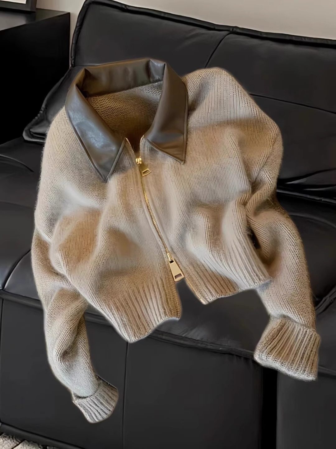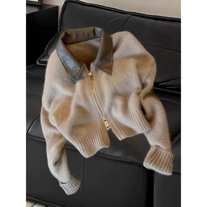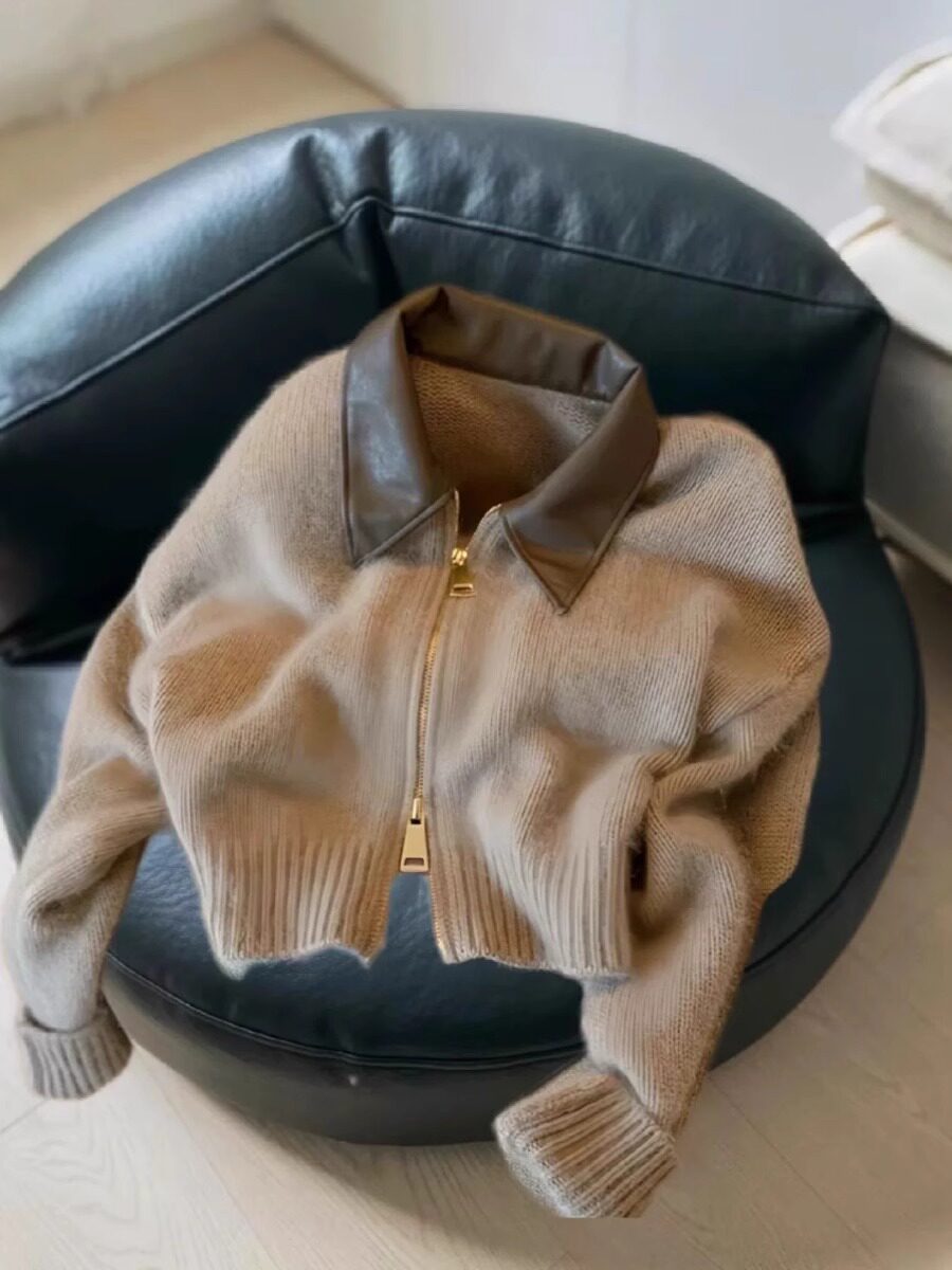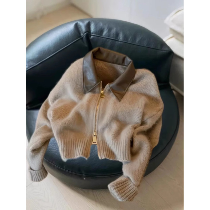 美拉德拼接短款雙拉鍊毛衣女秋冬復古高級感修身polo領針織衫外套