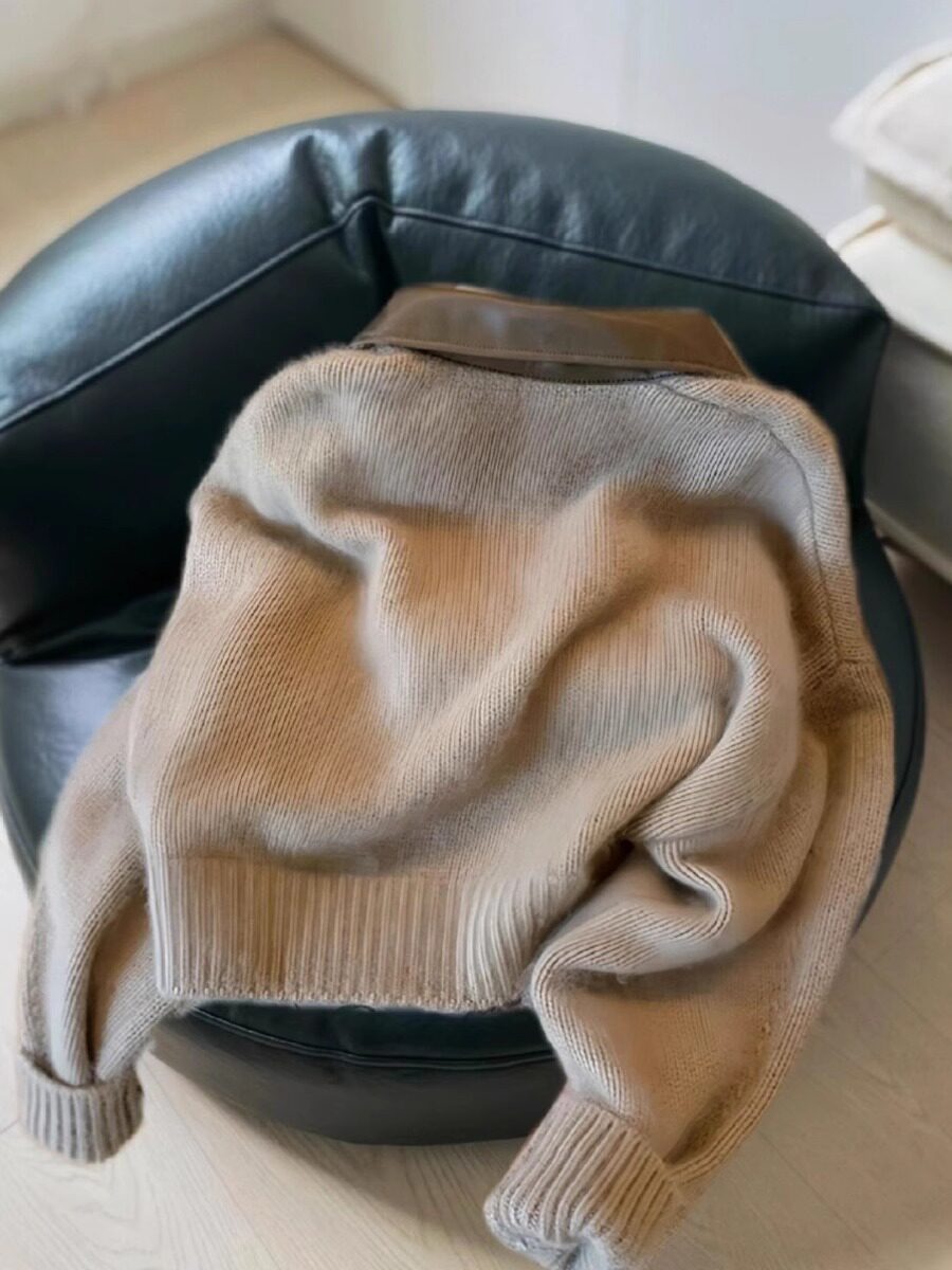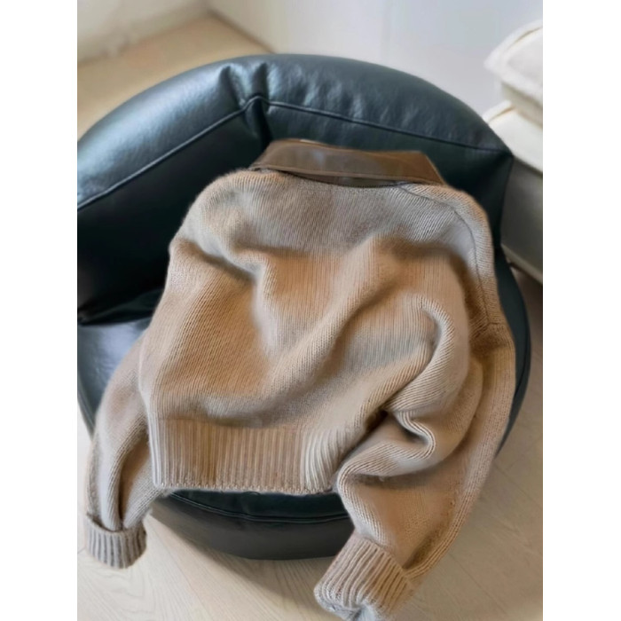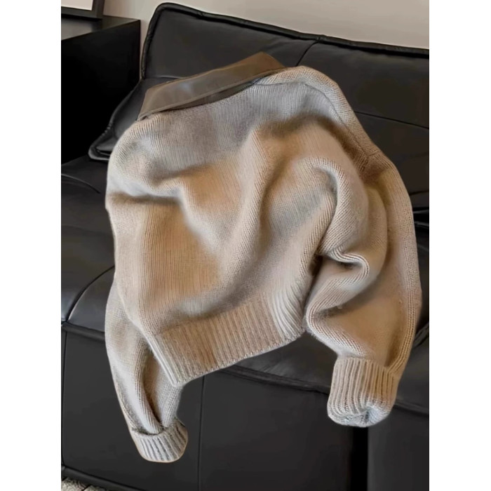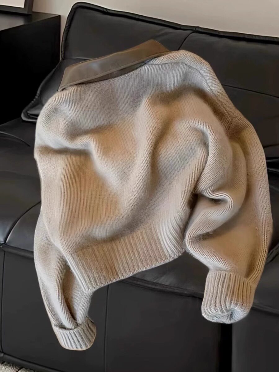 美拉德拼接短款雙拉鍊毛衣女秋冬復古高級感修身polo領針織衫外套