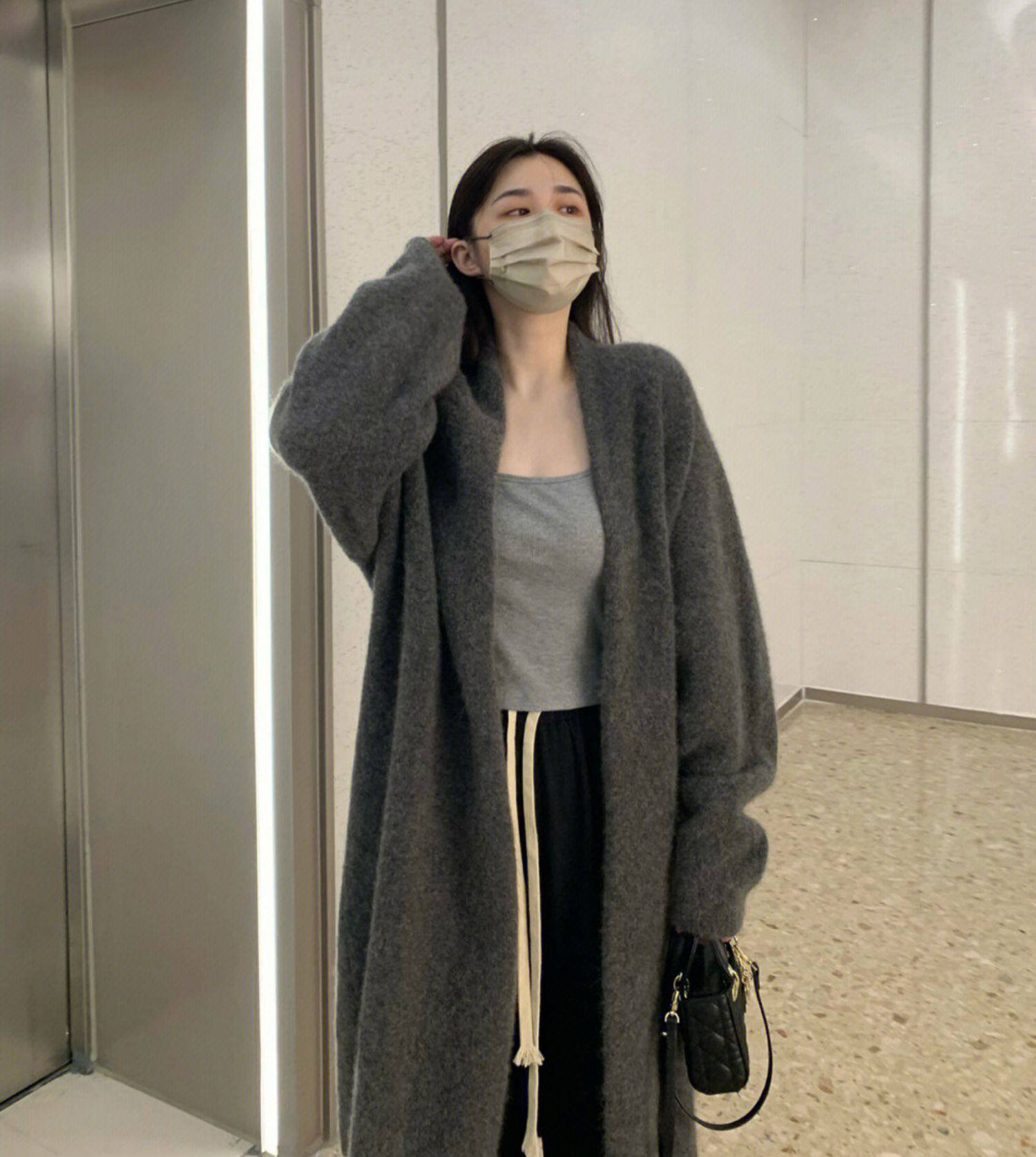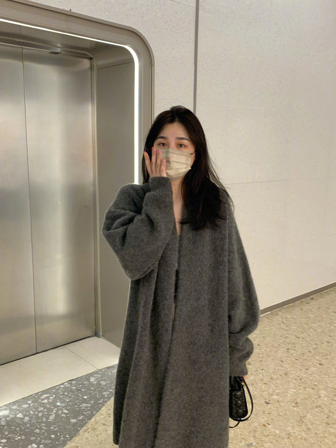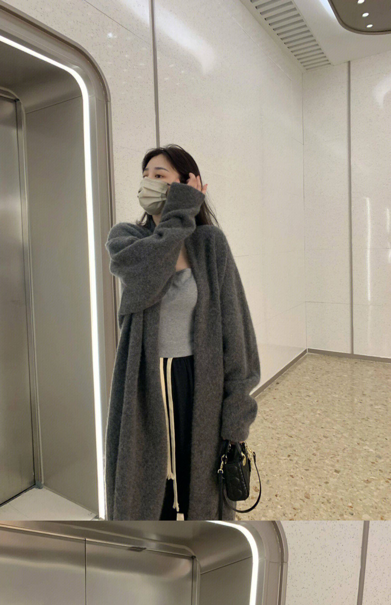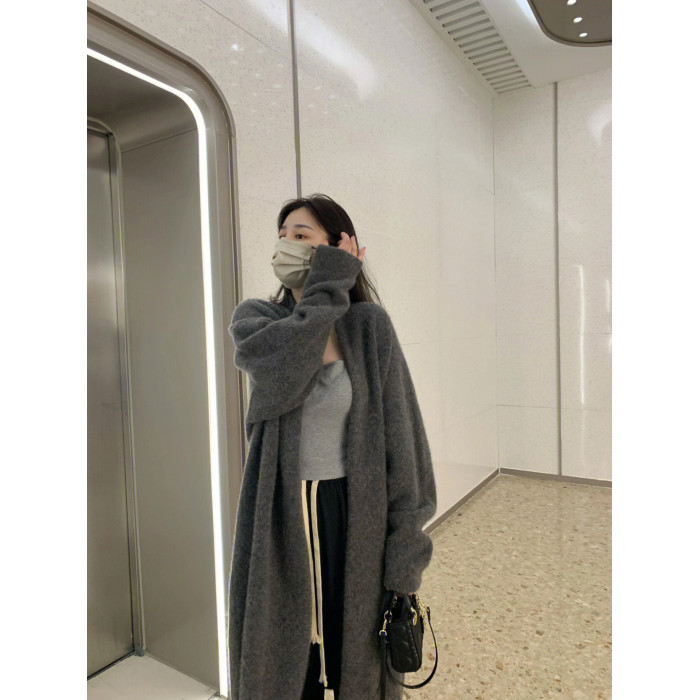 灰色中長款過膝毛衣外套女春秋冬冬季慵懶風加厚羊絨針織開衫大衣