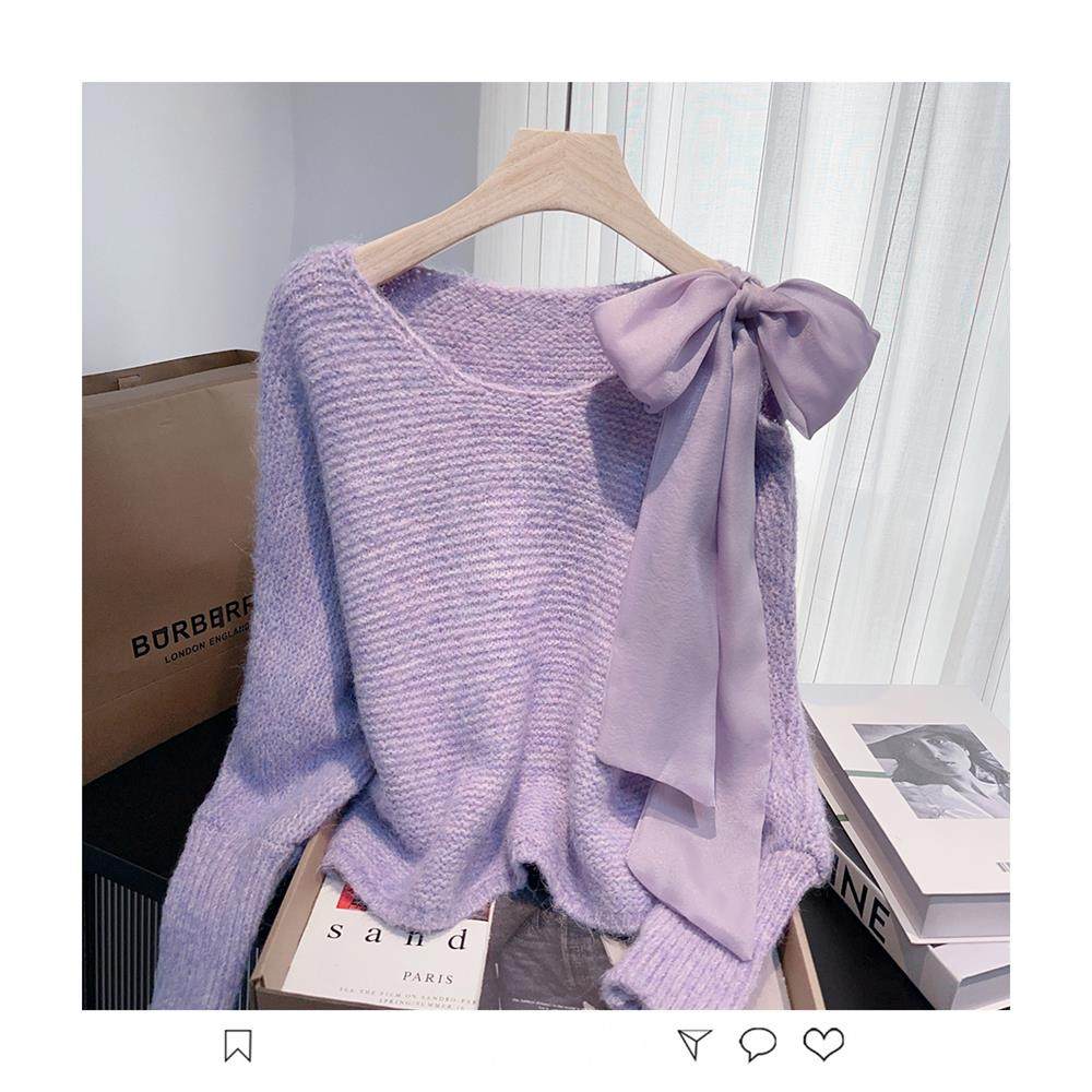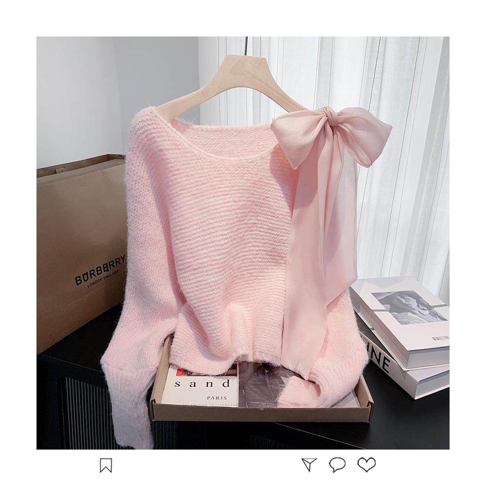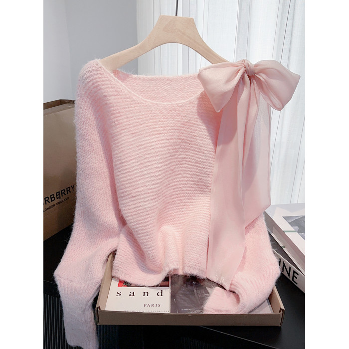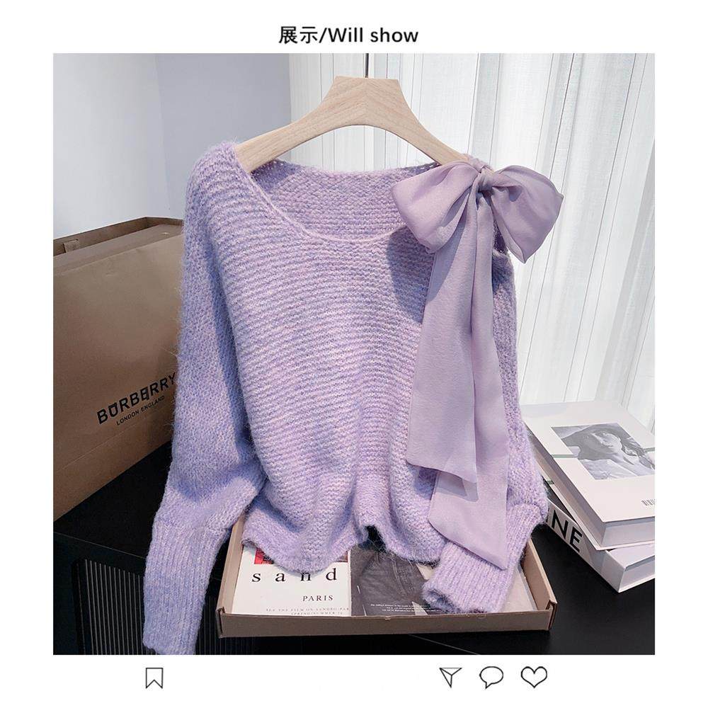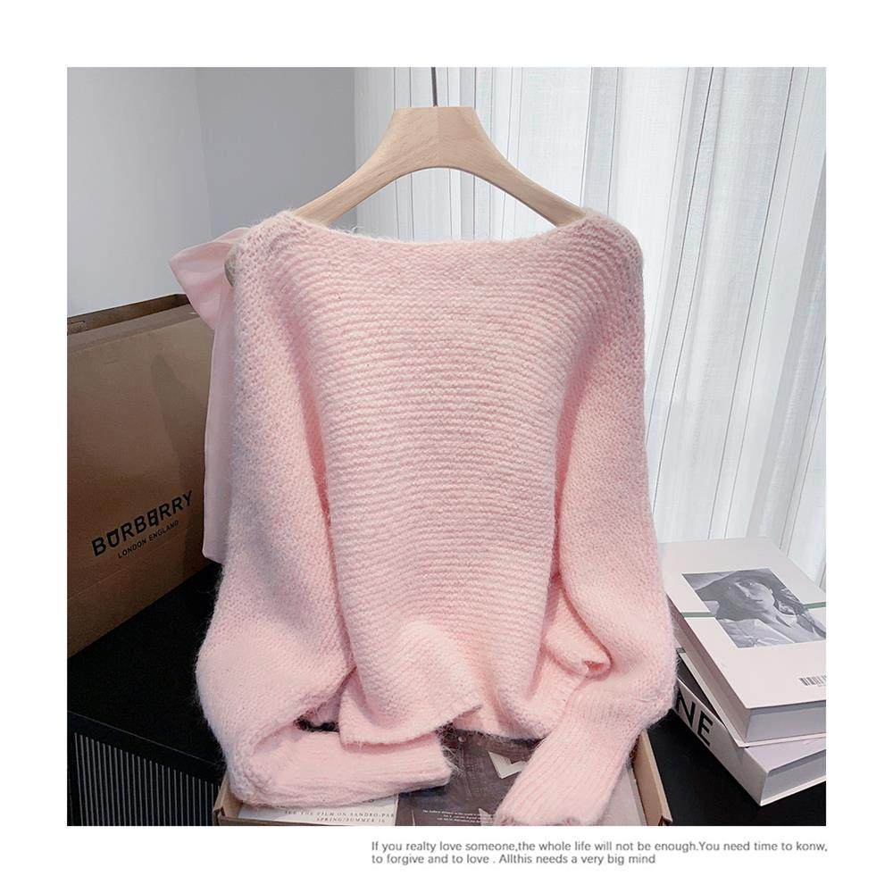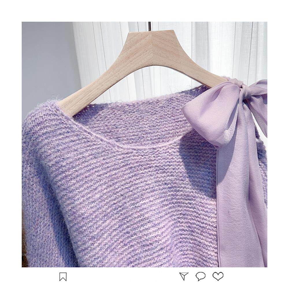 法式甜美蝴蝶結設計感蝙蝠袖毛衣秋冬新款軟糯寬鬆短款漂亮上衣女