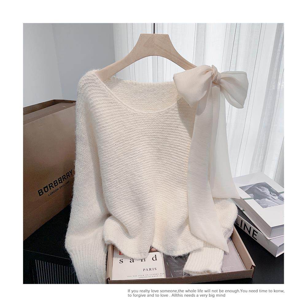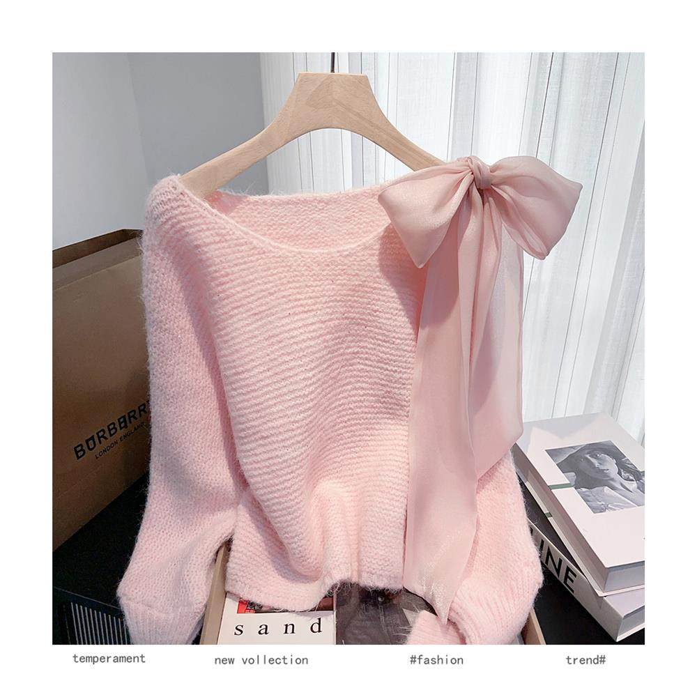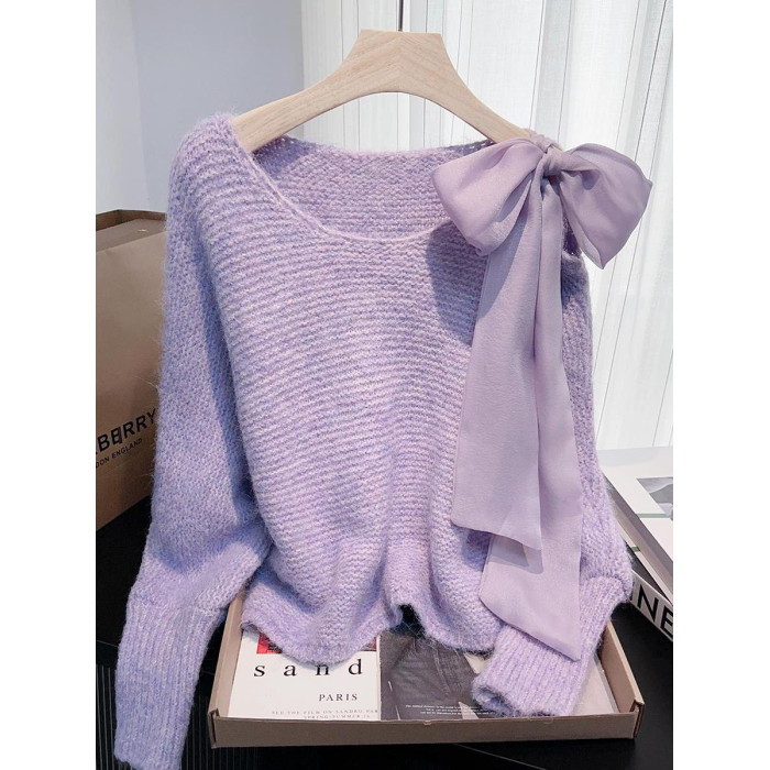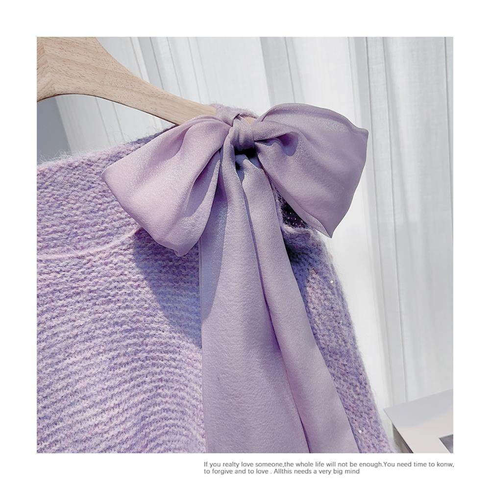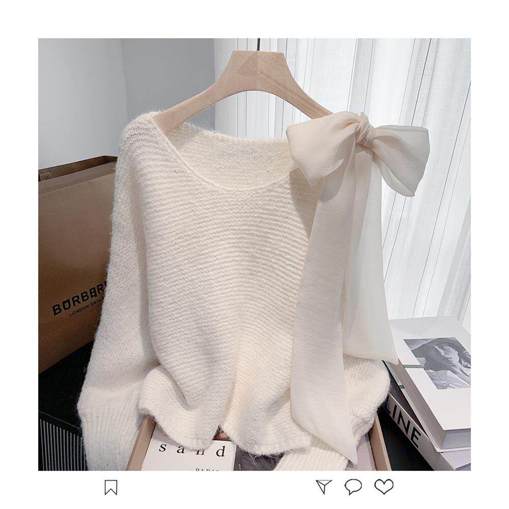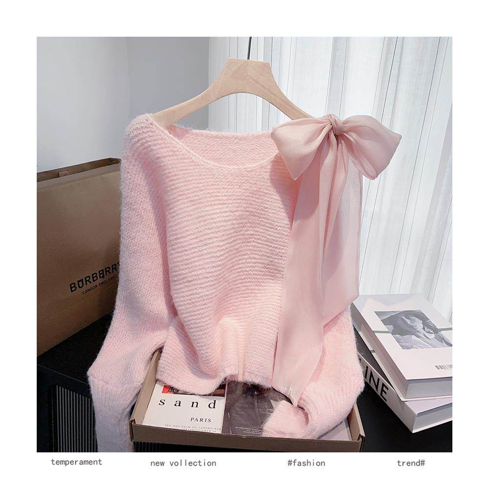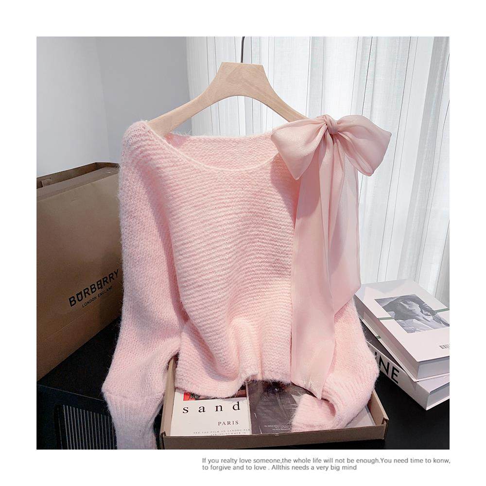 法式甜美蝴蝶結設計感蝙蝠袖毛衣秋冬新款軟糯寬鬆短款漂亮上衣女