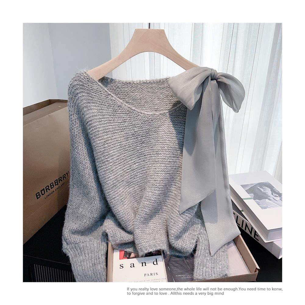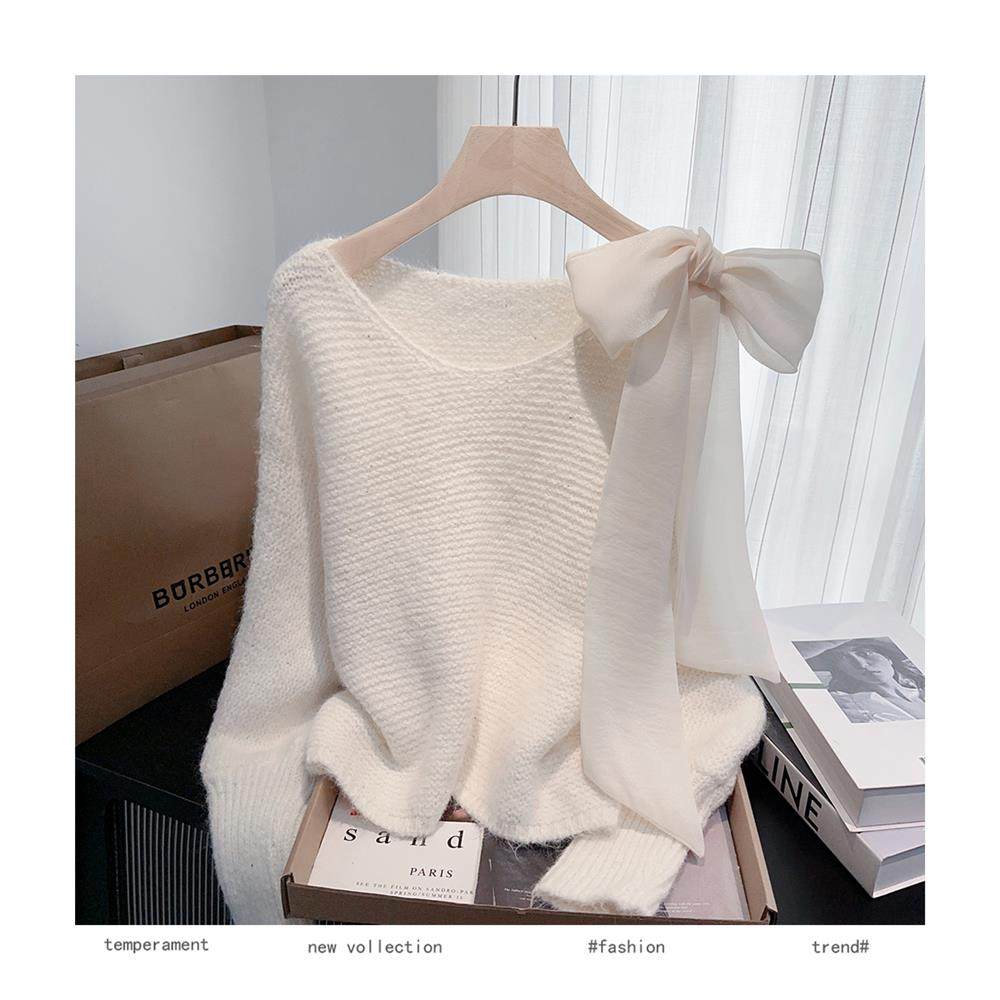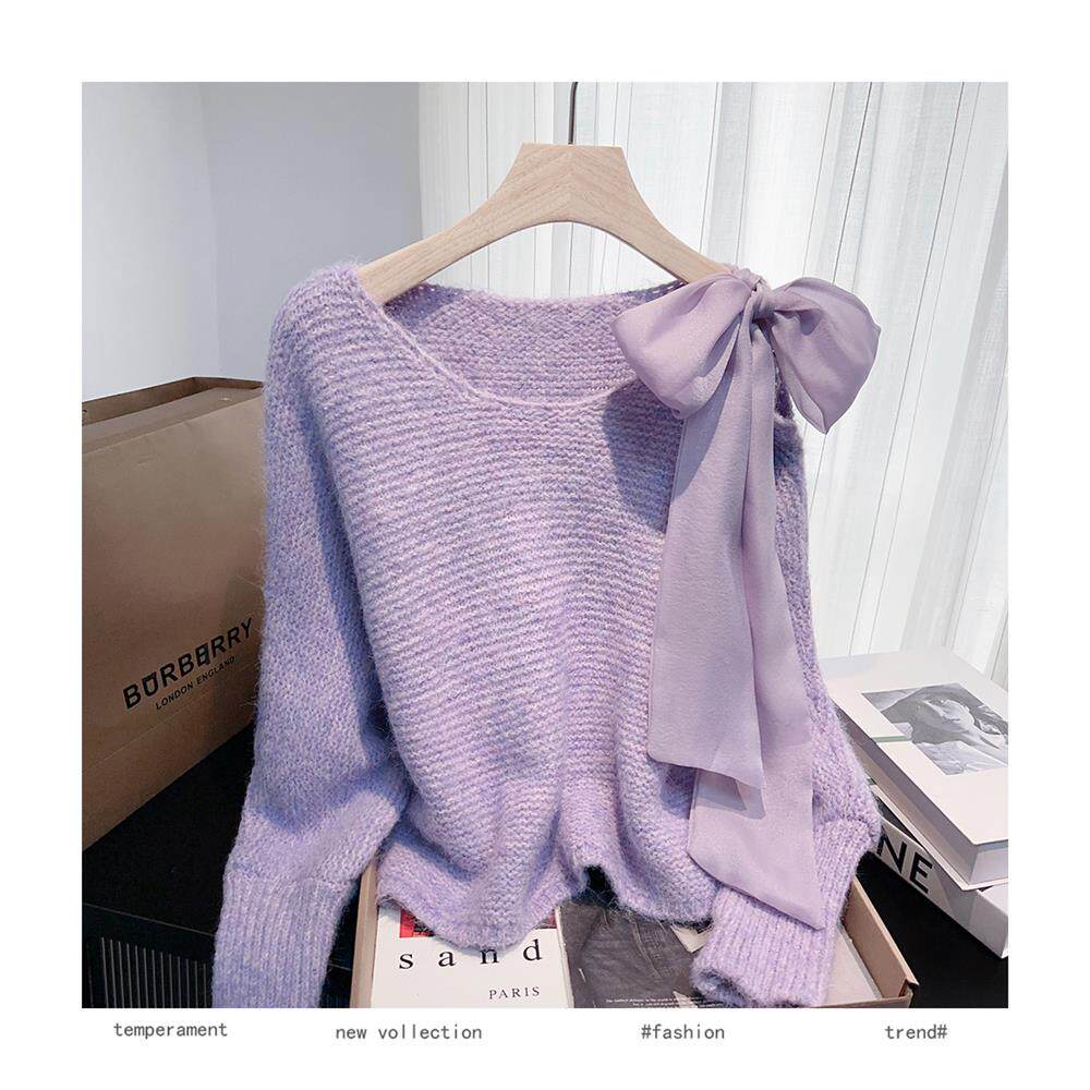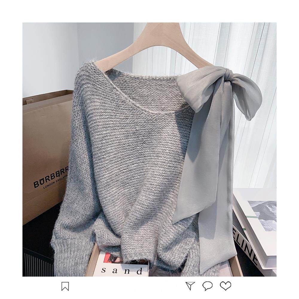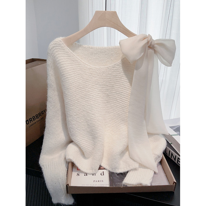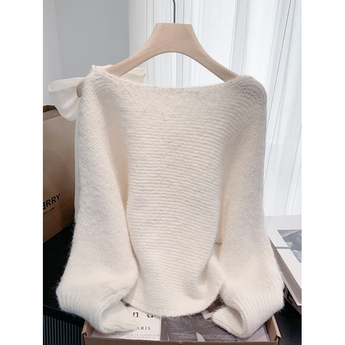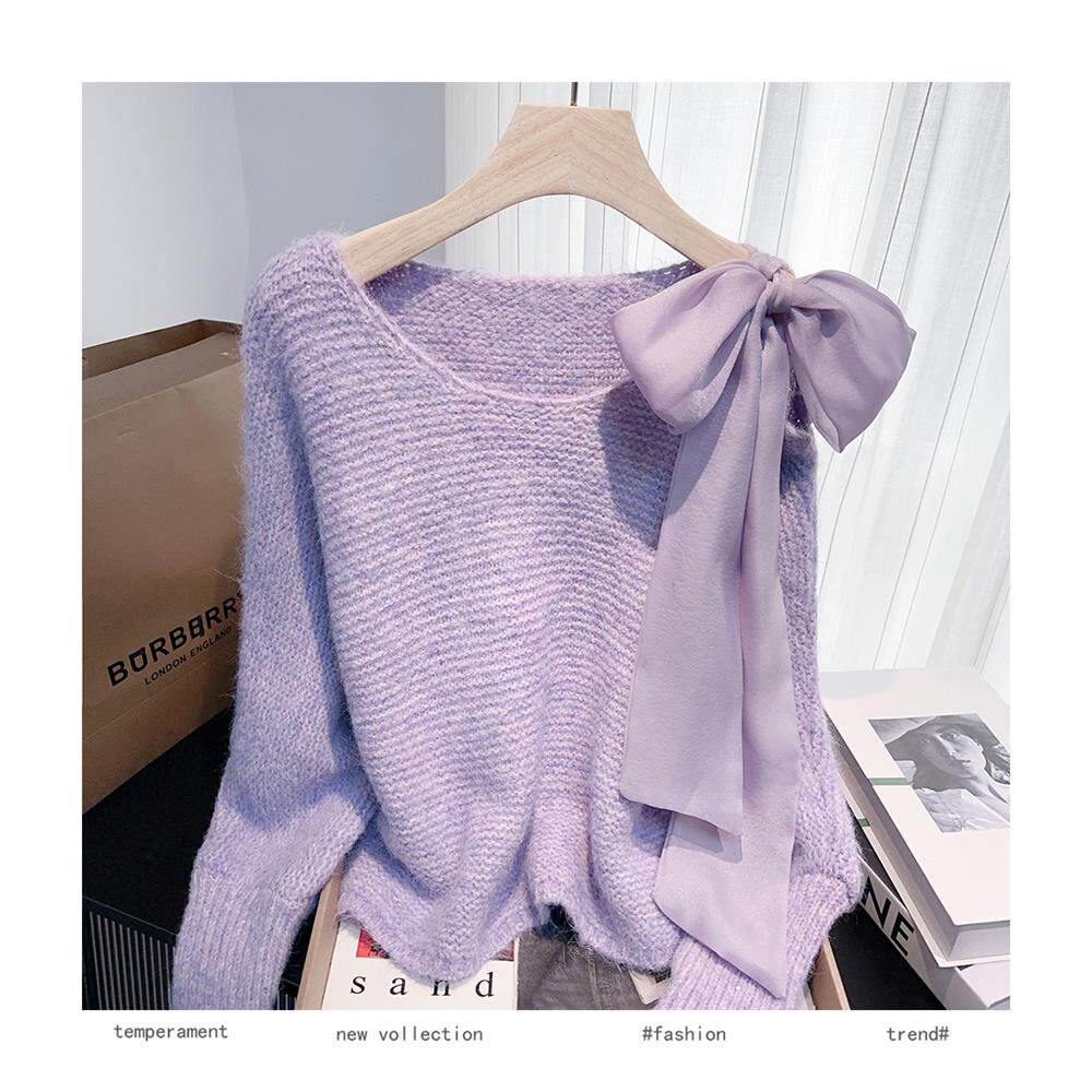 法式甜美蝴蝶結設計感蝙蝠袖毛衣秋冬新款軟糯寬鬆短款漂亮上衣女