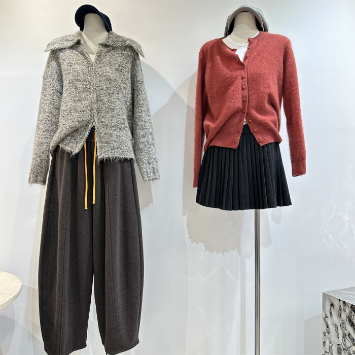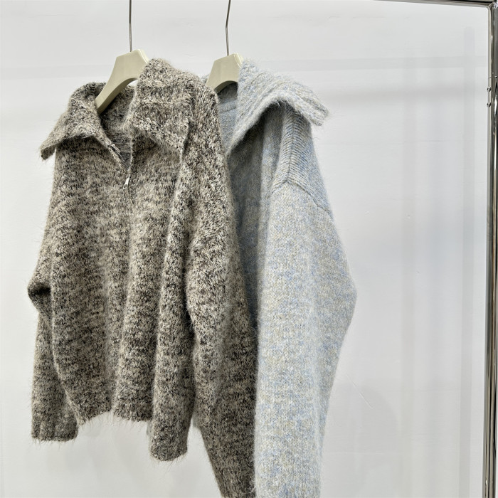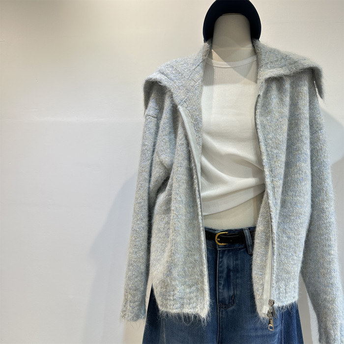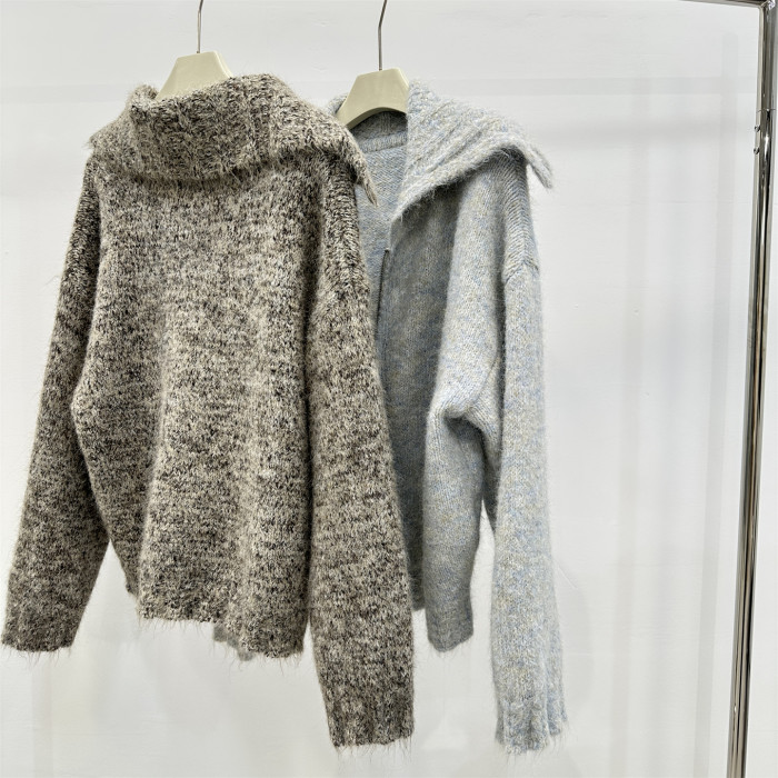 雜色復古大翻領軟糯拉毛毛衣女寬松雙拉鍊加厚針織開衫短外套秋冬