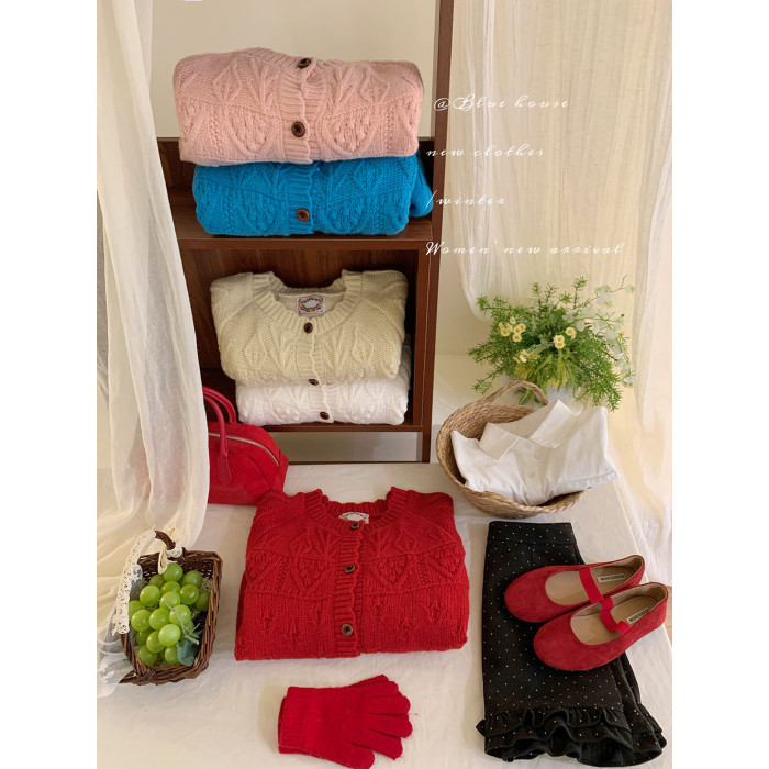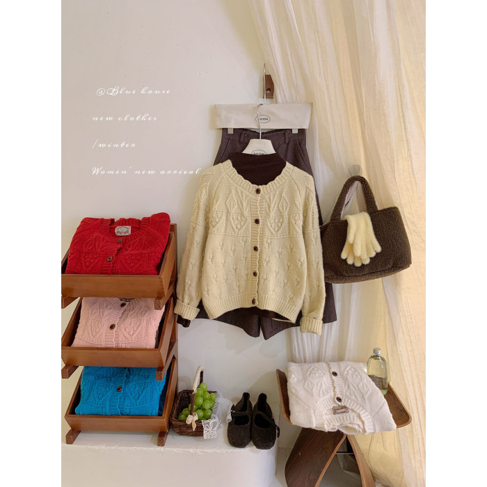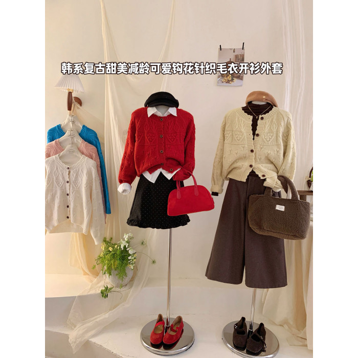 復古鉤花圓領花邊毛衣外套女秋冬韓日系寬松甜美小衆溫柔針織開衫